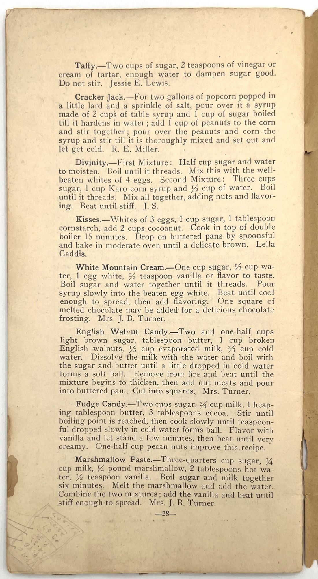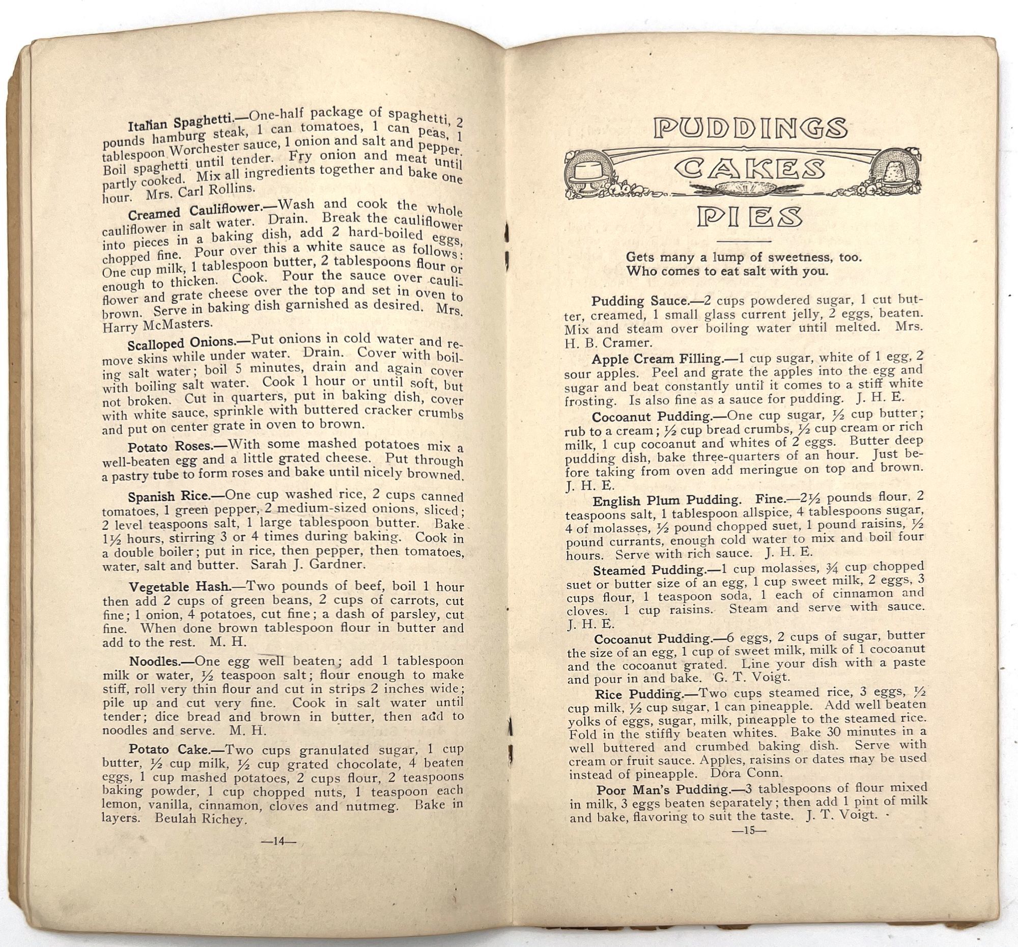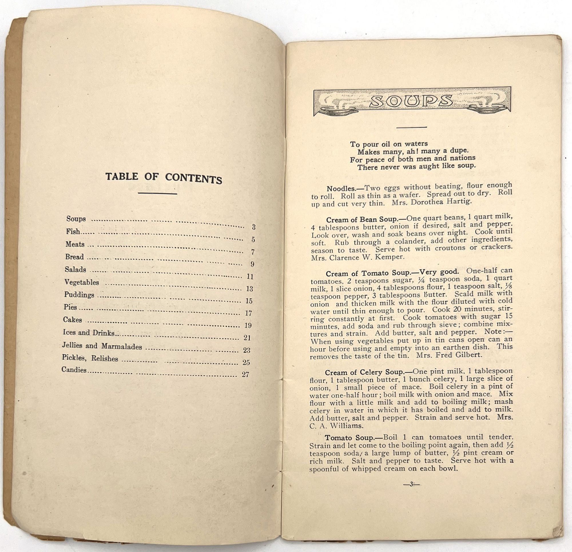 East Liberty (Pittsburgh), Pennsylvania: Womans Missionary Society of the Lincoln Avenue United Presbyterian Church, 1917. Good. Toned with dust soiling, chipping and short tears to wrappers with some loss to foot.. A compilation of recipes by members of the Womans Missionary Society of the Lincoln Avenue United Presbyterian Church in East Liberty, Pennsylvania. Published in 1917, it contains dozens of tried and tested recipes from the members themselves, shared with each other and the community to promote their mission and activities. Some of the recipes are signed, some are not, but all share the same goal of providing housewives with cost-efficient, labor saving, and nutritious meals. Divided into chapters: Soups, Fish, Meats, Bread, Salads, Vegetables, Puddings, Pies, Cakes, Ices and Drinks, Jellies and Marmalades, Pickles and Relishes, and Candies. Includes advertisements throughout from local businesses. Single vol. (9.25" by 5"), pp. 28, in original illus. textured orange paper wrps. The Womans Missionary Society of the Lincoln Avenue United Presbyterian Church appears to have been founded in the 1910s and operated into at least the 1930s.