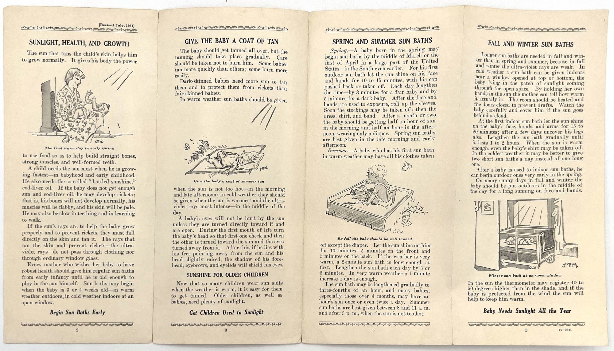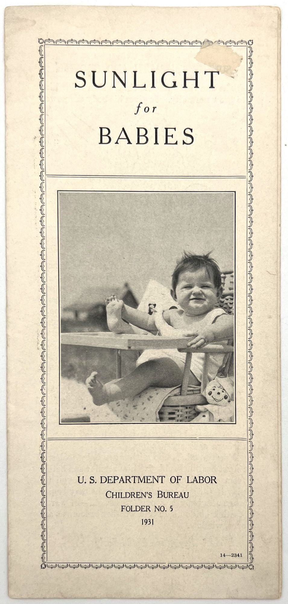 "Sunlight for Babies". Washington, D.C.: U.S. Dept. of Labor, Children's Bureau, 1931. Folding pamphlet (8.75" by 4" folded), photo illus. Explains the importance of year-round "sun baths" to avoid rickets and how cod liver oil can also serve as a supplement.
