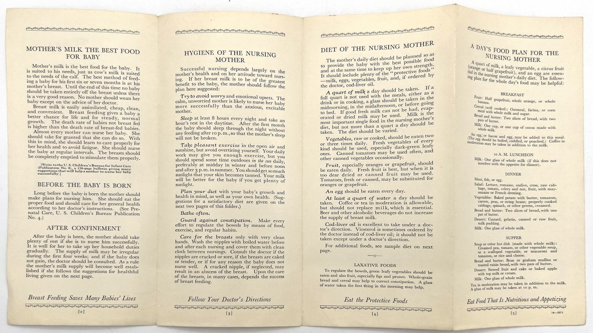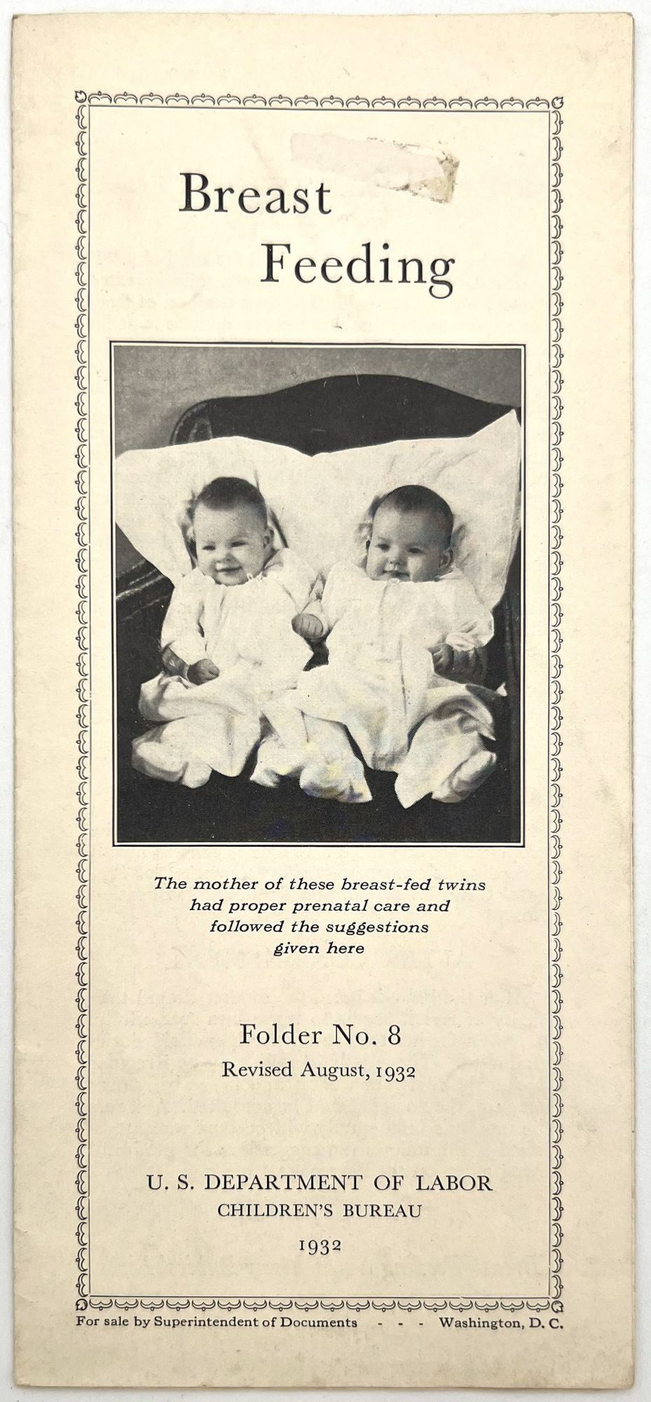 "Breast Feeding". Washington, D.C.: U.S. Dept. of Labor, Children's Bureau, 1931. Folding pamphlet (8.75" by 4" folded), photo illus. Offers advice for how to breast feed, hygiene and nutrition for mother (including meal planning/a sample day's menu), and weaning.