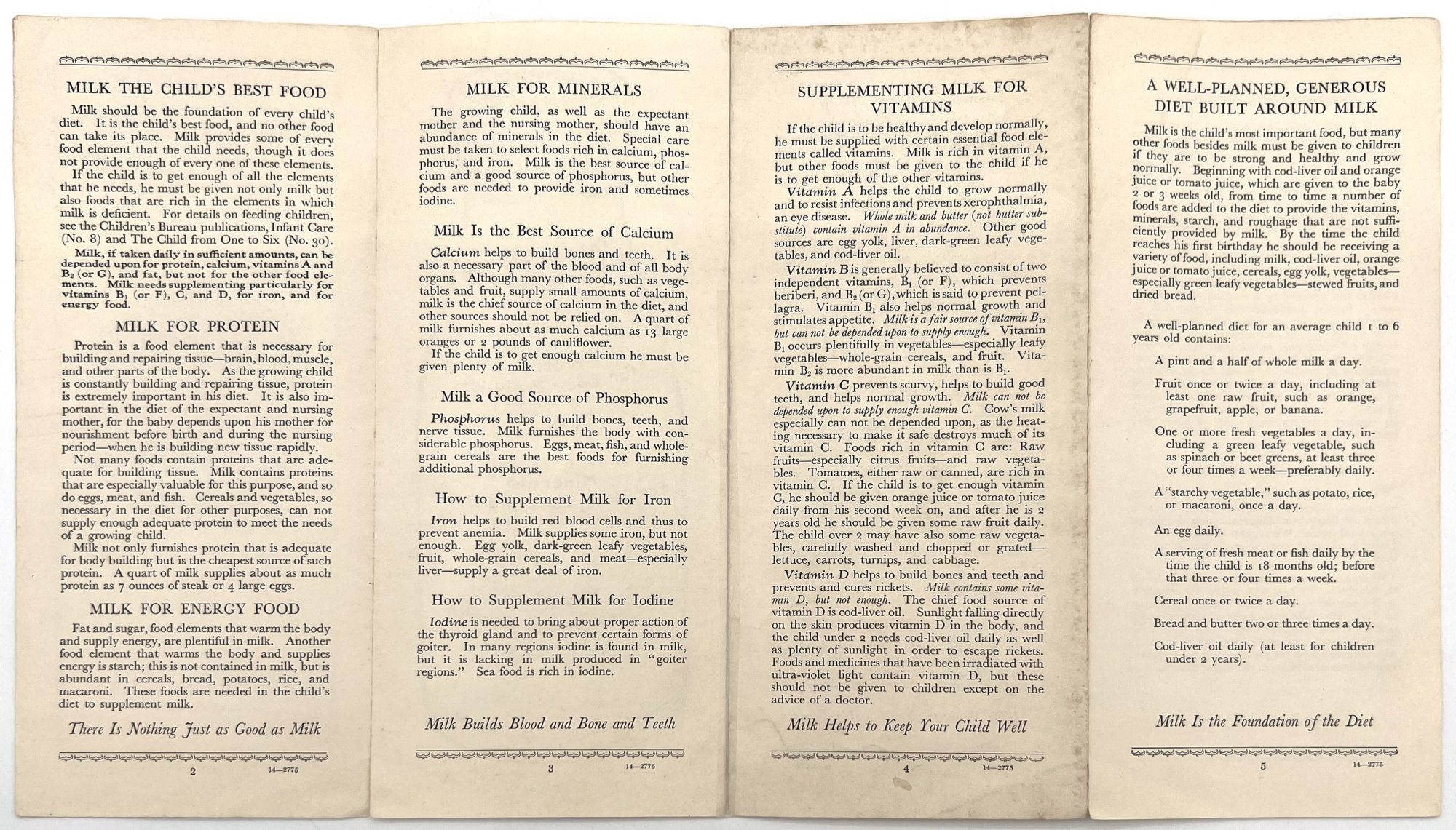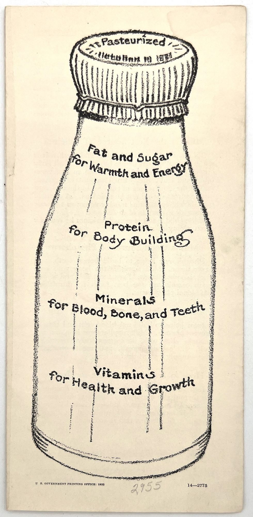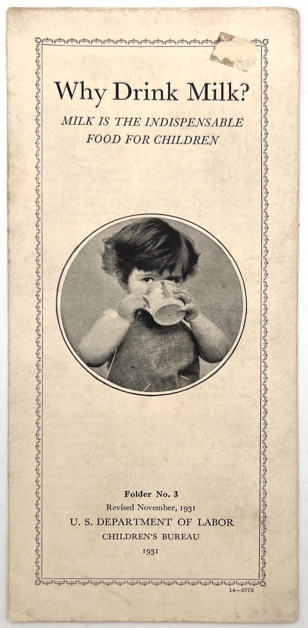 "Why Drink Milk?" Washington, D.C.: U.S. Dept. of Labor, Children's Bureau, 1931. Folding pamphlet (8.75" by 4" folded), photo illus. Nutrition advice highlighting the benefits of dairy in a young child's diet.