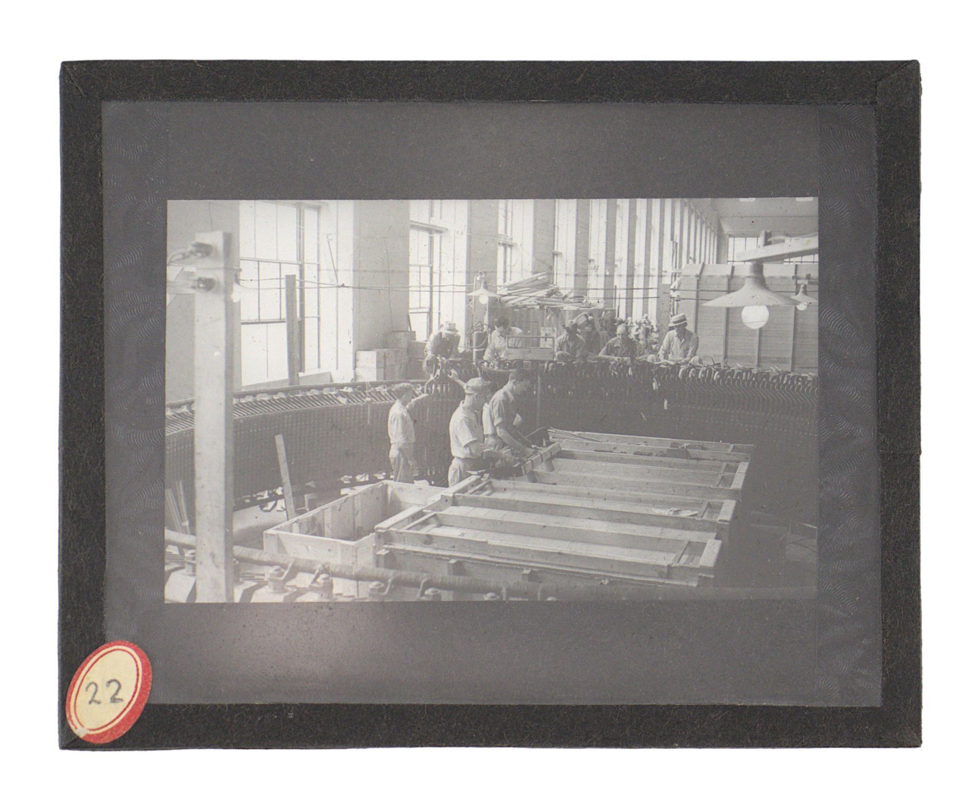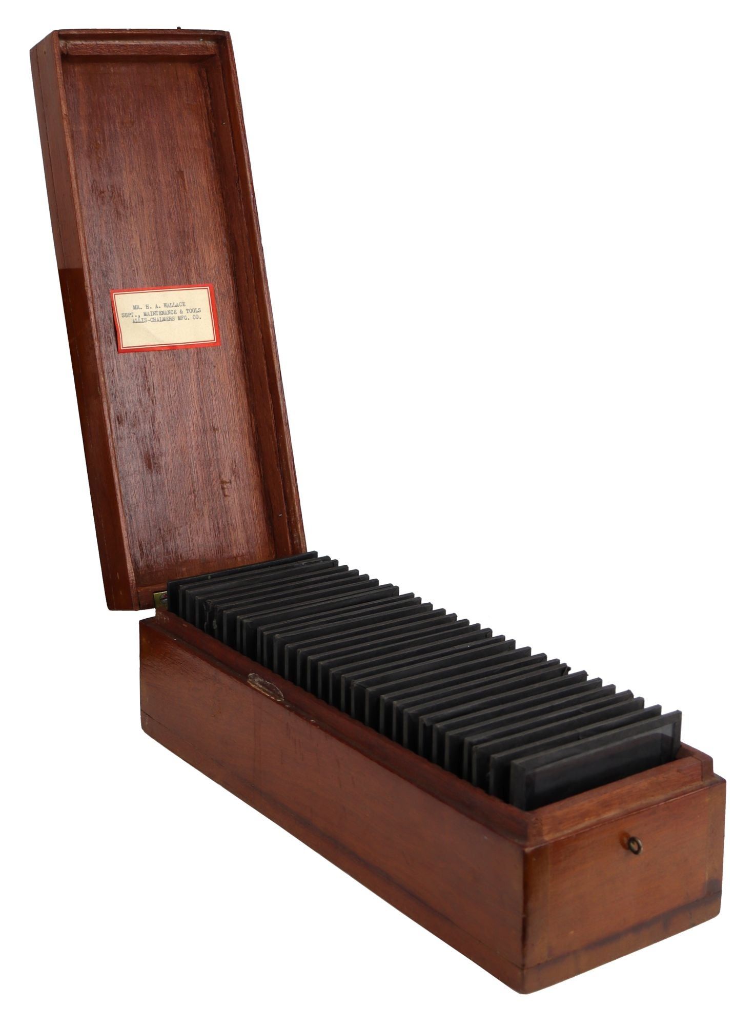 Boulder City, NV, 1940. Very Good. [Boulder City, NV]: [1940]. Collection of thirty glass slides (slides measure 8x10cm.; images measure 4.5x6cm.); housed in original wooden lidded and clasped box (34.5x12.5x10.5cm.). Five of the plates show hairline cracks, one plate with crack crudely repaired with old tape, else an excellent collection, all images bright and easily discernible.