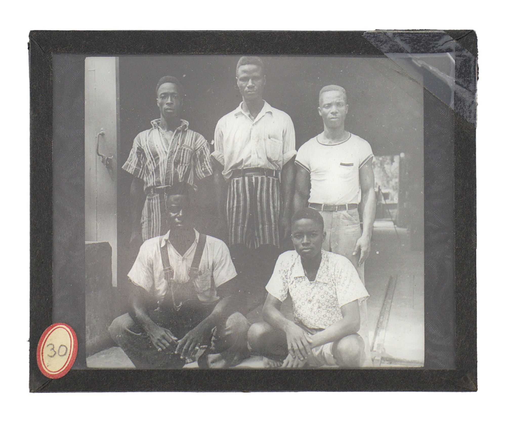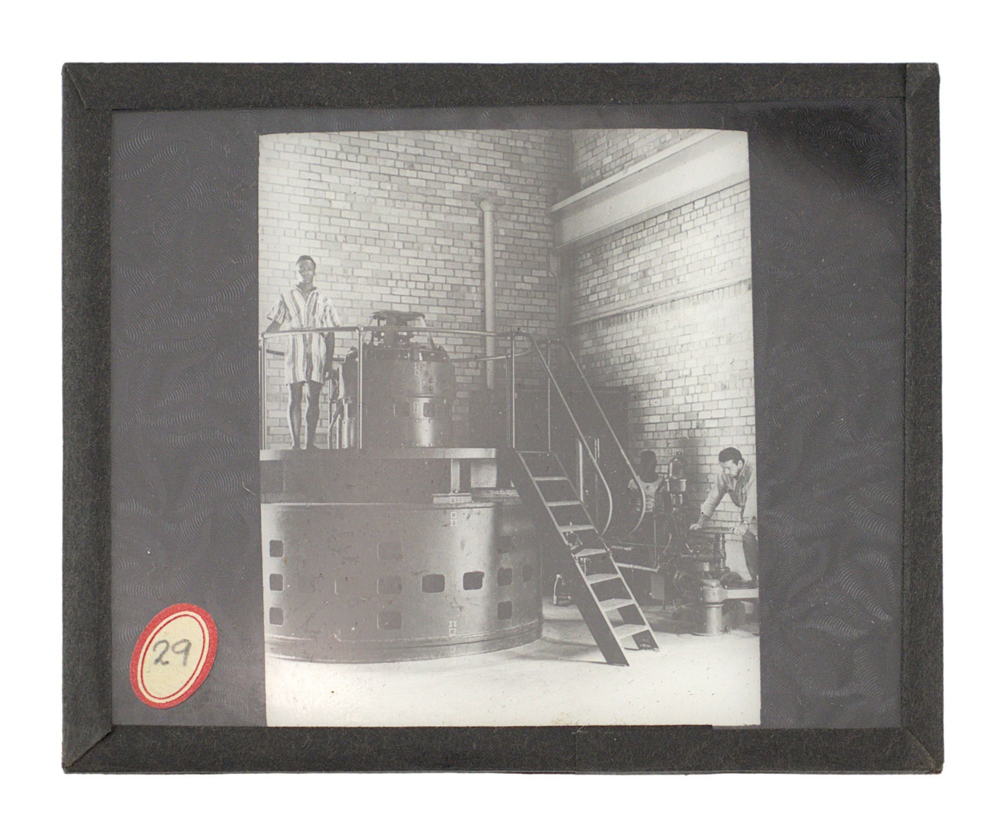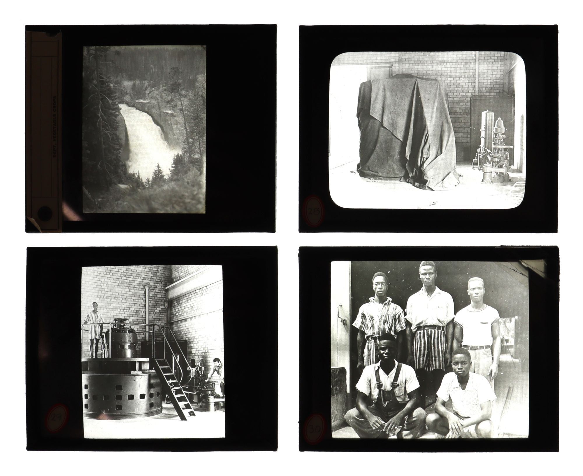 The images depict the different projects worked on by the Allis-Chalmers Company, including the Hoover Dam, the Cheoah Dam in North Carolina, and the Wilson Dam in Alabama. Photographs were taken from various vantage points including external views and internal views. Five of the views show construction, five show pieces of machinery, sometimes still wrapped in sheets. Notably, seven of the images show members of the workforce, including an image of one of the Allis-Chalmers turbines manned by three men, two of them Black. The only group shot of workers, image no. 30, shows five Black men in shorts and shirtsleeves posing for the camera. All the images are numbered, though the collection appears to be lacking image no. 14, replaced instead by a view of the Colorado River. Only image no. 8 is entirely out of place, showing a man (maybe Wallace himself?) posing on a street in France in front of the storefront of Charles Maltais (meubles, tapis, prelarts).