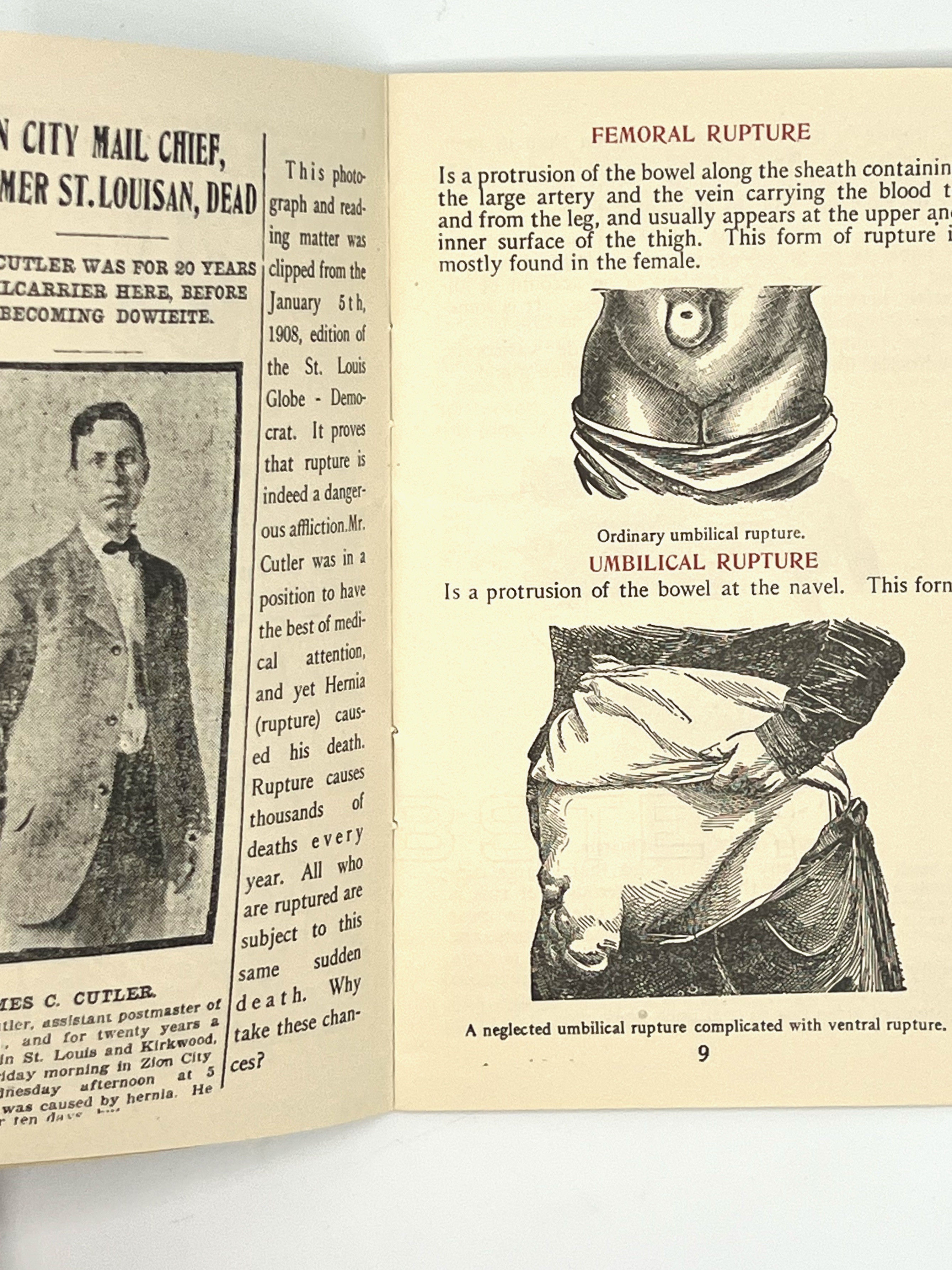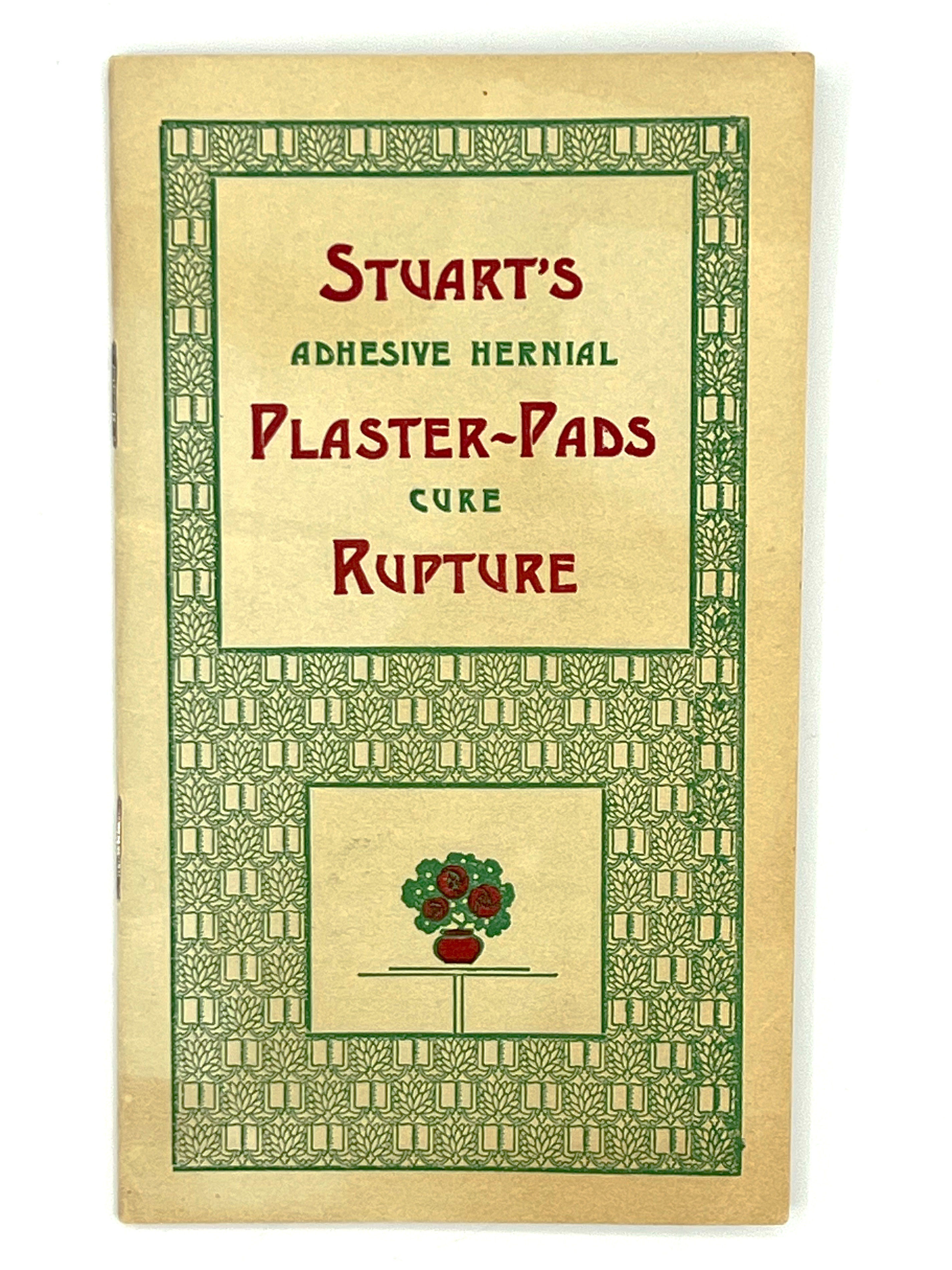 St. Louis: Stuart Plaster-Pad Co., c.1908. Staplebound. Color illustrated wraps. Fine. 32 pages. This company, Stuart's, gave an extensive treatise on every type of hernia, and all the complications that come with this ailment in this pamphlet. Illustrated throughout, the company proclaimed to cure all hernias with their Plaster-Pads. In 1910, the company was taken to court under the Food and Drugs Act for shipping a product that was false and misleading. Although this was false advertising at its best, the production of this pamphlet is beyond reproach. Light toning to rear cover, otherwise pristine.