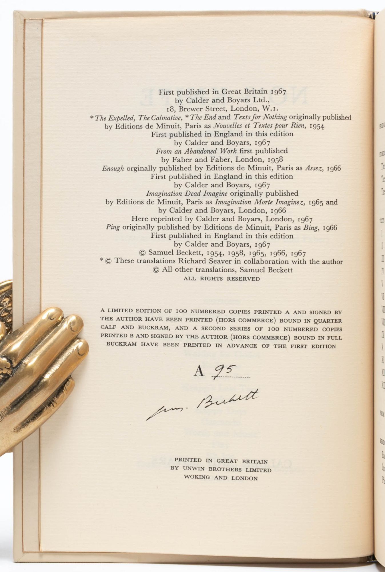 The publisher's preface explains that "This volume contains all Samuel Beckett's miscellaneous texts, the entirety of his short prose that he is willing to have published at the present," from the 1945 story "L'Expulse" (here published in English as "The Expelled") to his 1966 piece "Enough." The other pieces collected here are "The Calmative," "The End," the ten-thirteen part "Texts for Nothing," "From an Abandoned Work," and a few short "residua." Two of these residua, "Imagination Dead Imagine" and "Ping," appear here for the first time in English. Fine in Near Fine dust jacket.