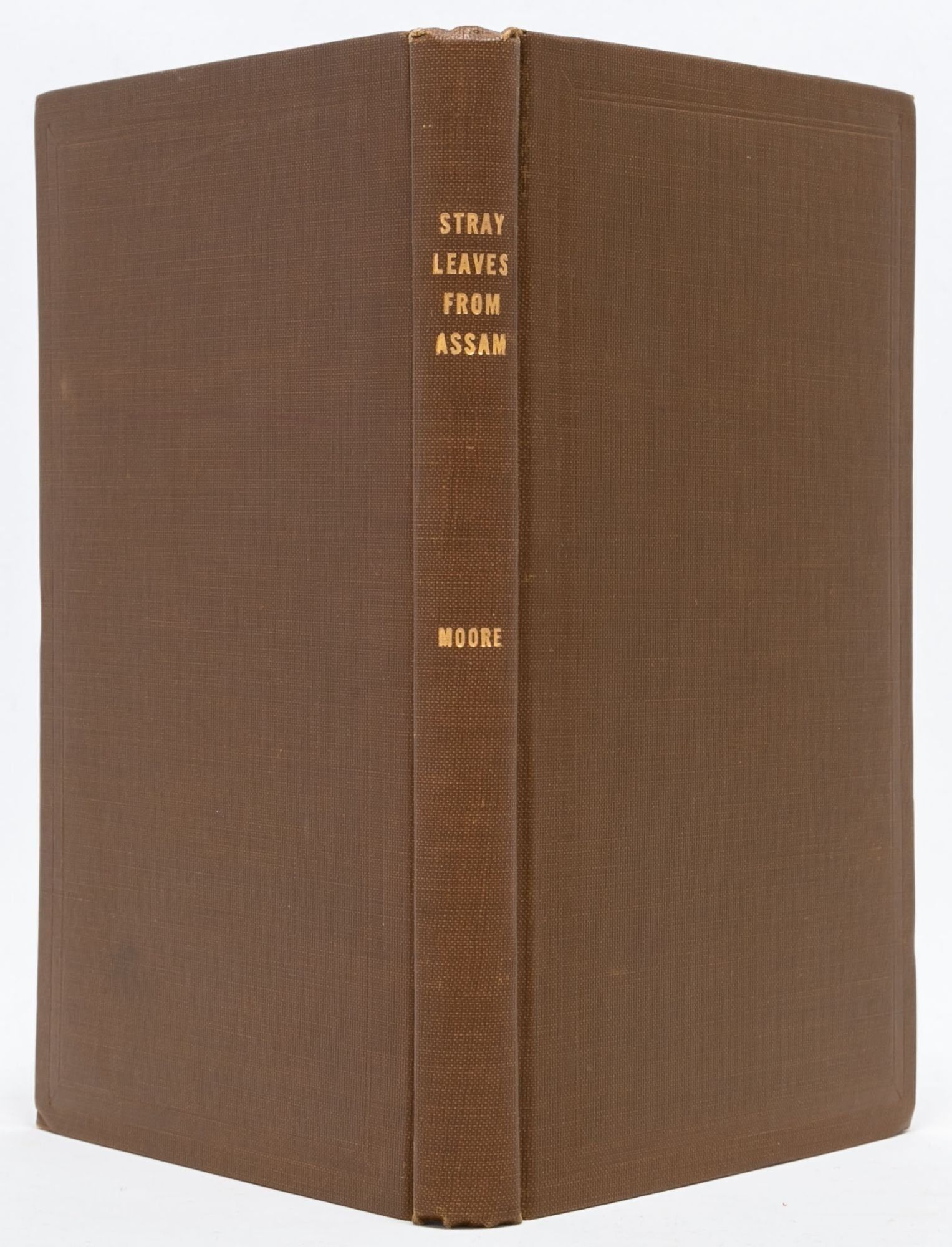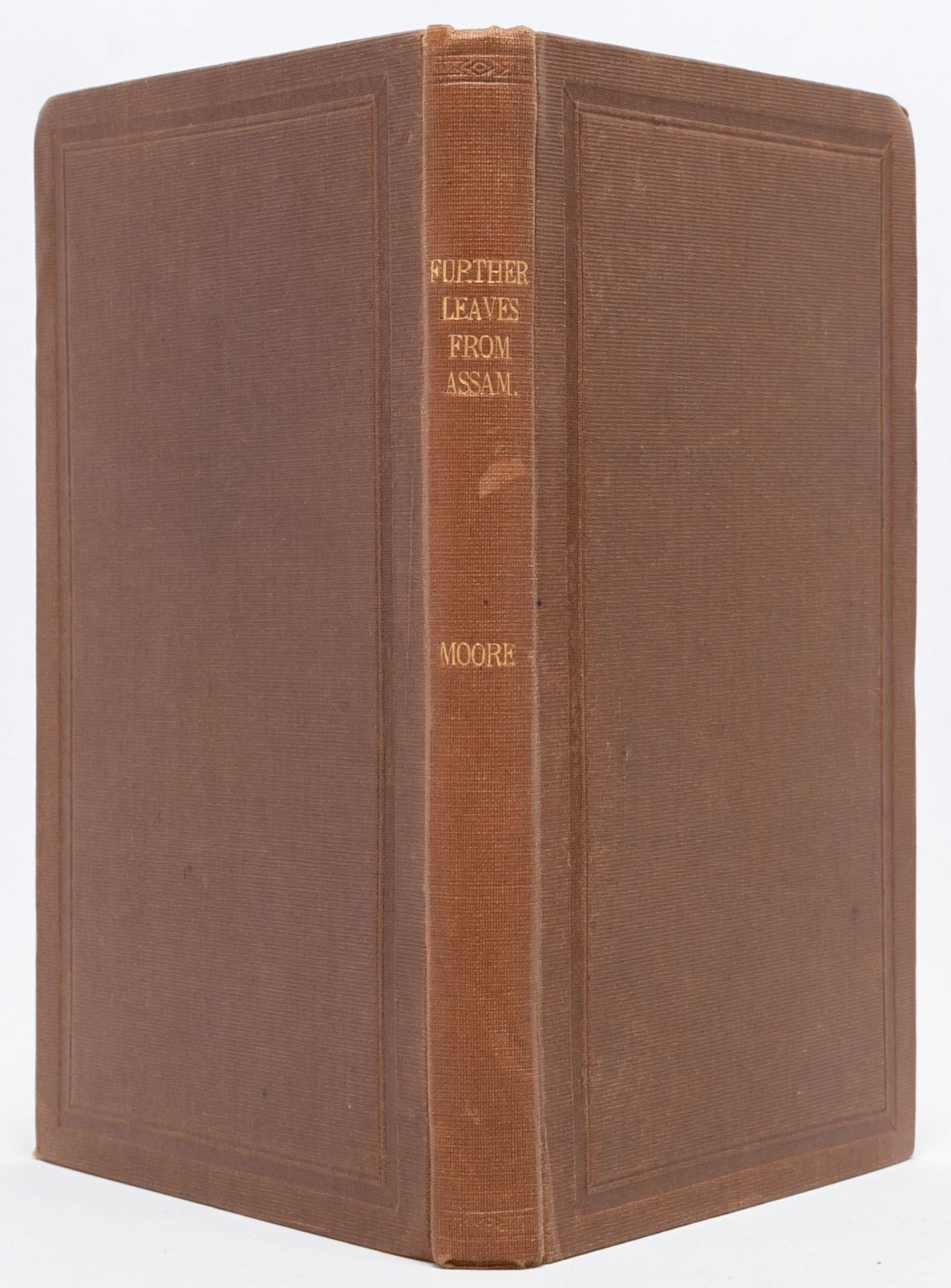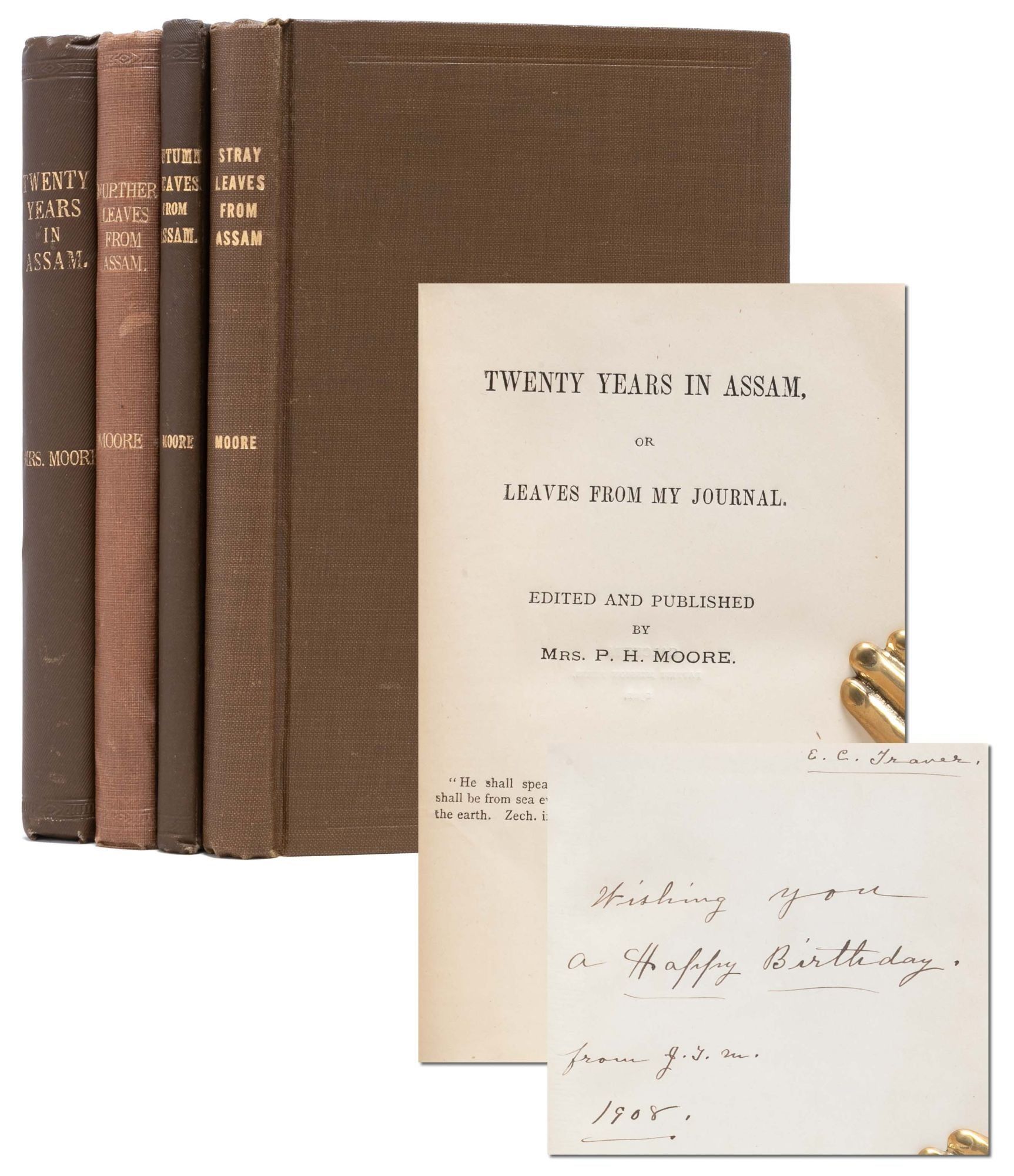 Titles as follows: Twenty Years in Assam, or Leaves from my Journal (1901); Further Leaves from Assam (1907), inscribed by Jessie Traver Moore to her father, E.C. Traver: "Wishing you a Happy Birthday, from J.T.M. 1908," with occasional ink marginalia making corrections to spelling; Autumn Leaves from Assam (1910); and Stray Leaves from Assam (1916), with frontisportrait of the author's late husband.