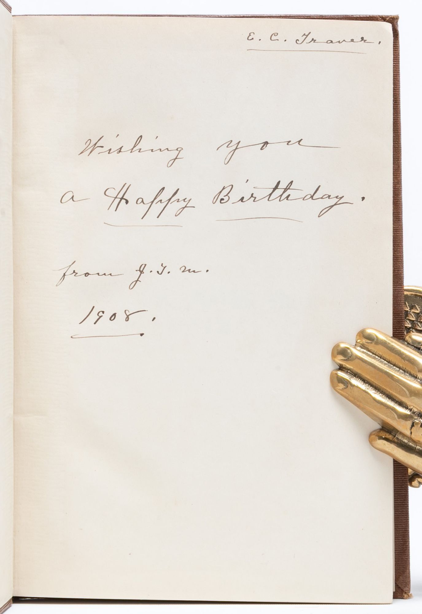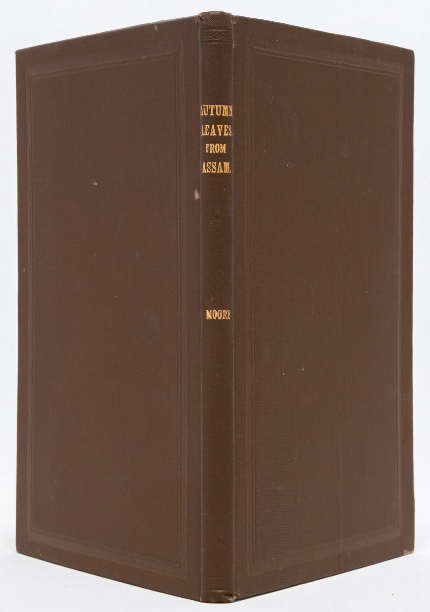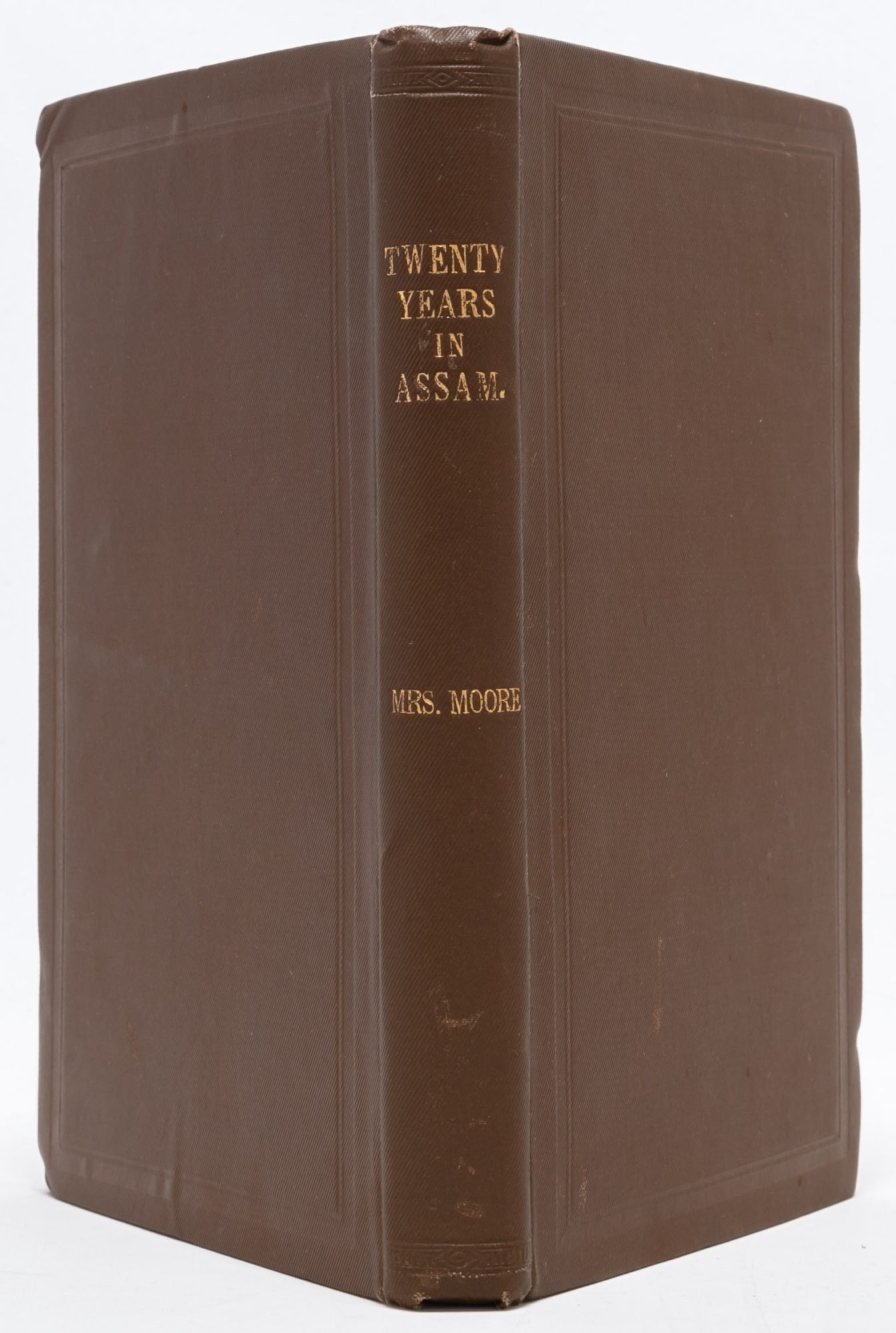 Titles as follows: Twenty Years in Assam, or Leaves from my Journal (1901); Further Leaves from Assam (1907), inscribed by Jessie Traver Moore to her father, E.C. Traver: "Wishing you a Happy Birthday, from J.T.M. 1908," with occasional ink marginalia making corrections to spelling; Autumn Leaves from Assam (1910); and Stray Leaves from Assam (1916), with frontisportrait of the author's late husband.