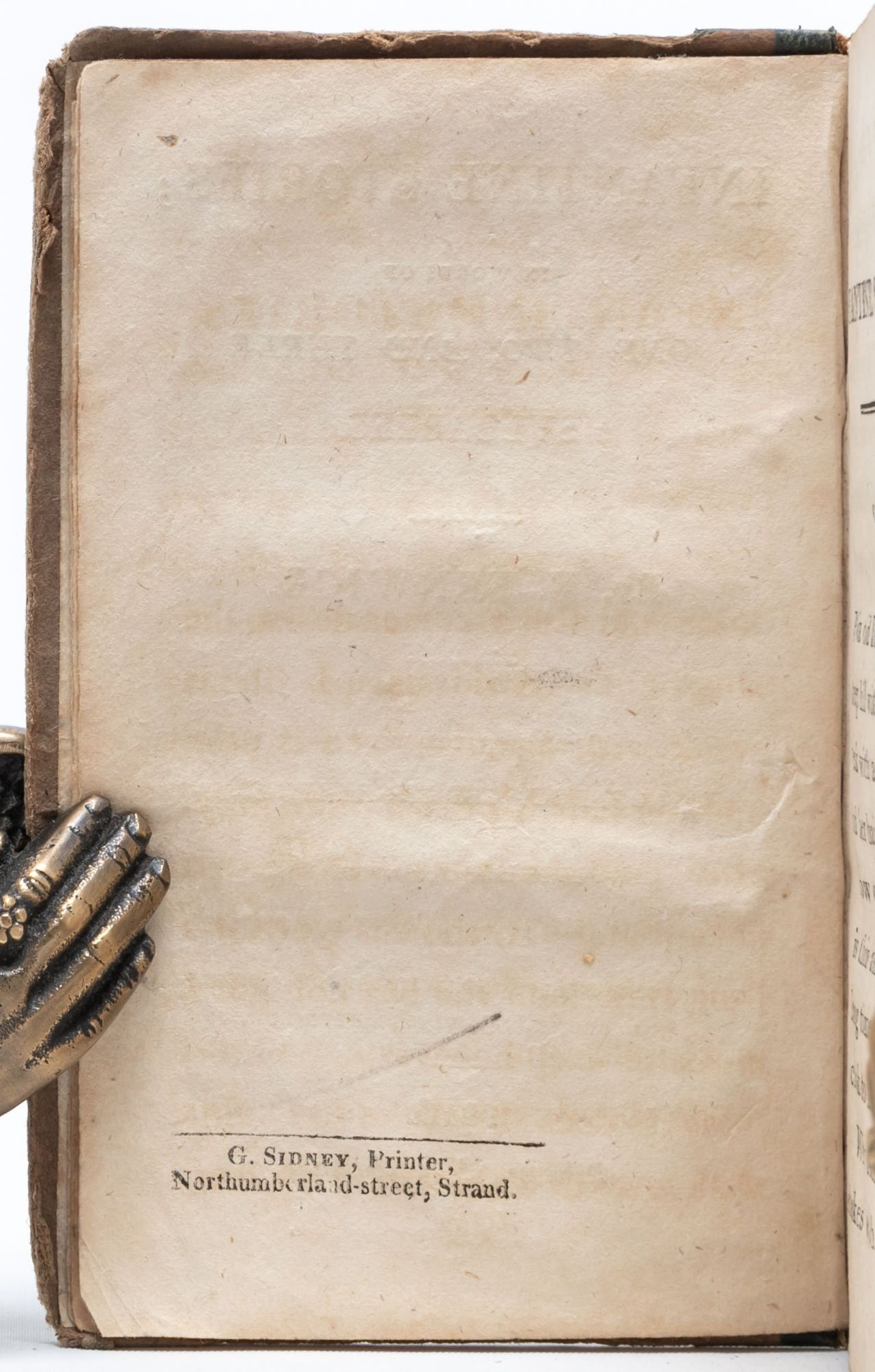 Eliza Fenwick (1766 - 1840) wrote several of these books between 1804 and 1805, and Infantine Stories seems to be the last entry she wrote for the Library. These didactic stories ("The Ball Dress," "The Frenchman," "The Deaf and Dumb Boy," etc.) utilize simple words, with any multisyllable words broken up with hyphens to simplify their reading.
