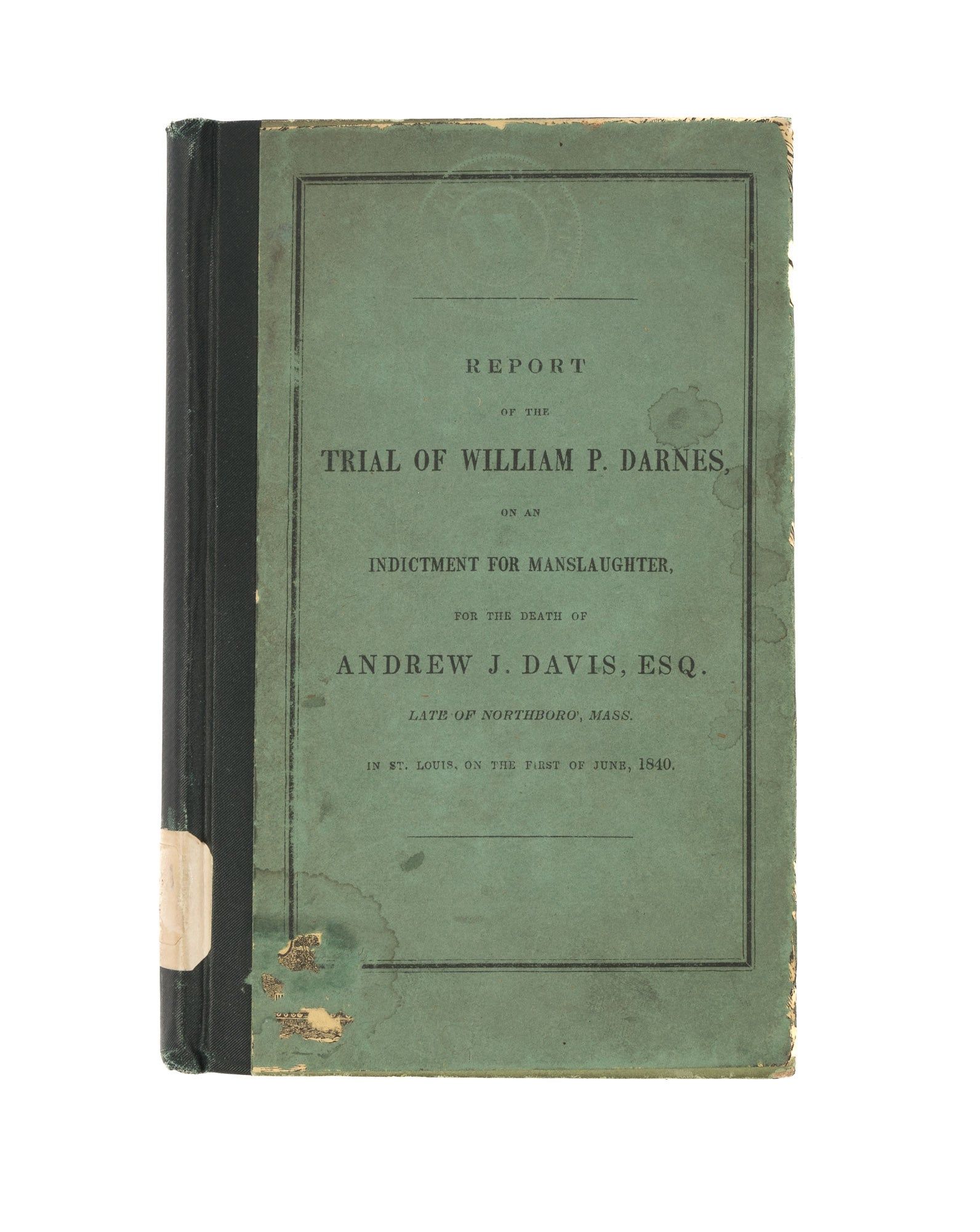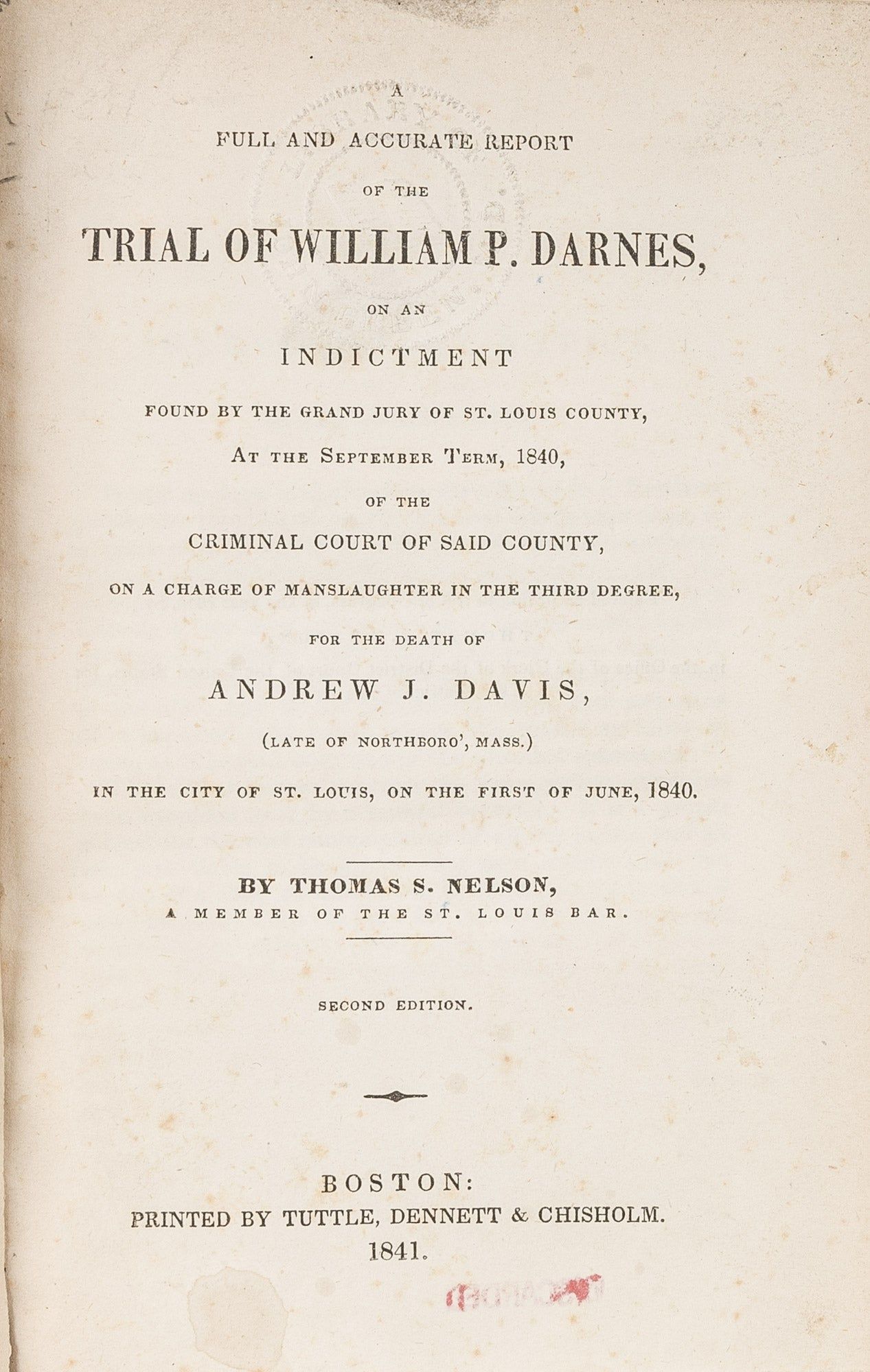 1841. From the Library of a Notable Worcester Doctor and Bibliophile [Trial]. Darnes, William P., Defendant. Nelson, Thomas S., Reporter. A Full and Accurate Report of the Trial of William P. Darnes, On an Indictment Found by the Grand Jury of St. Louis County, At the September Term, 1840, Of the Criminal Court of Said County, On a Charge of Manslaughter in the Third Degree, For the Death of Andrew J. Davis, (Late of Northboro', Mass.) In the City of St. Louis, On the First of June, 1840. Boston: Printed by Tuttle, Dennett & Chisholm, 1841. 269 pp. 12mo. (7-3/4" x 5"). Stab-stitched pamphlet bound into later quarter cloth, front and rear wrappers of pamphlet affixed to front and rear boards, library shelf label to foot of spine. Light rubbing, soiling and a few minor stains to boards, moderate rubbing to extremities with some wear to spine ends, corners, and foot of front board, hinges cracked, front free endpaper detached. Light toning to interior, light spotting in places, tiny stain and embossed owner stamp of John Green, M.D. to title page, library discard inkstamp to verso of title page, other embossed Green stamps to front wrapper and rear endleaf. $450. * Second and final edition, one of two issues, both in 1841. Davis was the well-known owner of a St. Louis newspaper that published several highly critical columns about Darnes, an important local politician. Enraged, Darnes attacked Davis on the street with an iron rod, striking him in the head. Davis was rushed to a hospital, but died a few days later. Darnes was indicted. The trial lasted two weeks and engaged some of the best lawyers and medical experts in the area. The case turned on whether Davis died from the blow or his medical treatment. Both sides offered a strong case. In the end Darnes was convicted of fourth-degree manslaughter and fined $500. Our copy belonged to John Green III, MD [1784-1864]. A member of a distinguished Worcester, MA family, Dr. Green was an avid bibliophile and the founder of the Worcester Public Library, to which he donated his personal library of nearly 12,000 titles. This case not in McDade. Stevens, St. Louis, The Fourth City, 1764-1911 I:369-370. Catalogue of the Library of the Harvard Law School (1909) II:1057.