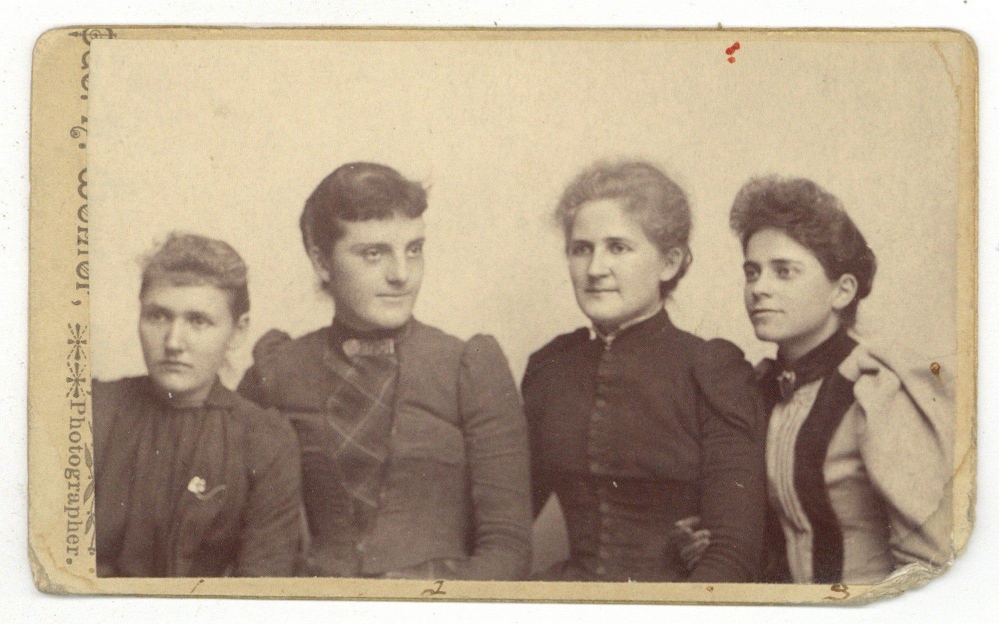 1885. Unbound. Very Good. Gelatin silver photograph. Image size approximately 2.5" x 3.75" on slightly larger card mount. Corner rubbed and rounded, image has been affixed a little crookedly, obscuring the photographers printed name, very good. Four women posed from the waist up. Names of the four women are inked on the verso of the mount, likely in the hand of one of them, Carrie McNair: Edith Talbot, Grace Perly (or Perley), and Lara Whitlock. Preliminary research suggests they might have been students in New England, but is so far inconclusive.