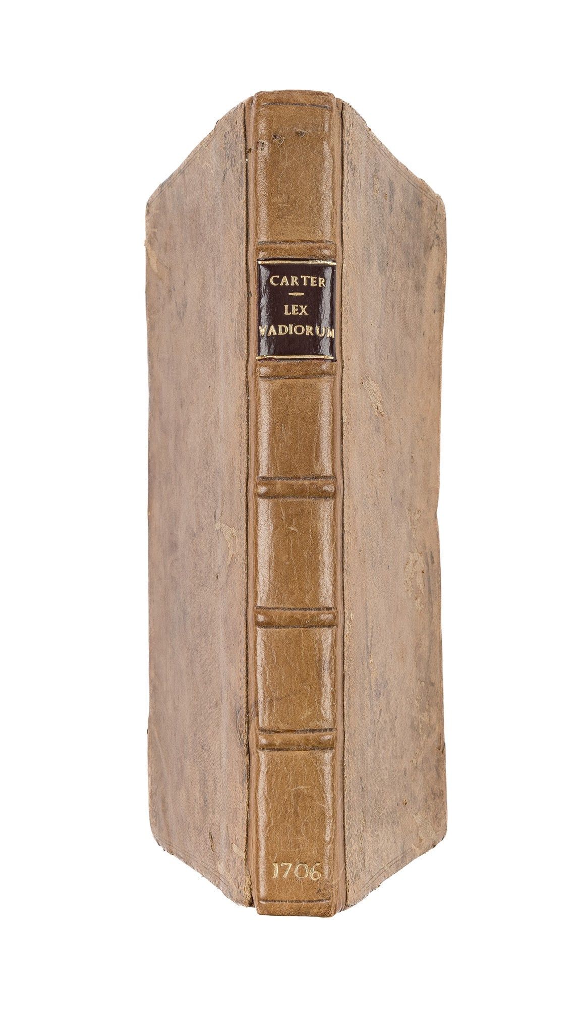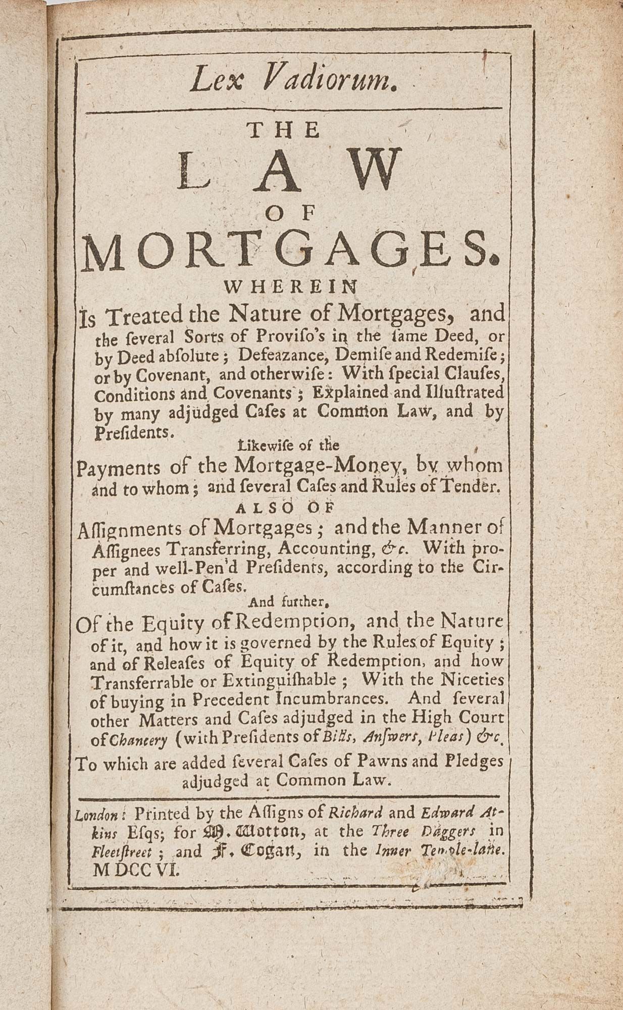 1706. First Edition of the First Treatise on Mortgage at Law and in Equity [Carter, Samuel]. Lex Vadiorum. The Law of Mortgages. Wherein is Treated the Nature of Mortgages, And the Several Sorts of Proviso's in the Same Deed, Or by Deed Absolute; Defeazance, Demise and Redemise; Or by Covenant, And Otherwise: With Special Clauses, Conditions and Covenants; Explained and Illustrated by Many Adjudged Cases at Common Law, And by Presidents. Likewise of the Payments of the Mortgage-Money, By Whom and to Whom; And Several Cases and Rules of Tender. Also of Assignments of Mortgages; And the Manner of Assignees Transferring, Accounting, &c. With Proper and Well-Pen'd Presidents, According to the Circumstances of Cases. And Further, Of the Equity of Redemption, and the Nature of It, And How it is Governed by the Rules of Equity; And of Releases of Equity of Redemption, And How Transferrable or Extinguishable; With the Niceties of Buying in Precedent Incumbrances. And Several Other Matters and Cases Adjudged in the High Court of Chancery (With Presidents of Bills, Answers, Pleas) &c. To Which are Added Several Cases of Pawns and Pledges Adjudged at Common Law. London: Printed by the Assigns of Richard and Edward Atkins Esqs; For M. Wotton, At the Three Daggers in Fleetstreet; And F. Cogan, In the Inner Temple-Lane, 1706. [xvi], 223, [25] pp. Contemporary sheep, rebacked in period-style calf. Blind rules to boards, blind fillets along joints, raised bands, blind rules and lettering piece to spine, corners and hinges mended. Light rubbing and a few minor stains and scuffs to boards, moderate rubbing to board edges. Light toning to interior, faint spotting in a few places, small faint dampstains to rear endleaves. $850. * First edition. Carter was the author of two notable treatises: The Infants Lawyer (1697), the first English treatise on laws concerning infants, and Lex Custumaria, Or, A Treatise of Copy-Hold Estates (1696). Lex Vadiorum is a treatise on mortgages at law and in equity. According to Holdsworth, it was the "first attempt to write a book on this topic." OCLC locates 5 copies in North America, 1 in a law library (Library of Congress). Holdsworth, A History of English Law XII:382. English Short-Title Catalogue N3662.