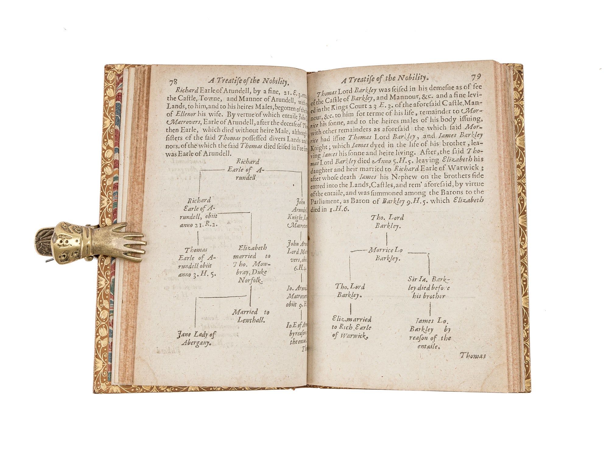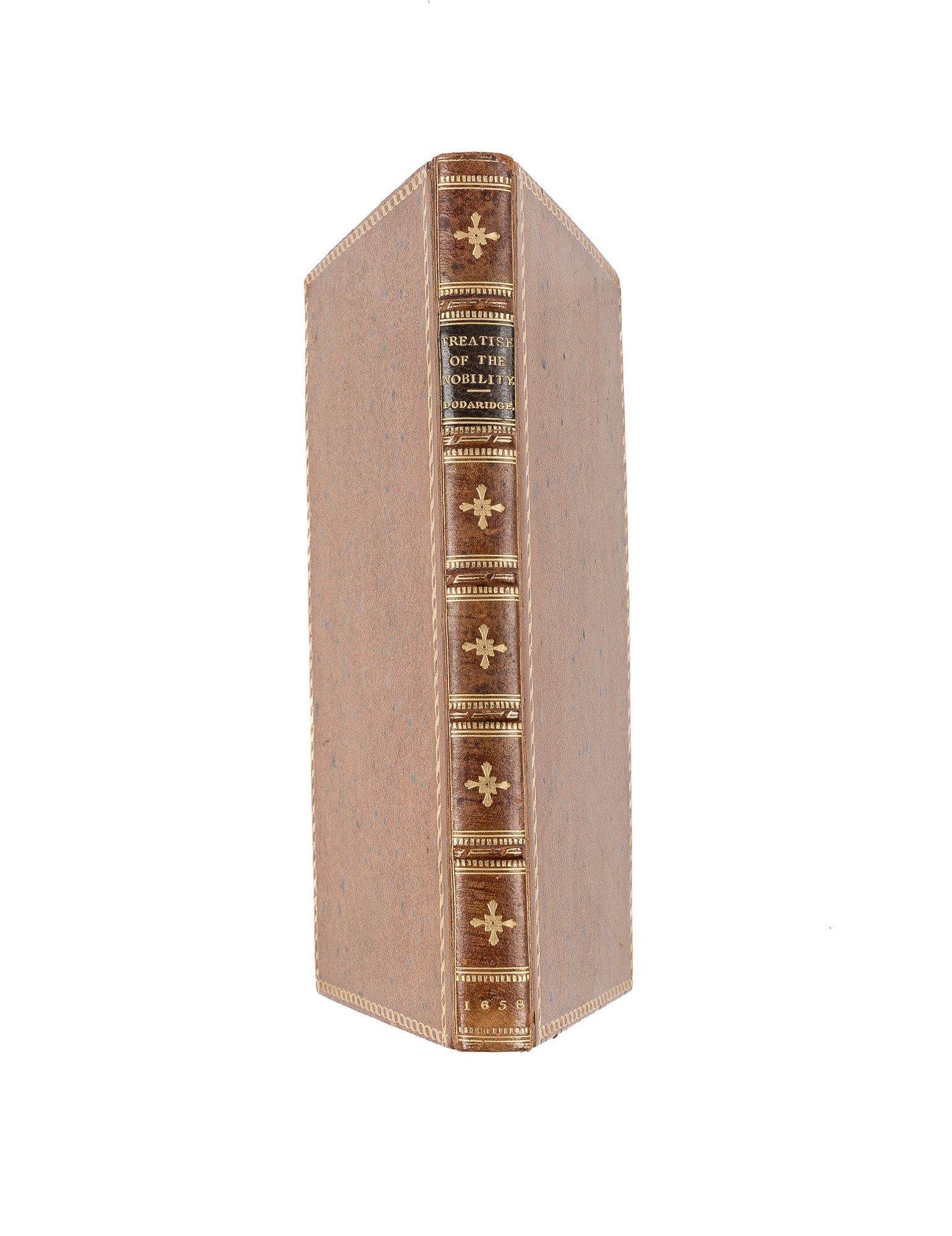 1658. London: Printed for L. Chapman, 1658.. London: Printed for L. Chapman, 1658. A Notably Handsome Copy [Bird, William]. Judge Dodaridge, His Law of Nobility and Peerage. Wherein the Antiquities, Titles, Degrees, And Distinctions; Concerning the Peeres and Nobility of this Nation, Are Excellently Set Forth. With the Knights, Esquires, Gentlemen, And Yeomen; And Matters Incident to Them, According to the Lawes and Customes of England. London: Printed for L. Chapman, 1658. [vi], 56, 65-114, 139-170, 105-158 pp. Pagination irregular. Lacking final leaf, a blank. Woodcut text illustrations of genealogical relationships. Octavo (6-1/2" x 4"; 16.5 x 10.15 cm). Nineteenth-century Mansell binding, sprinkled calf, gilt fillets to boards, raised bands, lettering piece and gilt fillets to spine, gilt tooling to board edges, gilt inside dentelles, marbled endpapers. Light rubbing to spine ends and corners, light toning to interior, moderate toning to edges of most leaves, faint dampstaining to lower outside corner of a several leaves near center of text block, headlines of a few leaves affected by trimming (with no loss to legibility). Shelfmark in small early hand to head of title page, early manuscript corrections to numbering of table of contents. A notably handsome copy. $500. * Only edition, a revised and expanded version of Bird's Treatise of the Nobilitie of the Realme (1642). The occasion for this treatise was a contemporary controversy regarding the legitimacy of Edward Nevill's claim to the title of Lord Bergavenny. His claim is the starting point for a general review of peerage law. Another edition, with additions by Sir John Doddridge, was published later in 1642 as The Magazine of Honour; Or, A Treatise of the Severall Degrees of the Nobility of this Kingdome. Bird's 1658 edition draws on this work, which is why its title refers to Dodderidge and "his law." OCLC locates 7 copies in North American law libraries (Columbia, Harvard, Library of Congress, Nova Scotia Legislative Library, University of Cincinnati, University of Minnesota, University of Pennsylvania). English Short-Title Catalogue R11125.