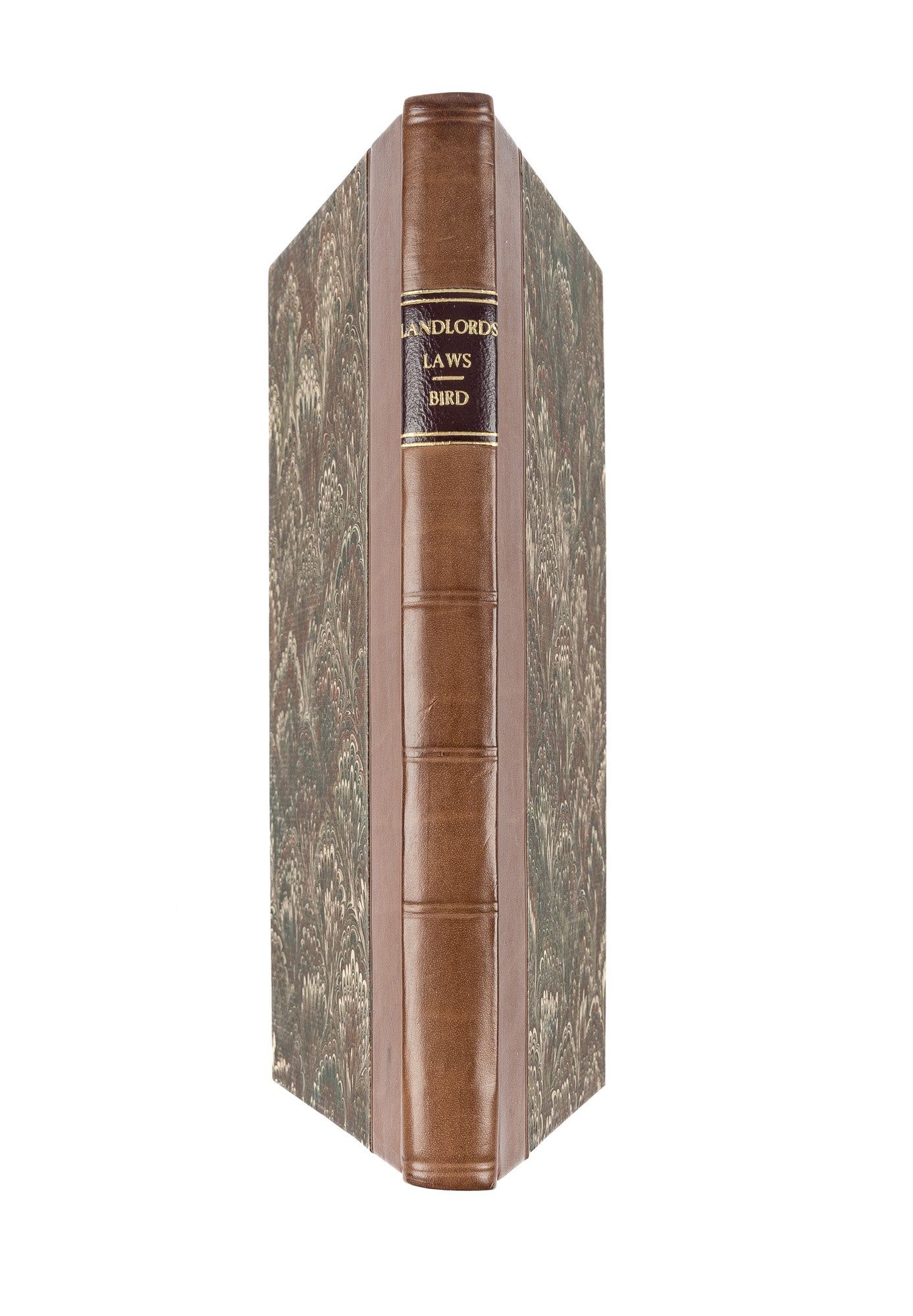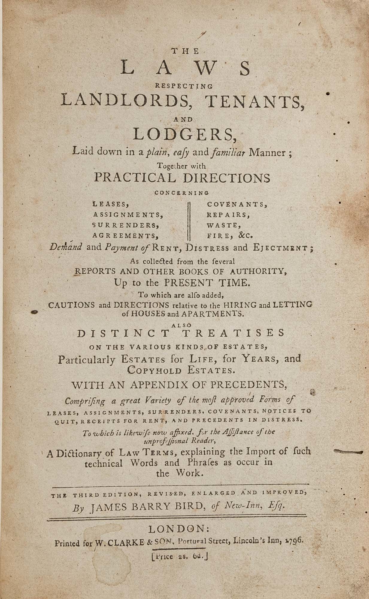 1796. Now Affixed, For the Assistance of the Unprofessional Reader, A Dictionary of Law Terms" Bird, James Barry. The Laws Respecting Landlords, Tenants, And Lodgers, Laid Down in a Plain, Easy and Familiar Manner; Together with Practical Directions Concerning Leases, Assignments, Surrenders, Agreements, Covenants, Repairs, Waste, Fire, &c. Demand and Payment of Rent, Distress and Ejectment; As Collected from the Several Reports and Other Books of Authority, Up to the Present Time. To which are also Added, Cautions and Directions Relative to the Hiring and Letting of Houses and Apartments. Also Distinct Treatises on the Various Kinds of Estates, Particularly Estates for Life, For Years, And Copyhold Estates. With an Appendix of Precedents, Comprising a Great Variety of the Most Approved Forms of Leases, Assignments, Surrenders, Covenants, Notices to Quit, Receipts for Rent, And Precedents in Distress. To Which is Likewise Now Affixed, For the Assistance of the Unprofessional Reader, A Dictionary of Law Terms, Explaining the Import of Such Technical Words and Phrases as Occur in the Work. London: Printed for W. Clarke & Son, 1796. iv, [4], 120, [8] pp. Text followed by 3 pp. publisher catalogue. Octavo (8" x 5"). Recent period-style quarter calf over marbled boards, lettering piece and blind fillets to spine, endpapers renewed. Moderate toning to interior, light wear to corners of text block, light foxing and soiling in places, gradually diminishing worm track near fore-edges of title page and following seven leaves, light soiling and a small dampspot to title page. An attractive copy of a scarce edition. $650. * Third edition. Bird produced a well-regarded series of handbooks on a broad range of legal topics. Written for both "the general reader" and "the young practitioner," according to the first edition's preface, The Laws Respecting Landlords was not an exception and went through many editions. The final edition was published in London in 1833. OCLC locates 6 copies of the third edition, 1 in North America (Huntington Library). English Short-Title Catalogue T68311.