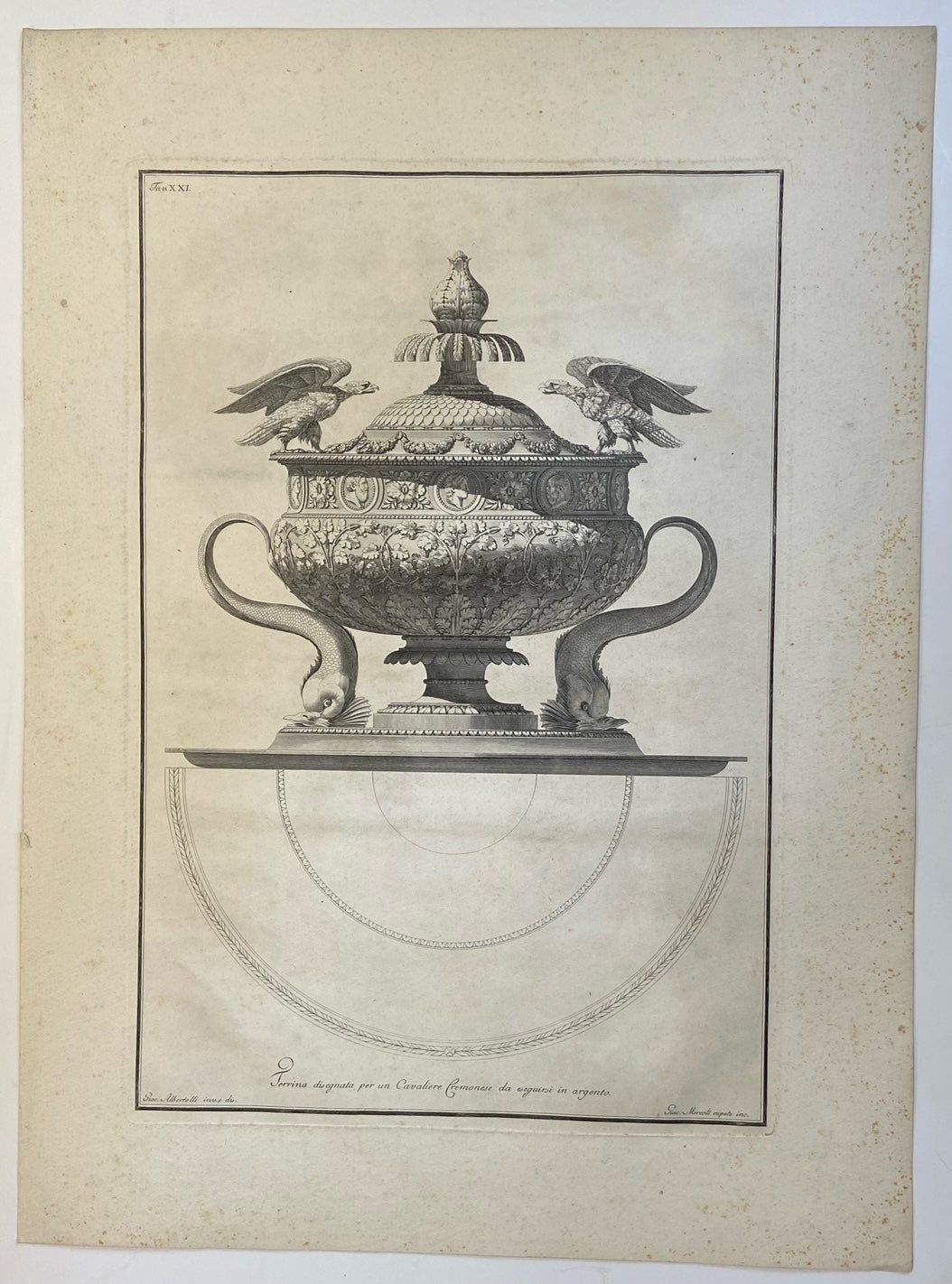 This lovely 18th century etching depicts a tureen designed to be made in silver for a Cremonese Knight. Designed and drawn by Giocondo Albertolli, this print was engraved by Giacomo Mercoli and published in "Ornamenti Diversi inventati disegnati ed eseguiti da Giocondo Albertolli", 1787. This print is in very good condition, with heavy foxing to outer margin at right edge, not affecting the image.