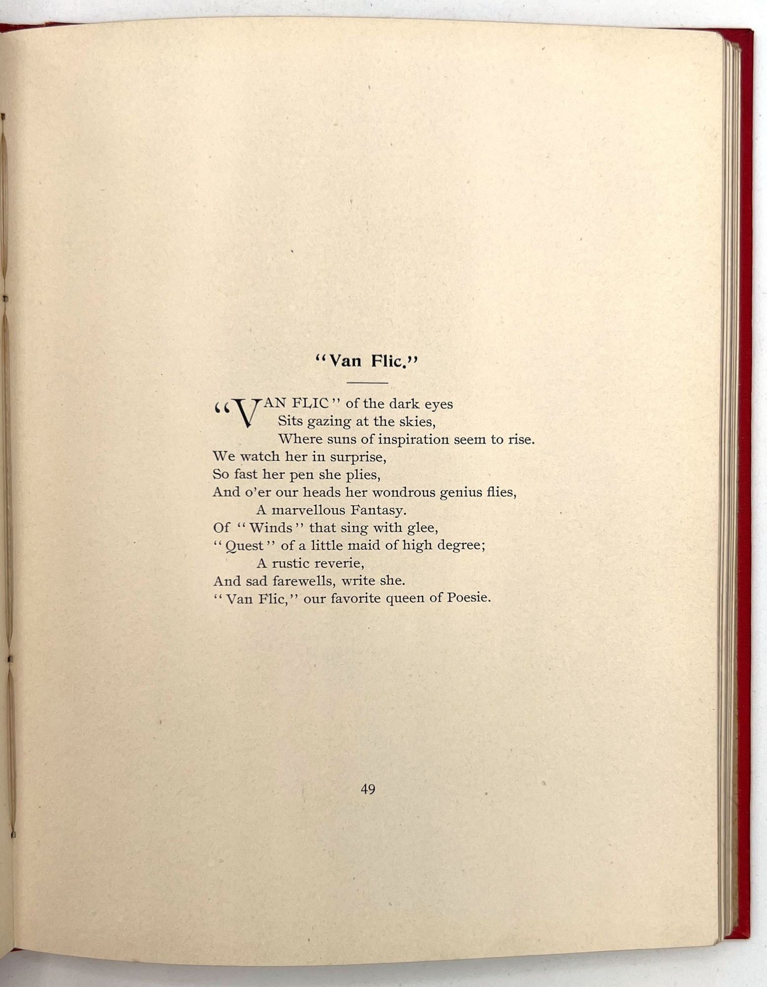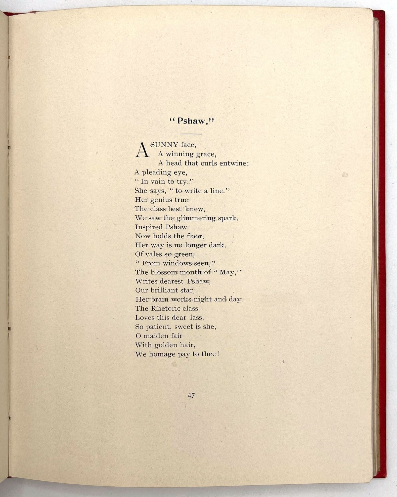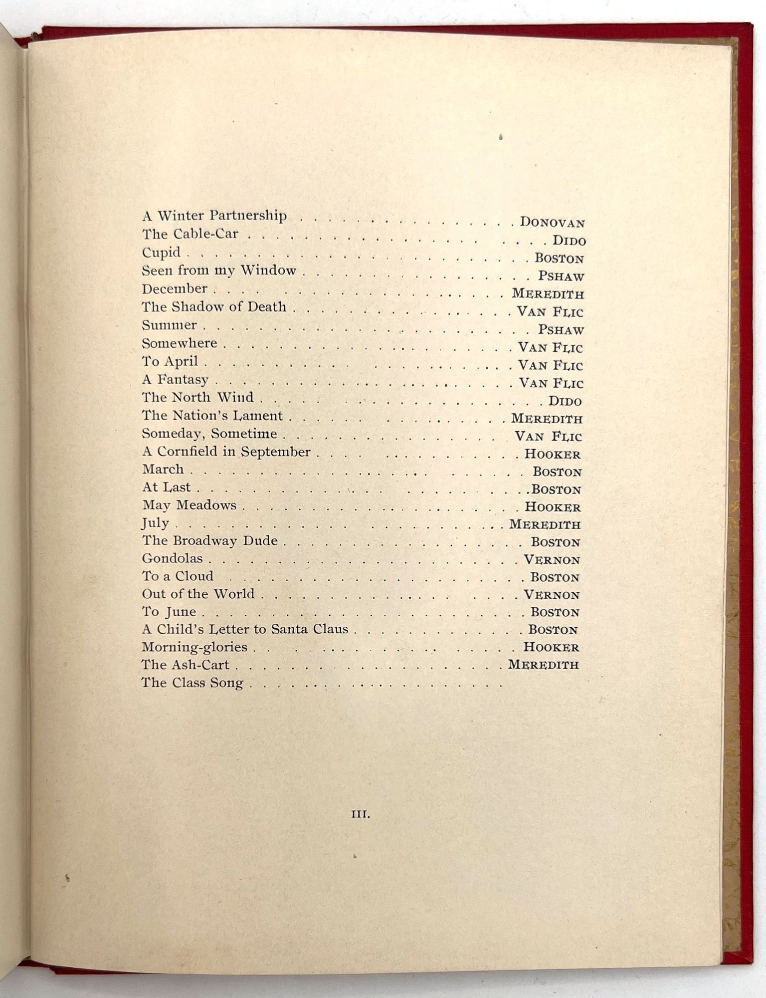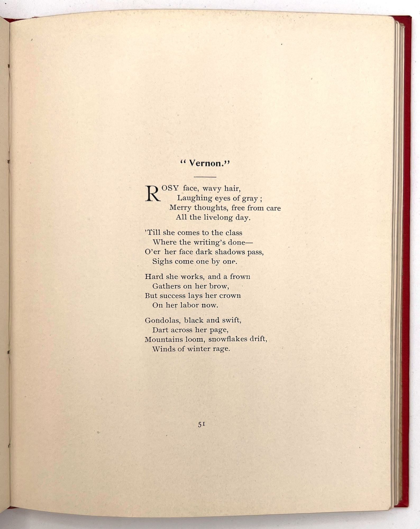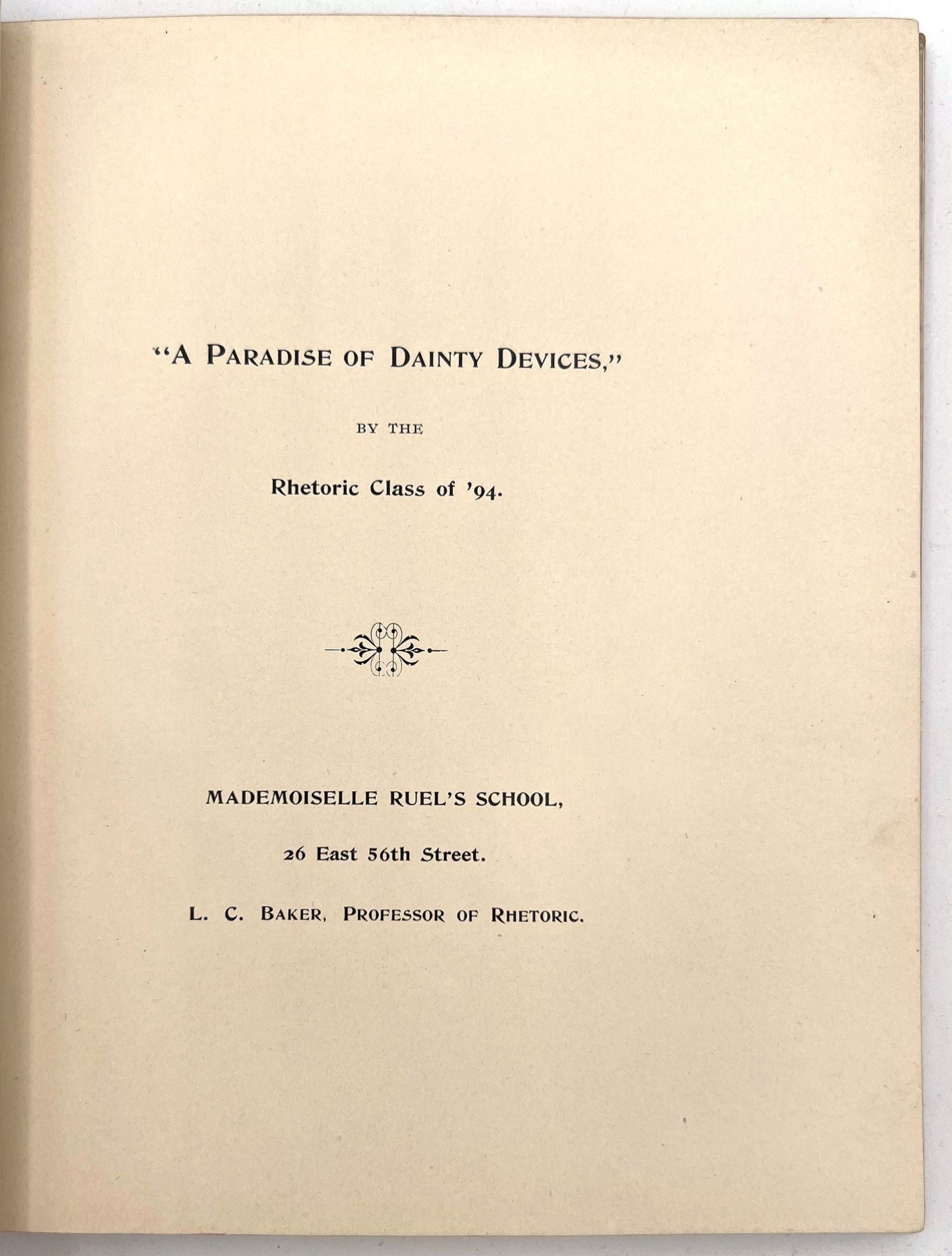 New York, New York: G.H. Dickson's Sons & Co, 1894. Very good. Boards rubbed with water staining. Some dust soiling, upper hinge cracked, end papers toned.. Rare, with only a single other recorded copy (Brown), "A Paradise of Dainty Devices" is comprised of over 100 pages of original poetry and prose by students at Mademoiselle Ruel's School in Manhattan in 1894. It was compiled by and privately printed for L.C. Baker, Professor of Rhetoric, and attributes each piece to the students via an index with their pseudonyms in the index: Boston, Dido, Vernon, Van Flic, Donovan, Meredith, Hooker, and Pshaw. Subjects of the student's pieces include nature, friendship, school, death, dreaming, Venice, Santa Claus, and more. There is also a poem about each student, titled with their pseudonyms (pp. 46-53), and revealing a little about each of their personalities. Overall, a charming window into the lives of a small group of school girls, their passions and interests.