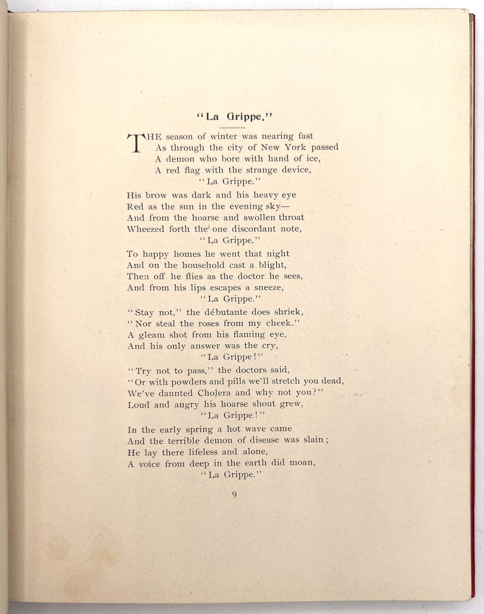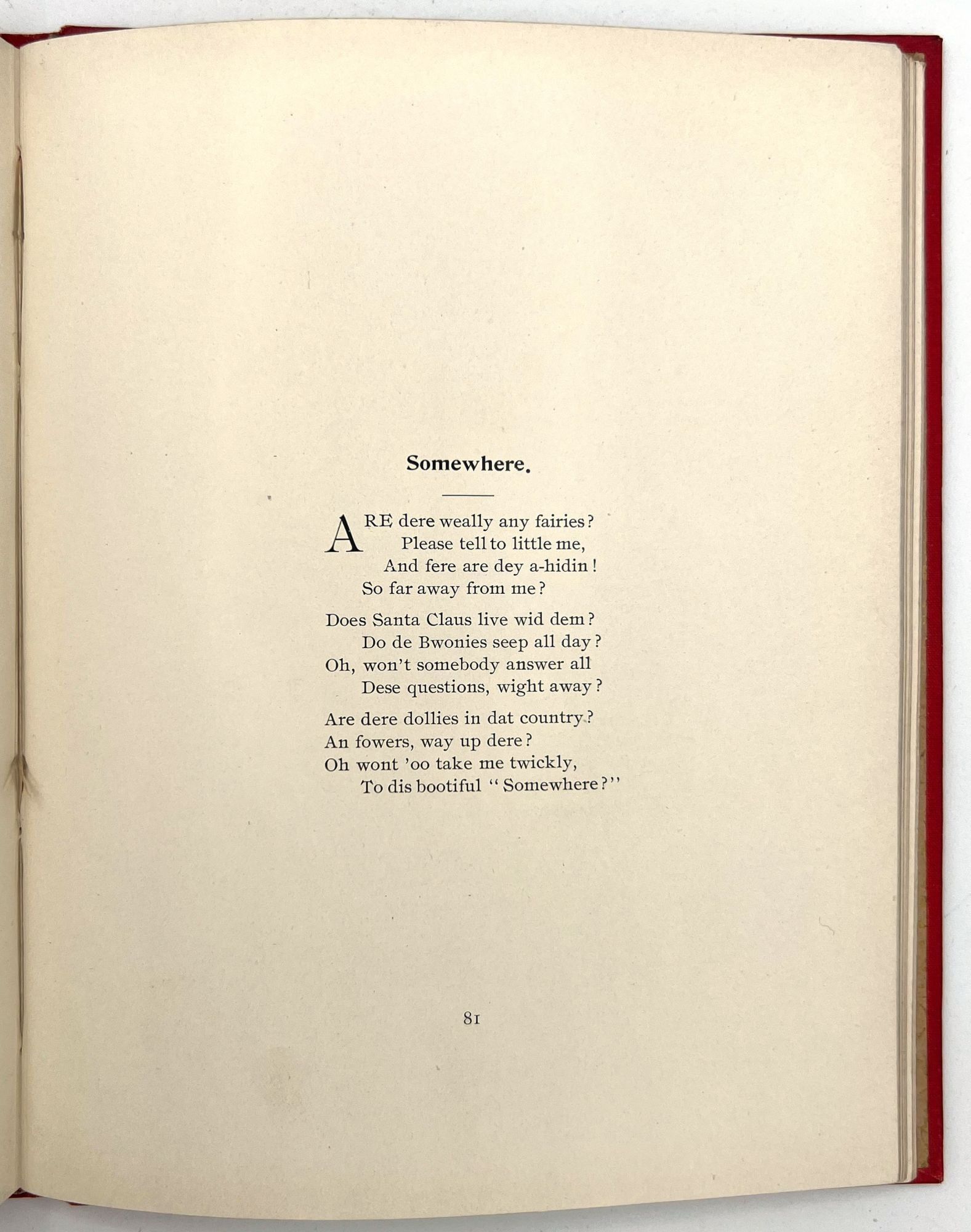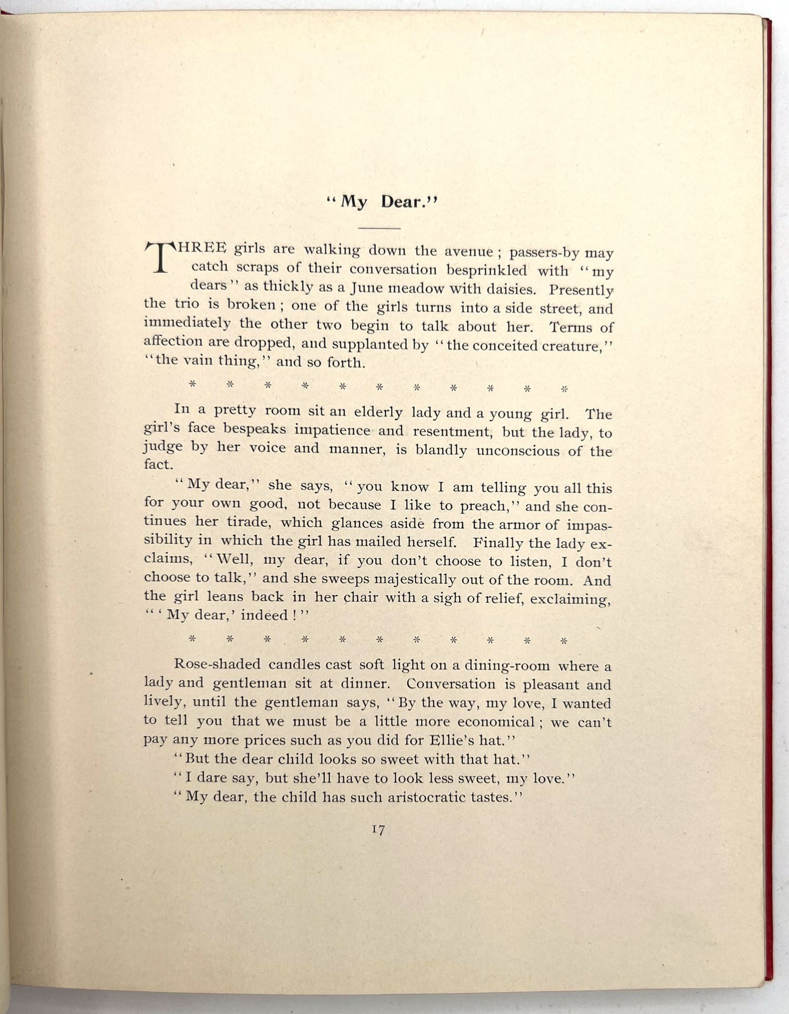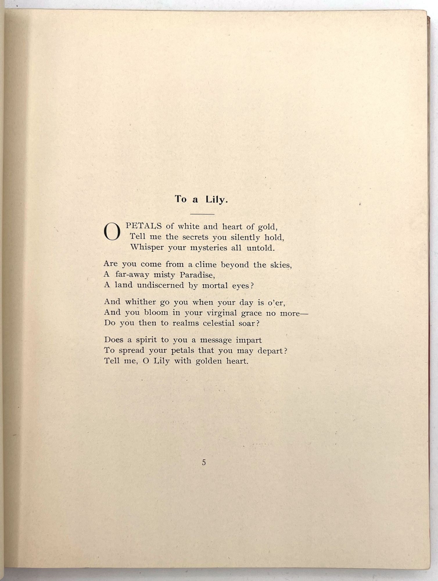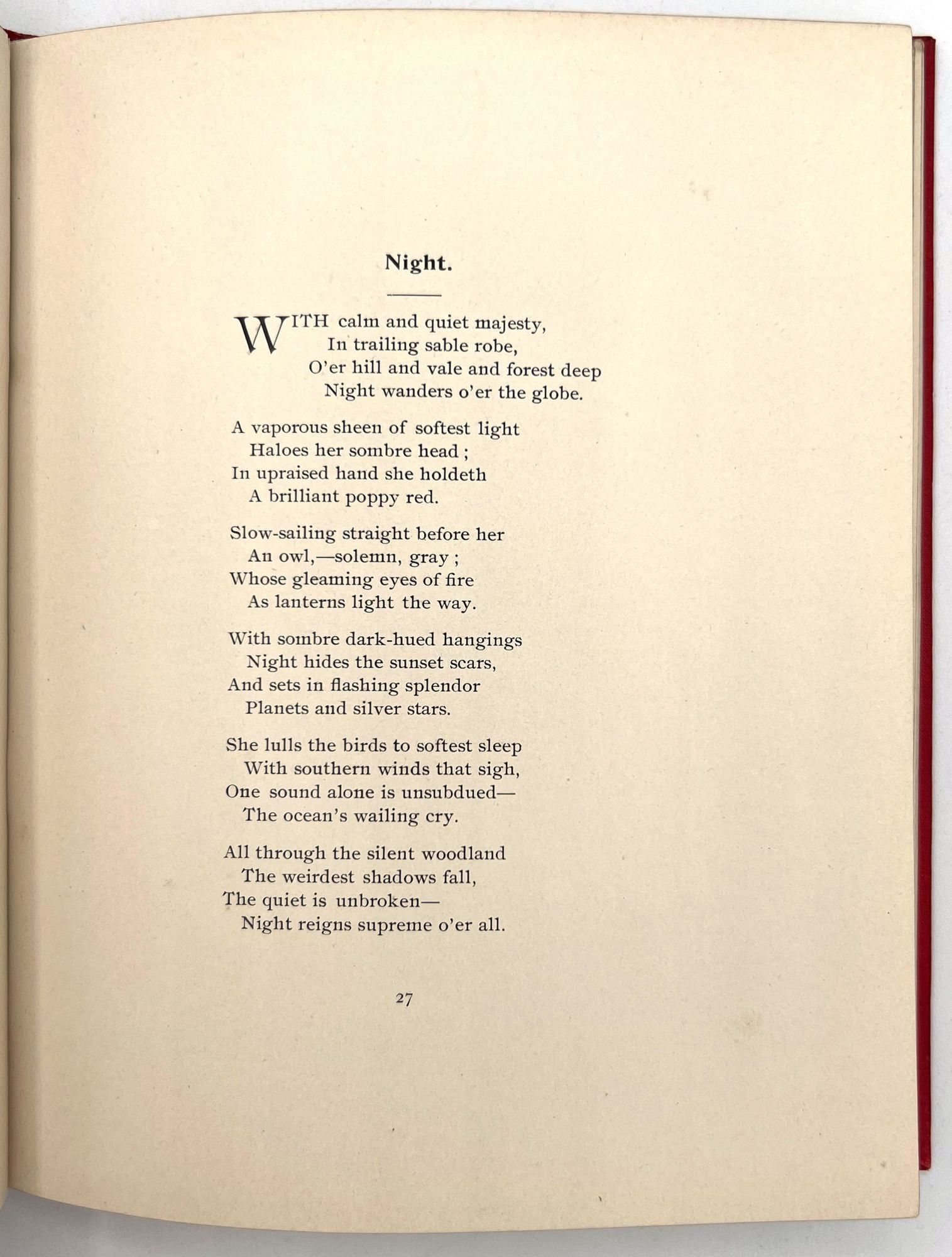 New York, New York: G.H. Dickson's Sons & Co, 1894. Very good. Boards rubbed with water staining. Some dust soiling, upper hinge cracked, end papers toned.. Rare, with only a single other recorded copy (Brown), "A Paradise of Dainty Devices" is comprised of over 100 pages of original poetry and prose by students at Mademoiselle Ruel's School in Manhattan in 1894. It was compiled by and privately printed for L.C. Baker, Professor of Rhetoric, and attributes each piece to the students via an index with their pseudonyms in the index: Boston, Dido, Vernon, Van Flic, Donovan, Meredith, Hooker, and Pshaw. Subjects of the student's pieces include nature, friendship, school, death, dreaming, Venice, Santa Claus, and more. There is also a poem about each student, titled with their pseudonyms (pp. 46-53), and revealing a little about each of their personalities. Overall, a charming window into the lives of a small group of school girls, their passions and interests.