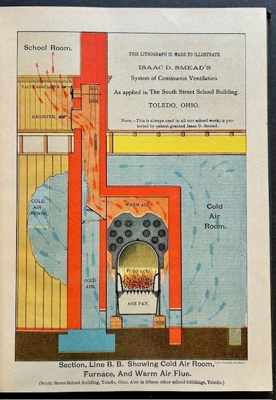 Toledo, Ohio: Isaac D. Smead & Co, 1889. Cloth. Very Good +. A tight, well-preserved copy of the scarce 1889 1st edition of this self-published examination of early ventilation and the heating of buildings. Solid and VG+ in its dark-green cloth, with dozens of elaborate steel-engravings, a number of them in rich color -- or chromolithography. Quarto, 153 pgs. of text, in addition to the original marbled endsheets and pastedowns, as well as the original tissue-guard separating the lovely engraved frontispiece (of Isaac Smead) from the title page. A deeply-impressive late 19th century engineering catalogue, highlighting the latest advances in heating and ventilation.