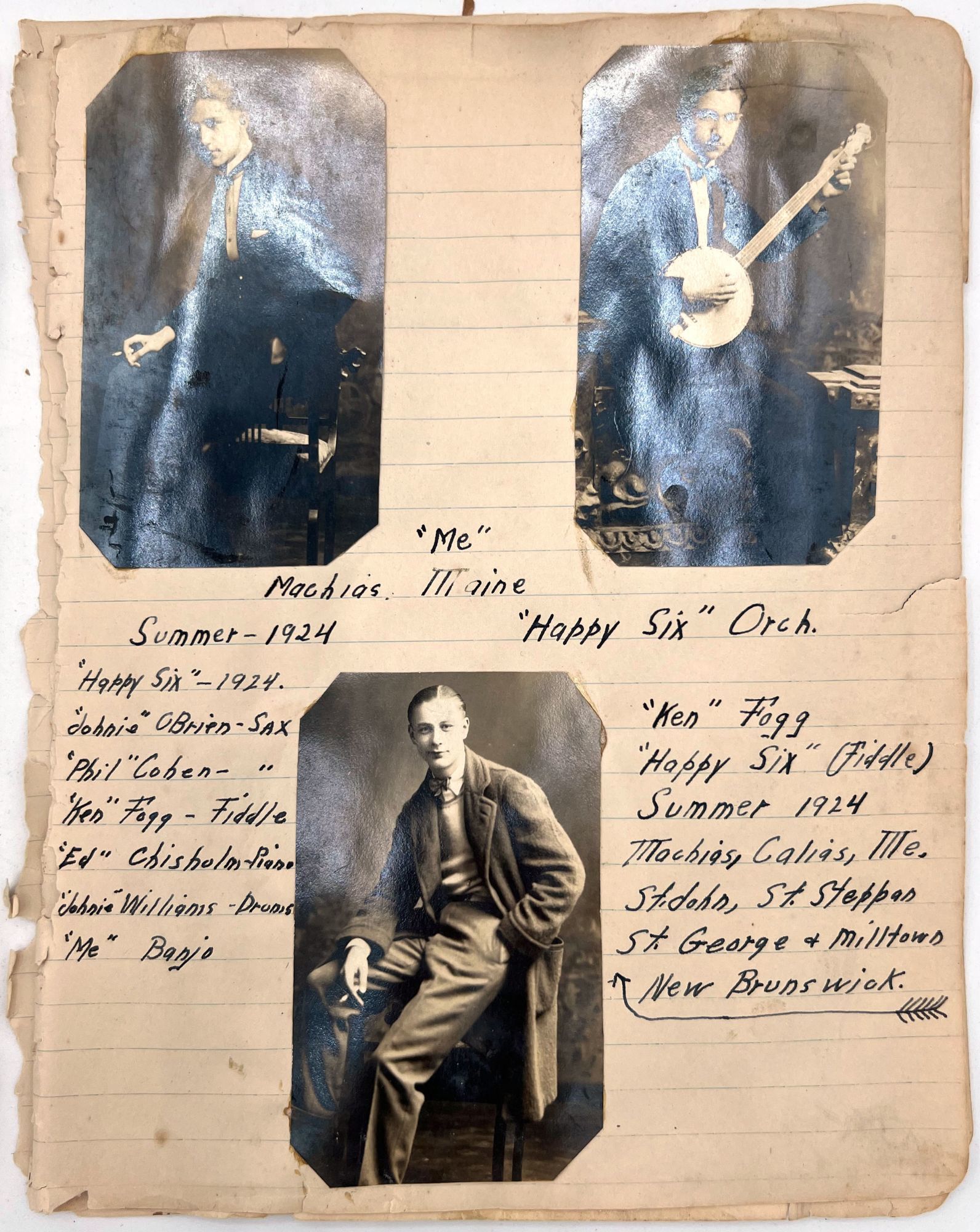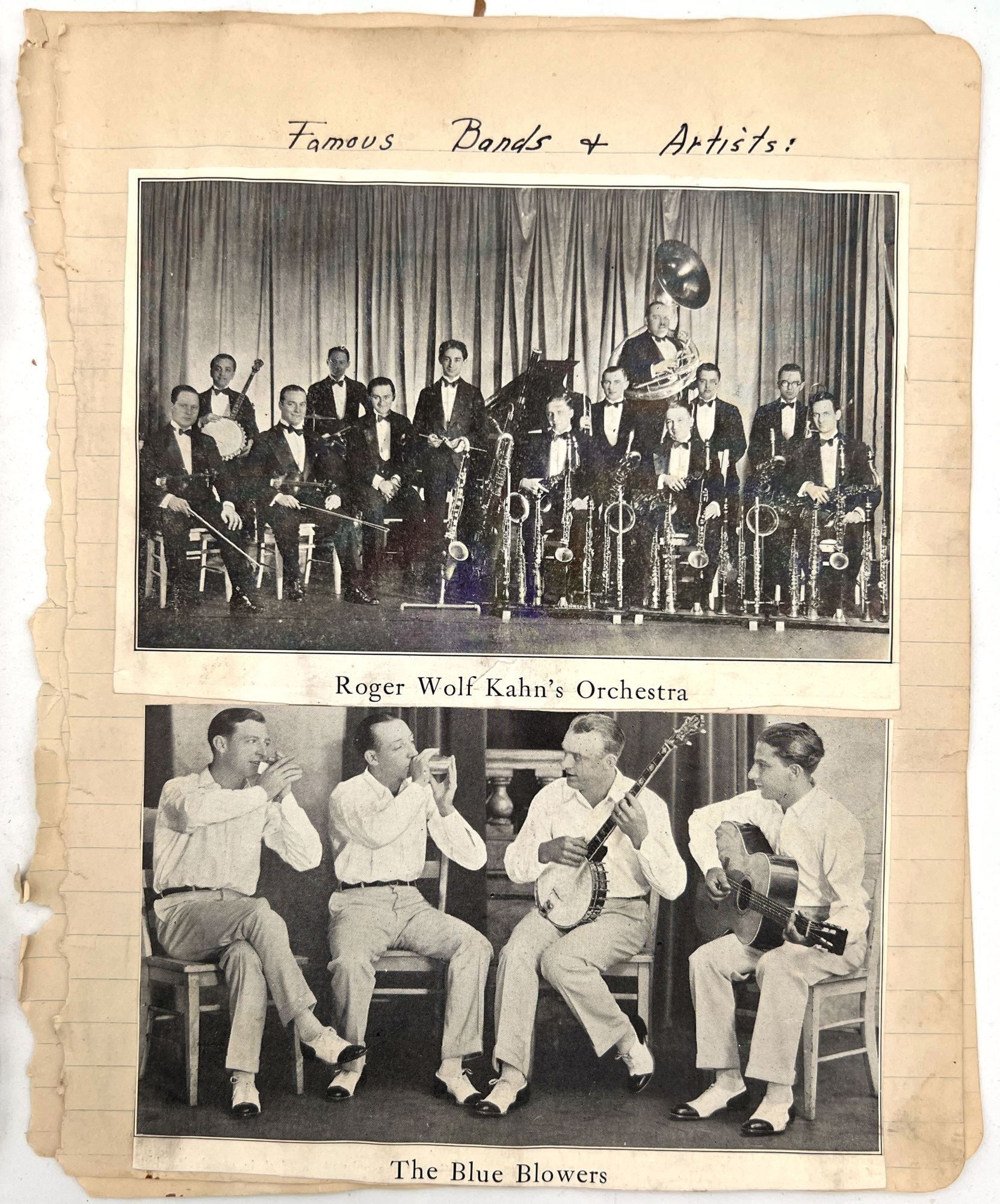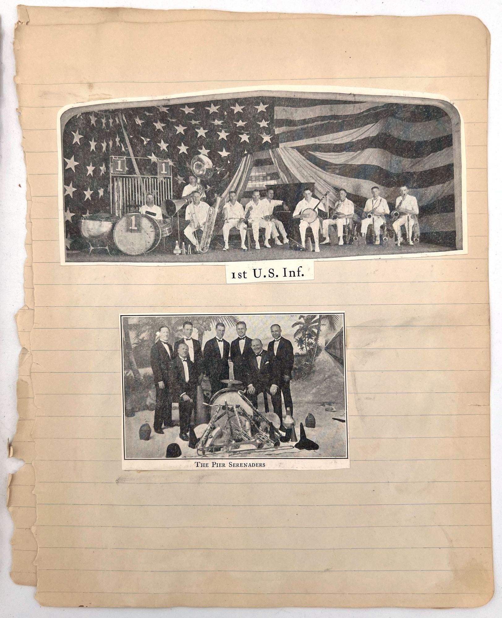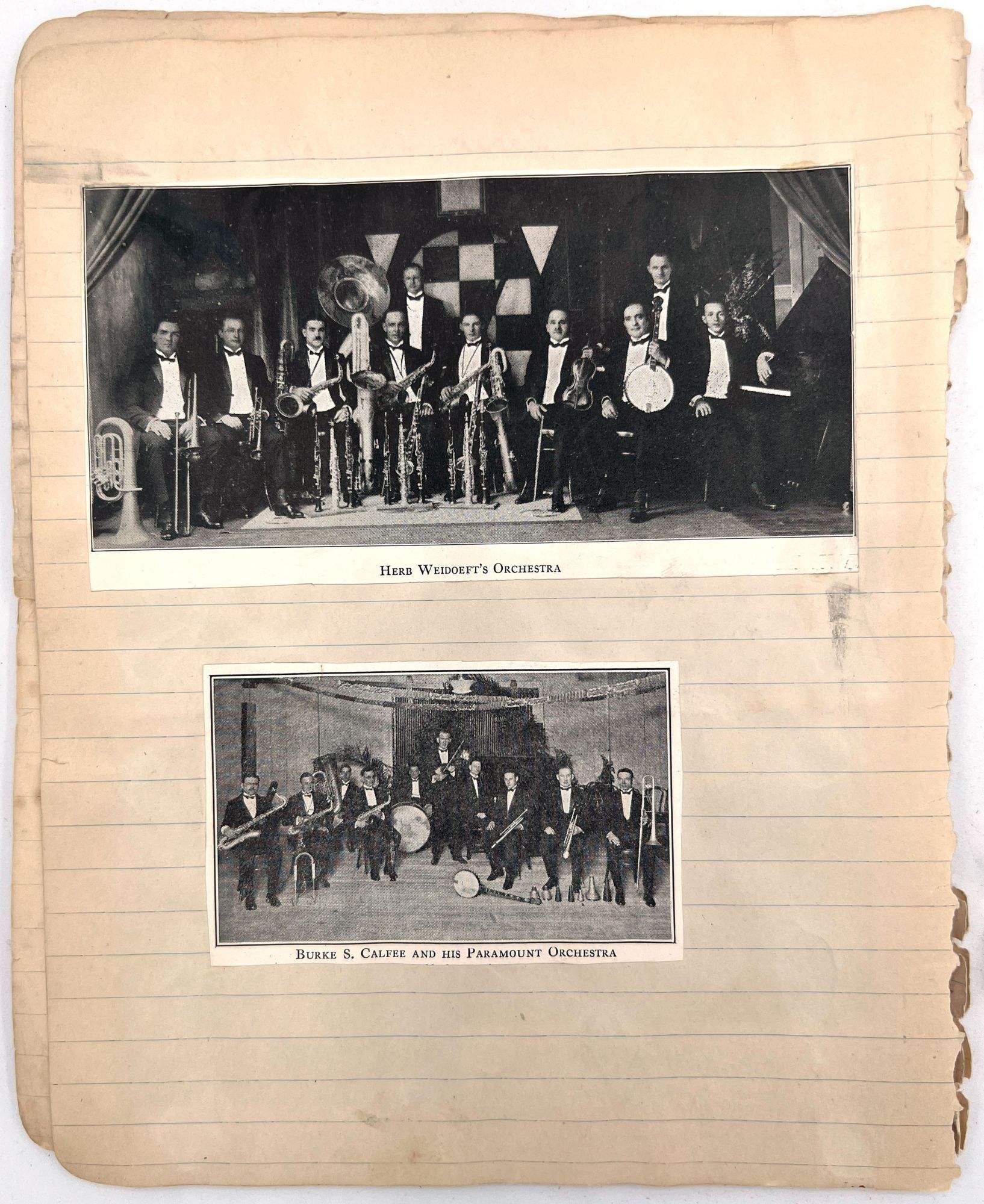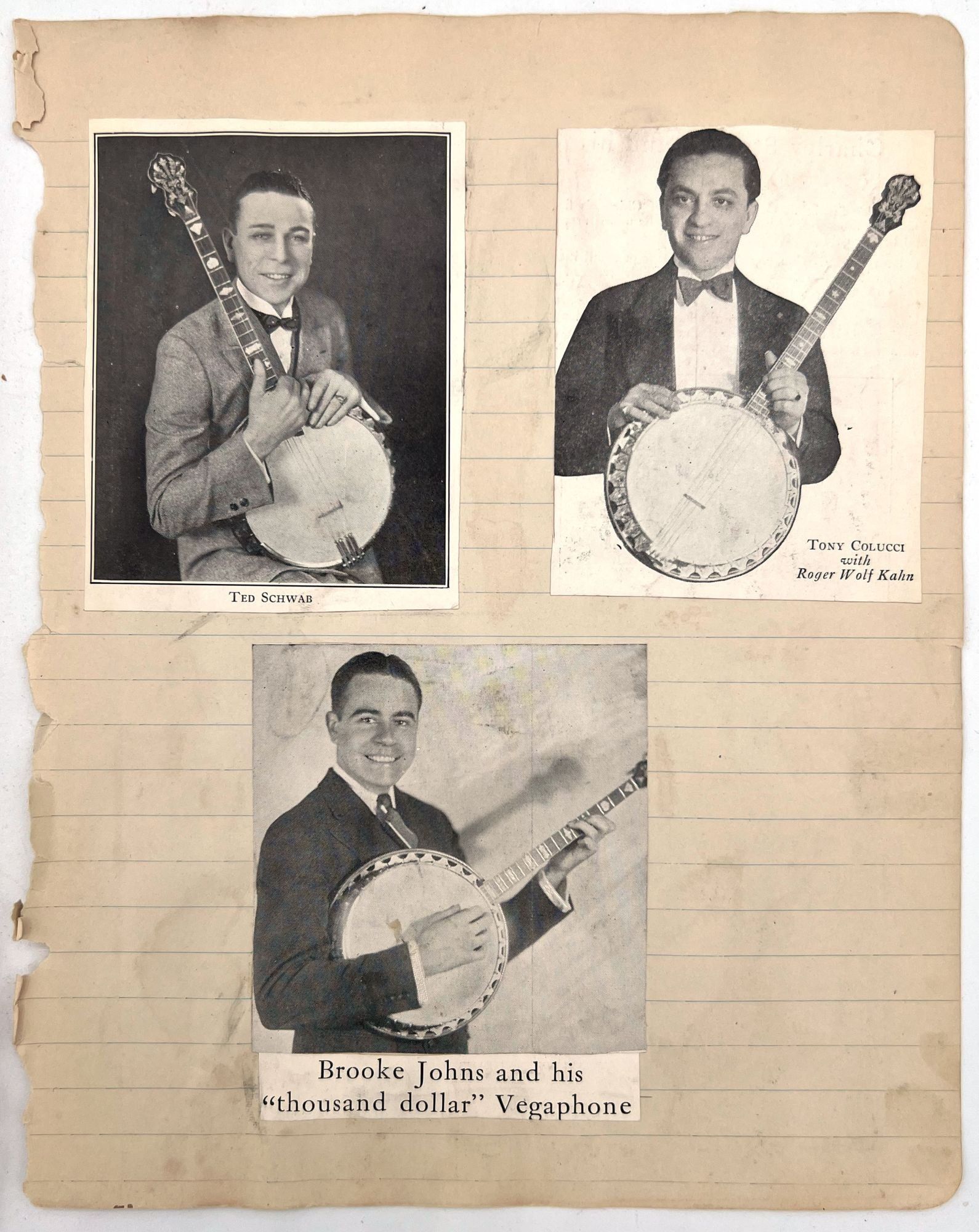United States, 1930. Poor to fair. Notebook leaves sometime disbound, toned, minor dust soiling, chipping and short tears. Pinholes and evidence of past adhesive to photo postcards.. A section removed from a scrap book compiled c.1930s by a banjo player and popular music enthusiast, including three real photo postcards and other photos of himself posing with his banjo, his dog ("Prince and Me-- Both dogs"), and his car. Includes a March 1926 newspaper clipping referencing a "Robert J. Toole" of Wilkes Barre, perhaps the banjo player in question. There are mentions of other musicians the man has played with including Johnie "Obie" O'Brien ("the Hottest Sax player in 3 states"), fiddle player Ken Fogg, pianist Ed Chisholm, and drummer "Johnie" Williams; they all played together in Machias, Maine, in the summer of 1924. Also includes original photos of "Jolly Joe" Bowers and his Black and White Orchestra in 1924, with the members names labeled, and clippings of photos of other famous bands including: Roger Wolf Kahn's Orchestra; The Blue Blowers; Herb Weidoeft's Orchestra; Burke S. Calfee and his Paramount Orchestra; The Pier Serenaders; The 1st U.S. Infantry Band; and ten famous banjo players, each posing with their instrument.
