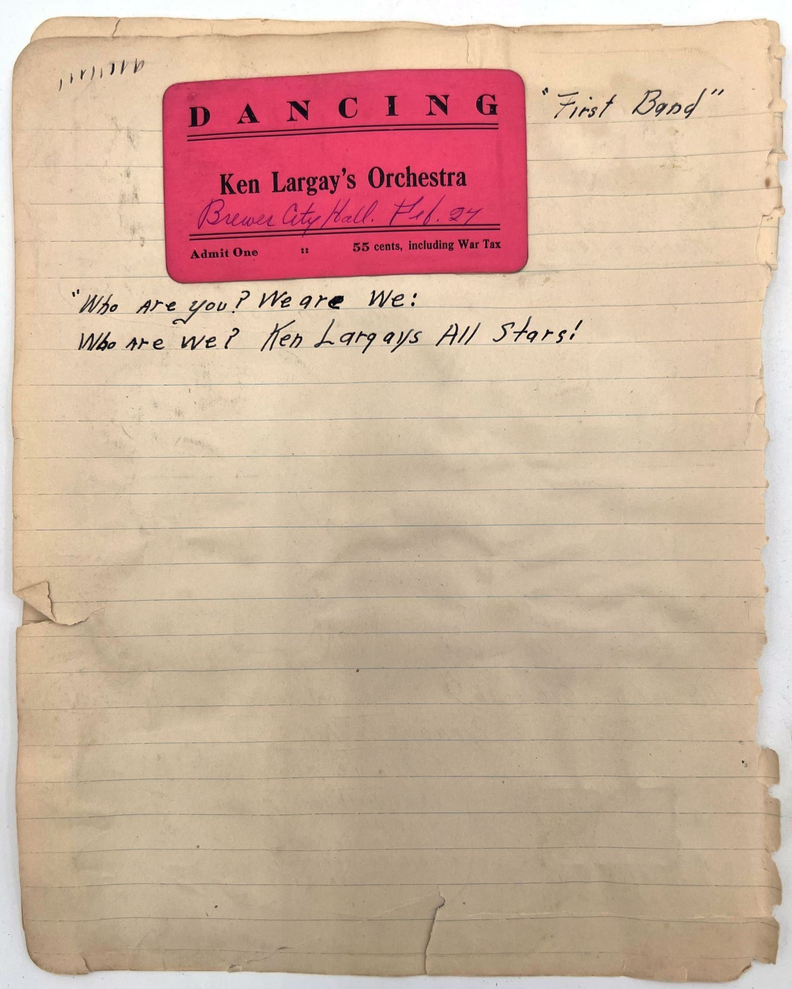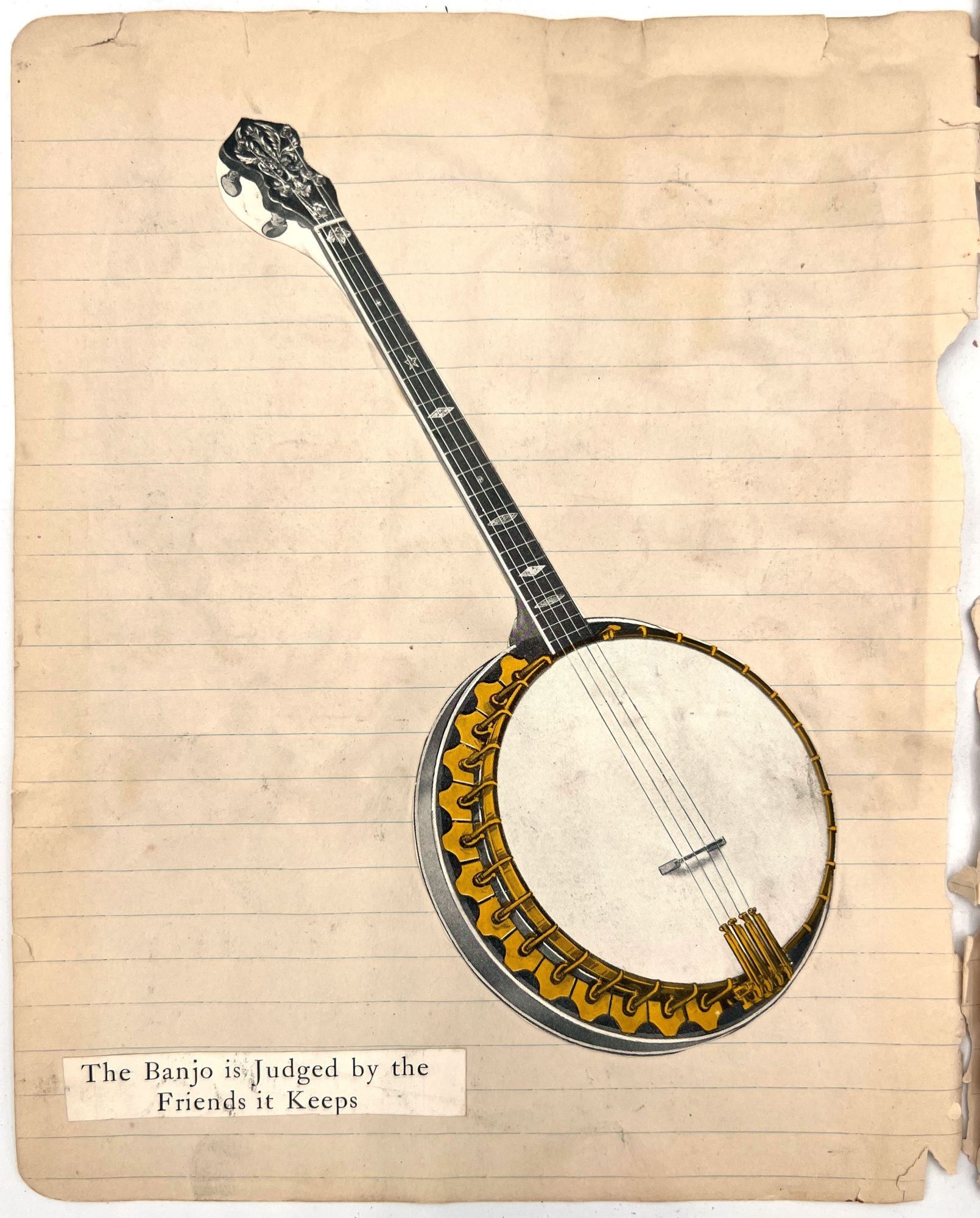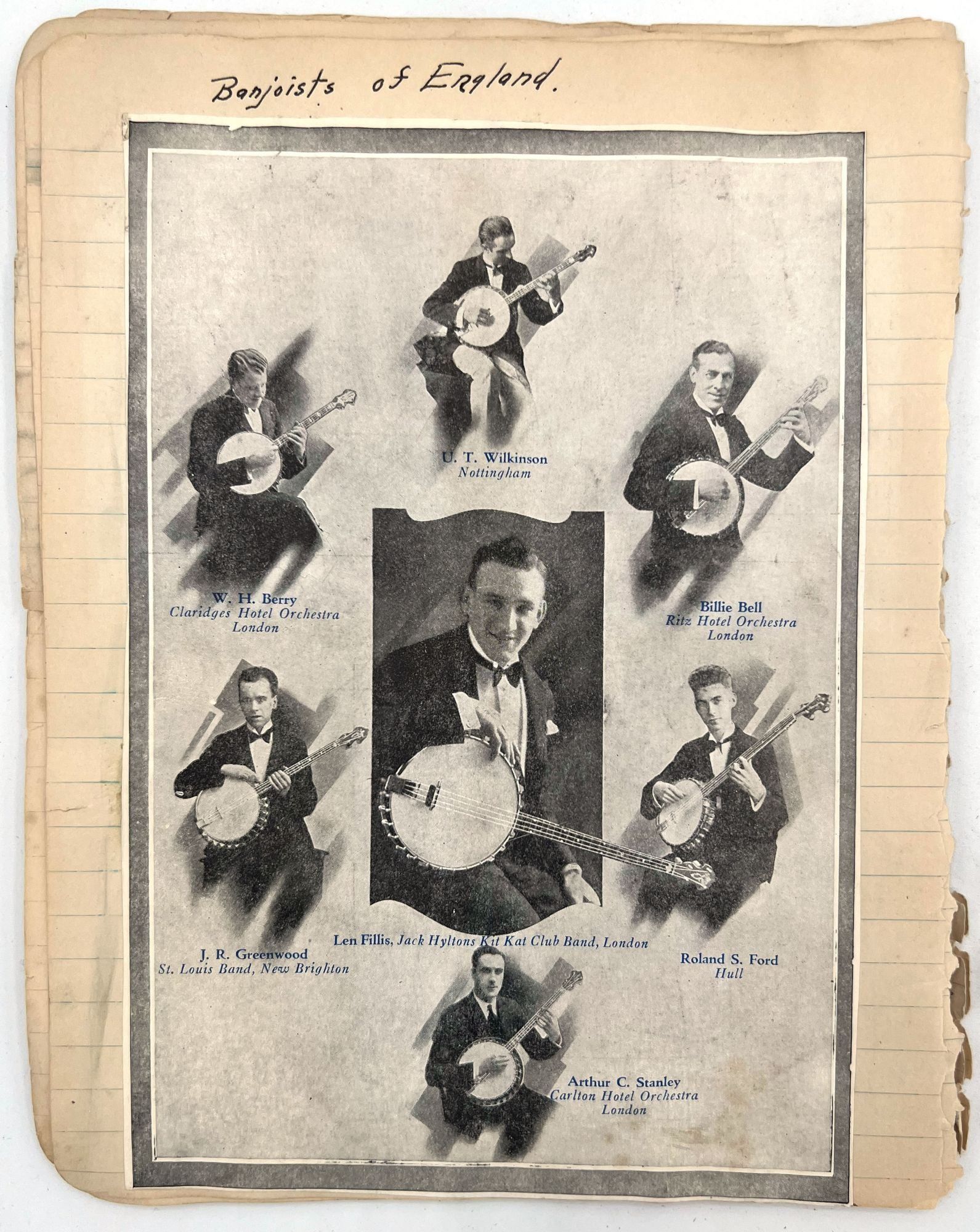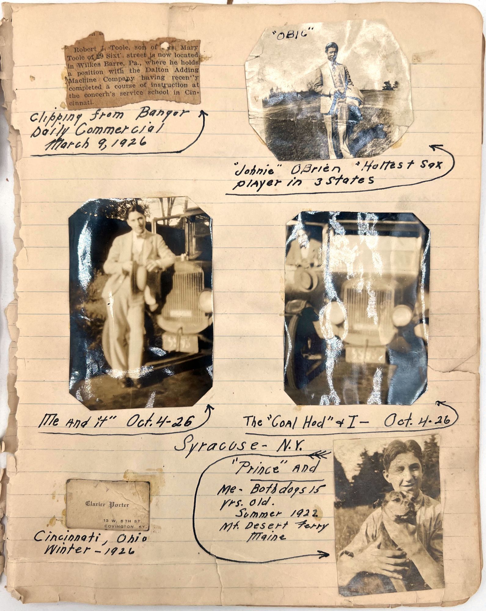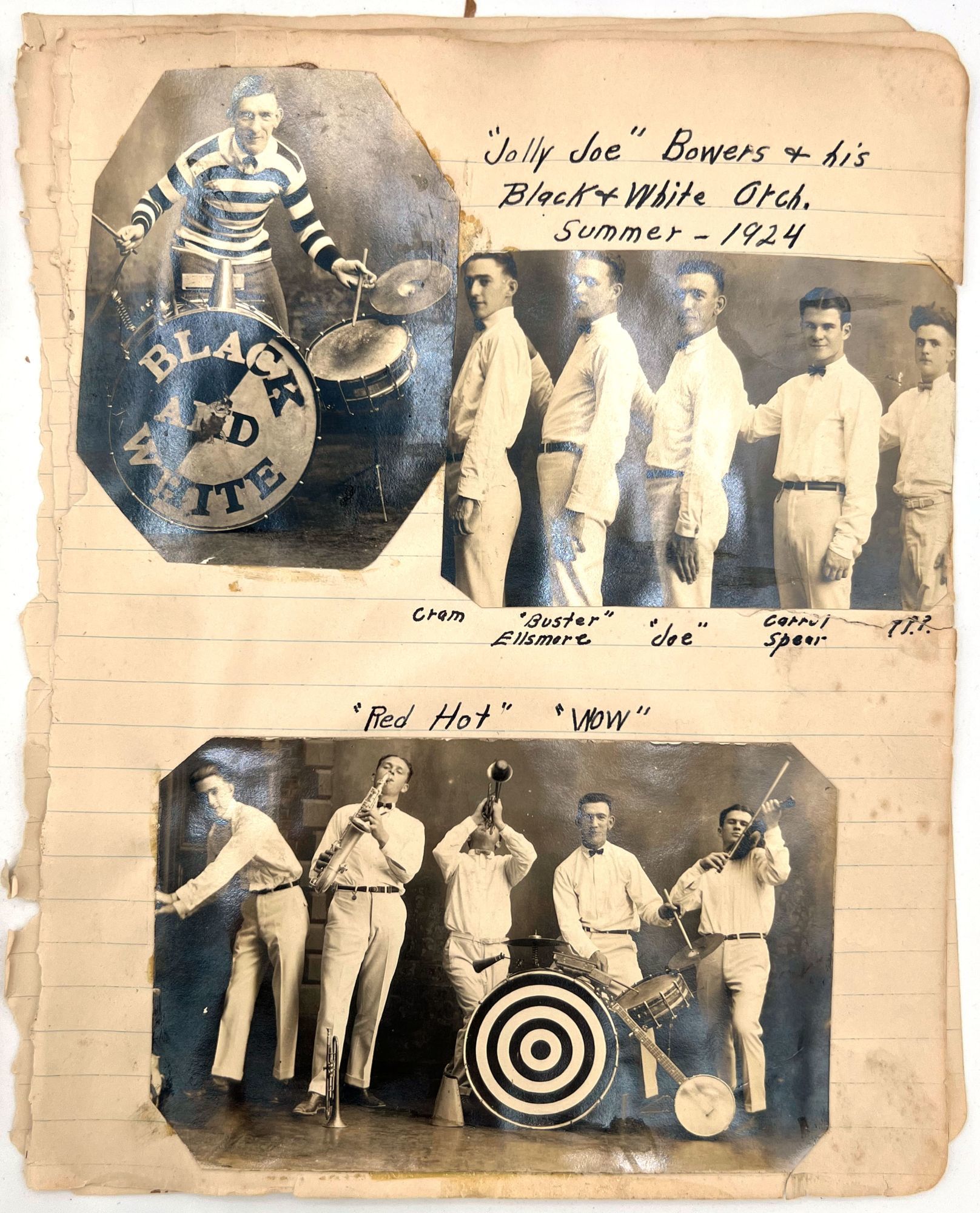 United States, 1930. Poor to fair. Notebook leaves sometime disbound, toned, minor dust soiling, chipping and short tears. Pinholes and evidence of past adhesive to photo postcards.. A section removed from a scrap book compiled c.1930s by a banjo player and popular music enthusiast, including three real photo postcards and other photos of himself posing with his banjo, his dog ("Prince and Me-- Both dogs"), and his car. Includes a March 1926 newspaper clipping referencing a "Robert J. Toole" of Wilkes Barre, perhaps the banjo player in question. There are mentions of other musicians the man has played with including Johnie "Obie" O'Brien ("the Hottest Sax player in 3 states"), fiddle player Ken Fogg, pianist Ed Chisholm, and drummer "Johnie" Williams; they all played together in Machias, Maine, in the summer of 1924. Also includes original photos of "Jolly Joe" Bowers and his Black and White Orchestra in 1924, with the members names labeled, and clippings of photos of other famous bands including: Roger Wolf Kahn's Orchestra; The Blue Blowers; Herb Weidoeft's Orchestra; Burke S. Calfee and his Paramount Orchestra; The Pier Serenaders; The 1st U.S. Infantry Band; and ten famous banjo players, each posing with their instrument.