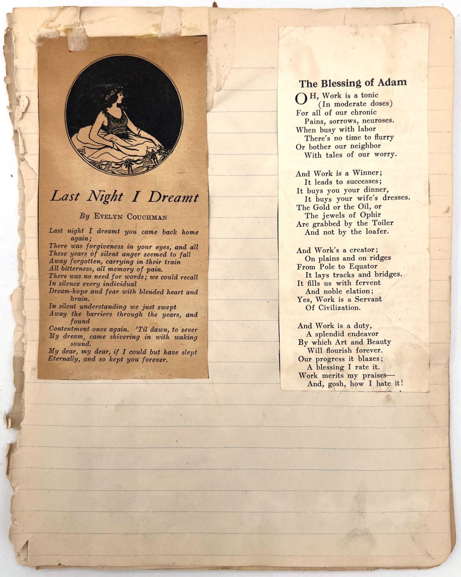 Seven leaves sometime excised from composition notebook, each measuring approx. 9.25" by 7.5", and three real photo postcards measuring approx. 5.5" by 3.5". Photos, clippings, one ticket, and a small business card pasted into notebook pages.