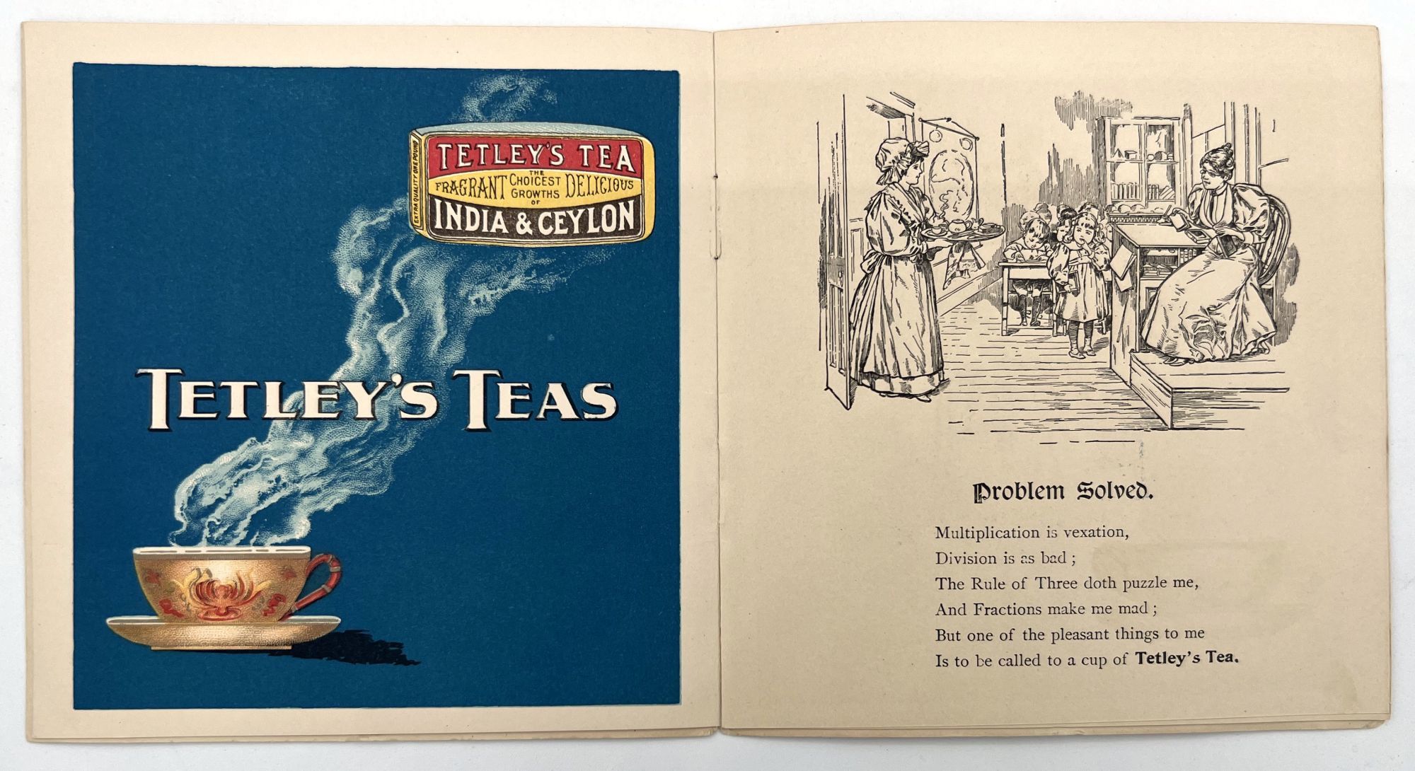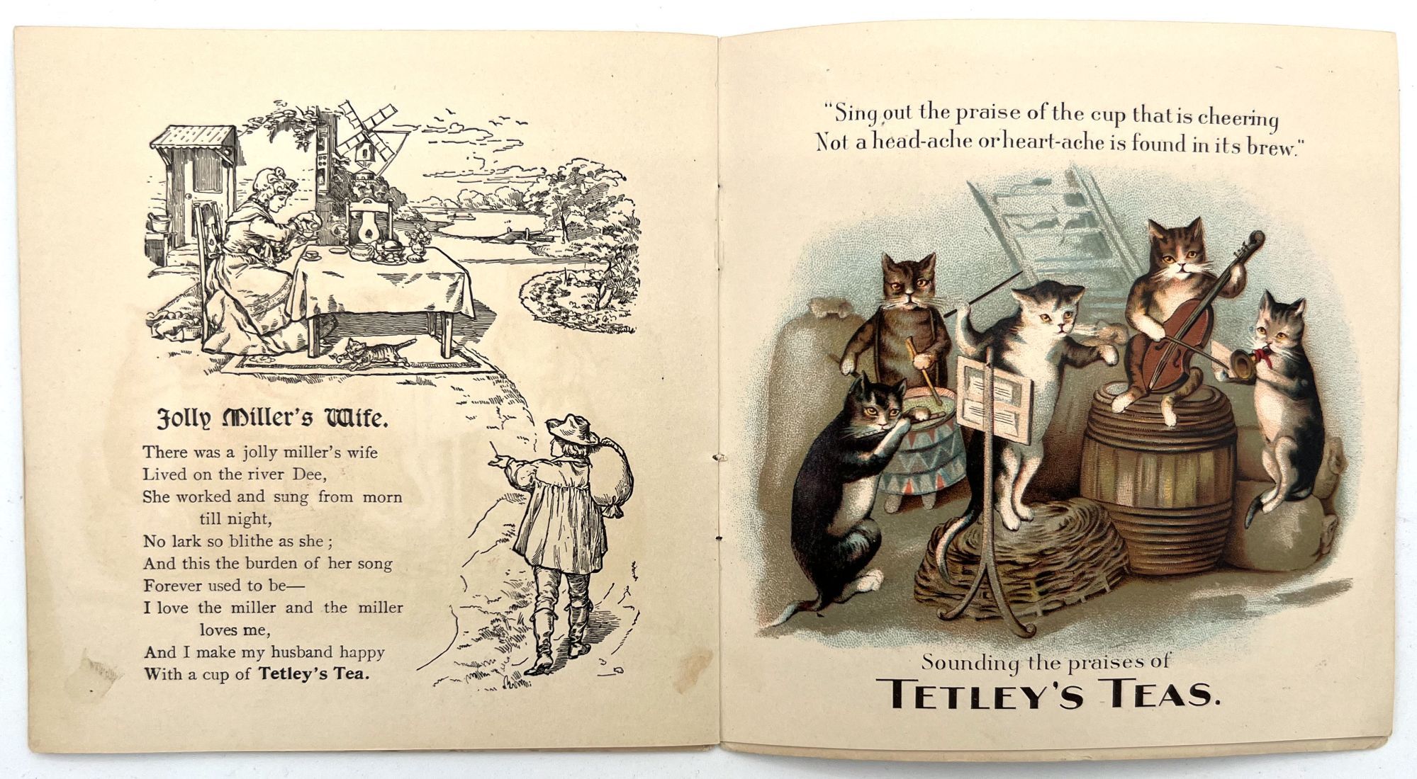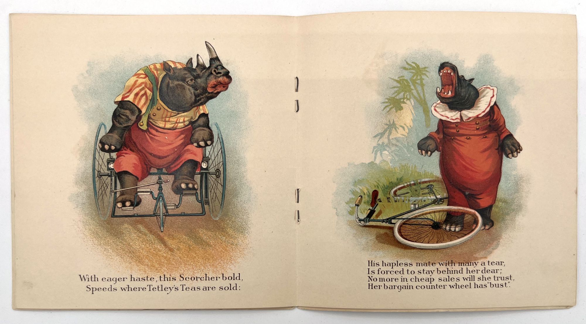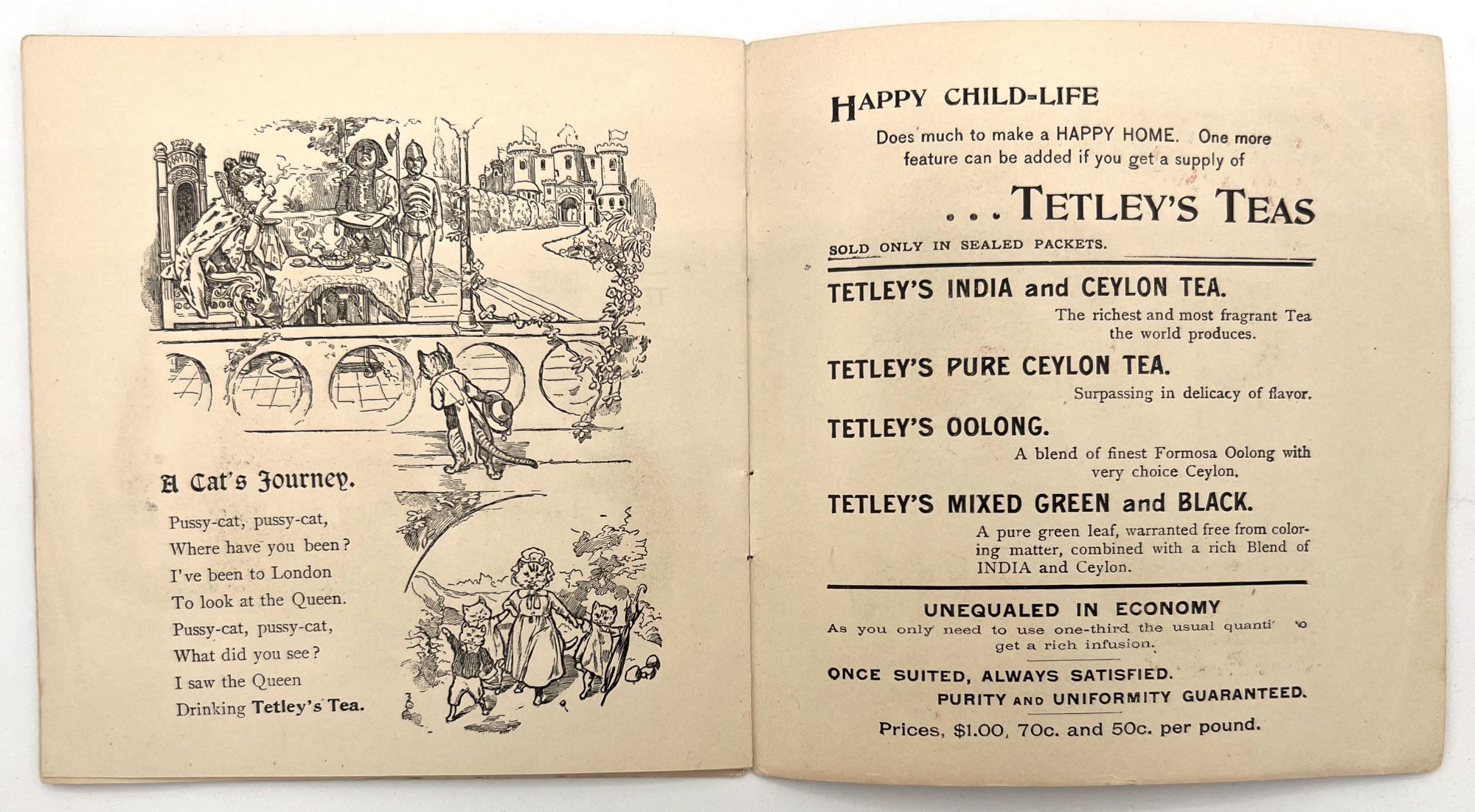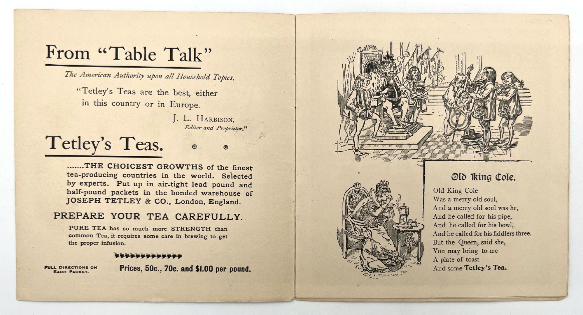 [United States]: Tetley's Teas, 1890. Very good. Minor rubbing, toning.. A rather charming illustrated book of nursery rhymes advertising Tetley's Teas, choc-full of anthropomorphics. Measures 5.25" by 5.25", pp. [8] with in-text illustrations, stapled in original chromolithographed illustrated wrappers. Black ink stamp of Bakie Brothers of Kingston, New Hampshire to upper cover. Partially erased pencil annotation to upper wrapper.