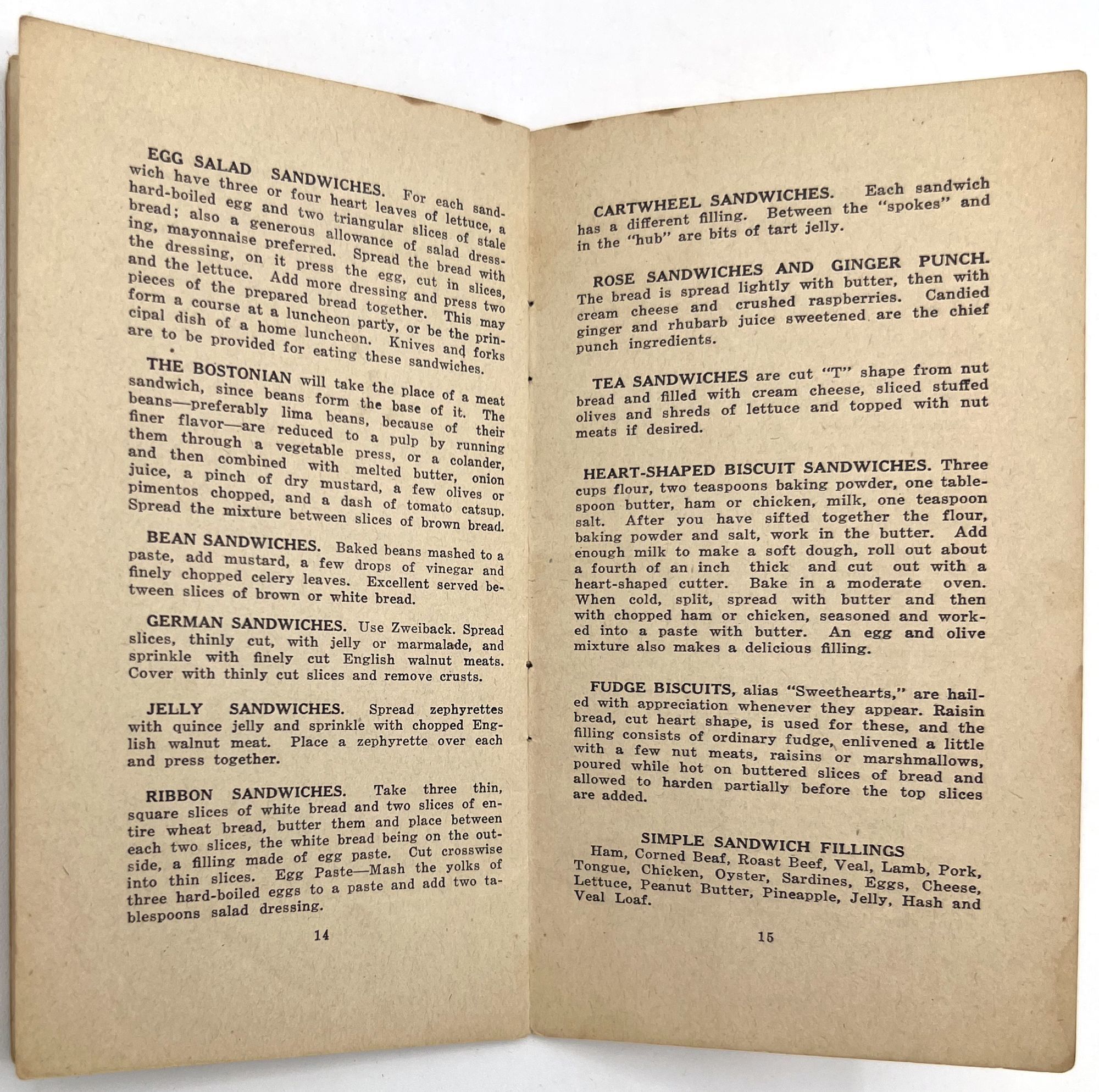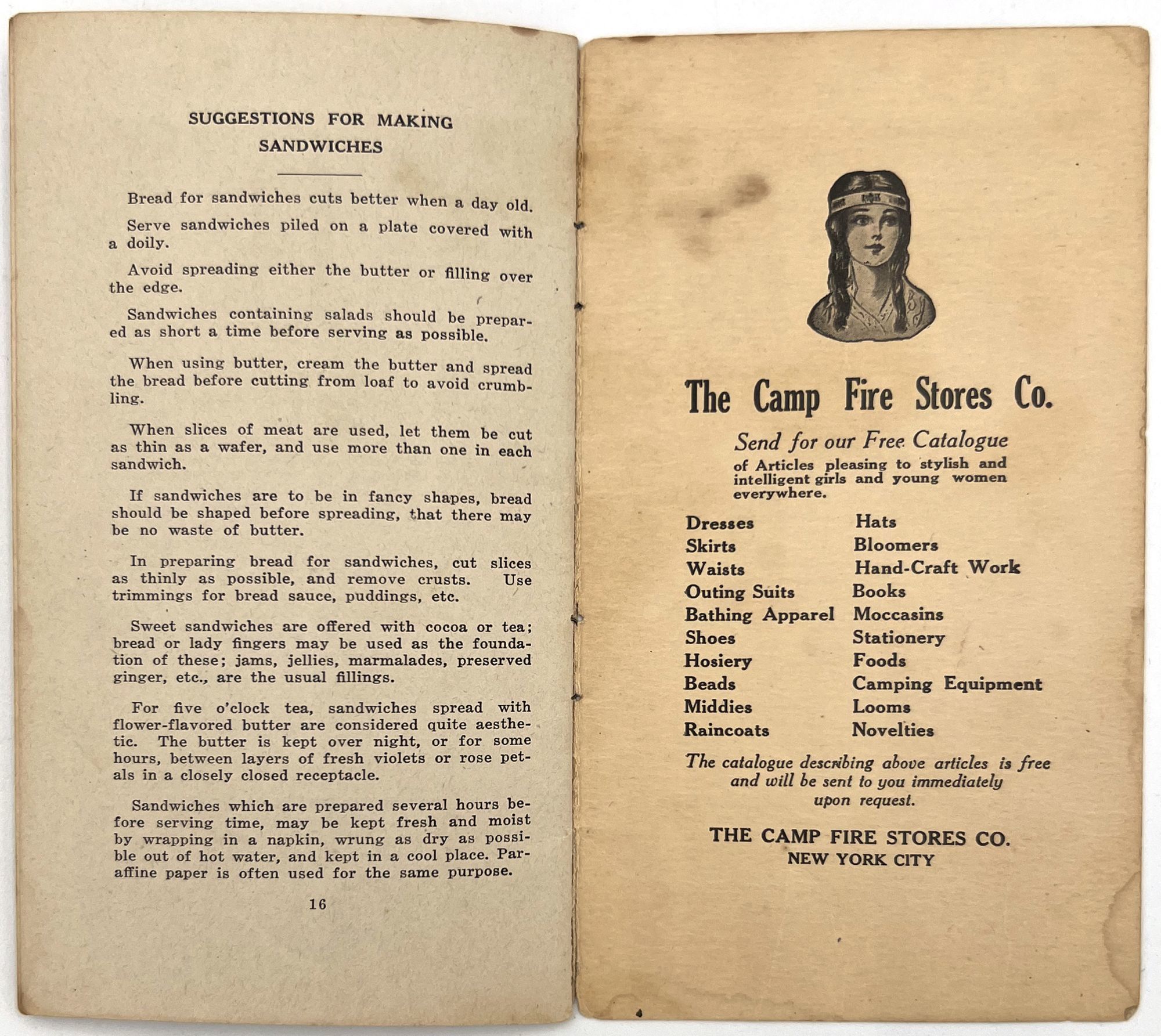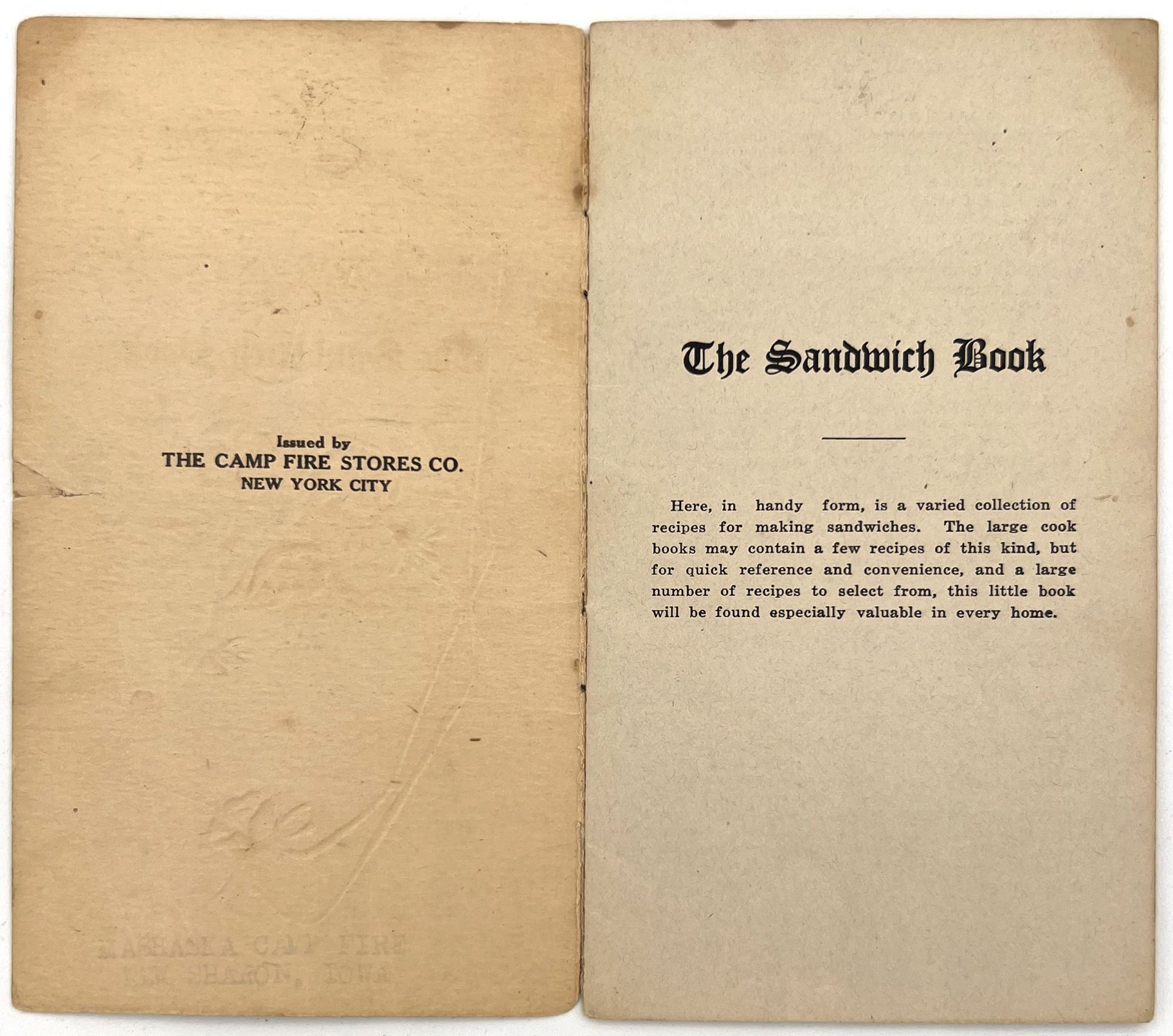 New York: The Camp Fire Stores Co. Very good to fine; some minor damp staining and toning.. A book of sandwich recipes "in handy form" designed for "quick reference and convenience" in the home (p. [1]). Includes fifteen pages of sandwich recipes and a page of "suggestions for making sandwiches" at the rear. Examples of recipes include Oyster Sandwiches, Peanut Butter, Minced Ham, and "A Boy's Dream", which is described as being "relished by all sweet-toothed mortals" and comprised of jam and fruit. Marketed to women, the book includes an advertisement for the publisher's "free catalogue of Articles pleasing to stylish and intelligent girls and young women everywhere" (lower wrapper recto).