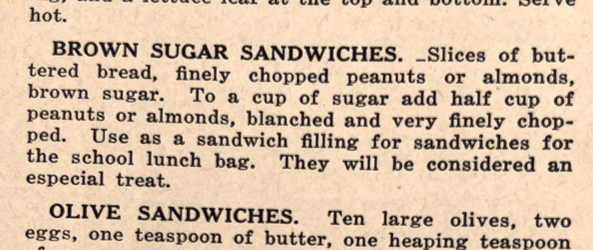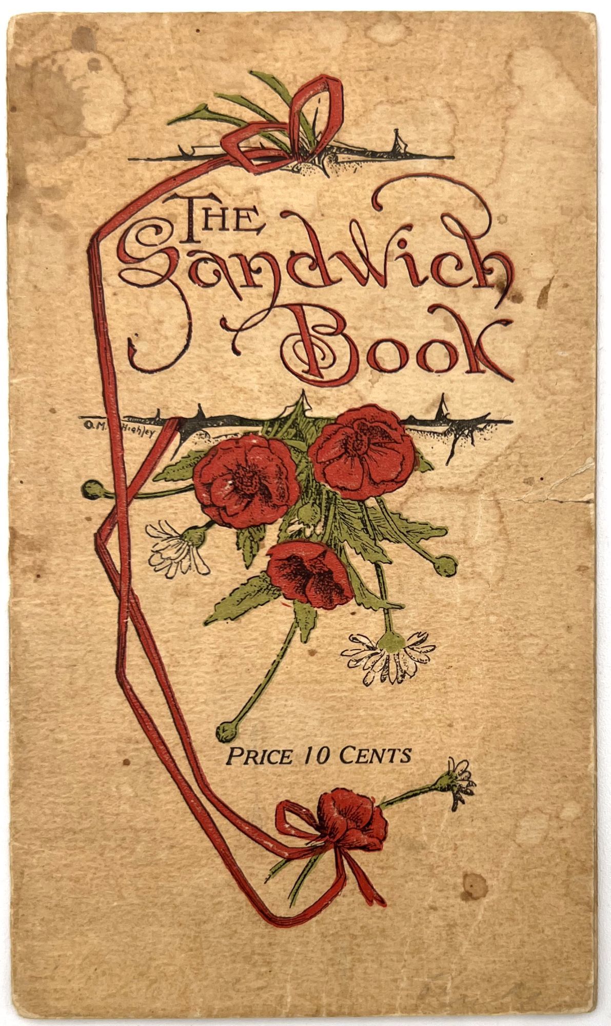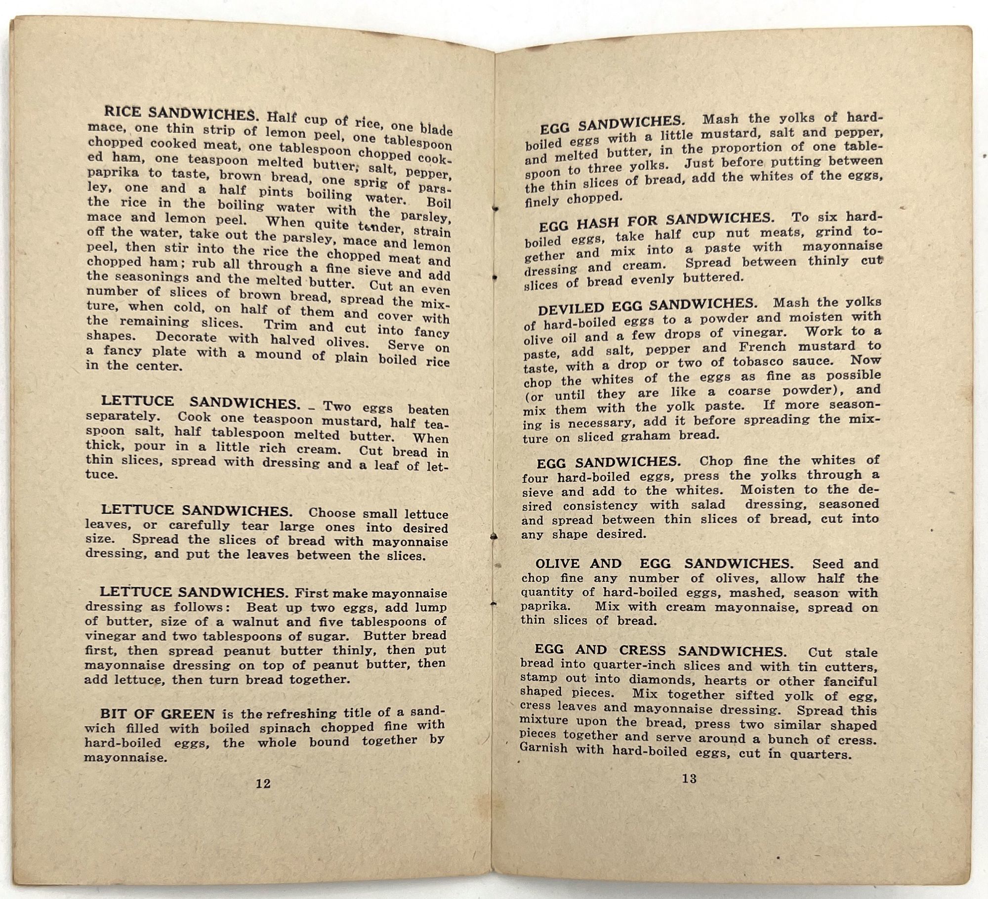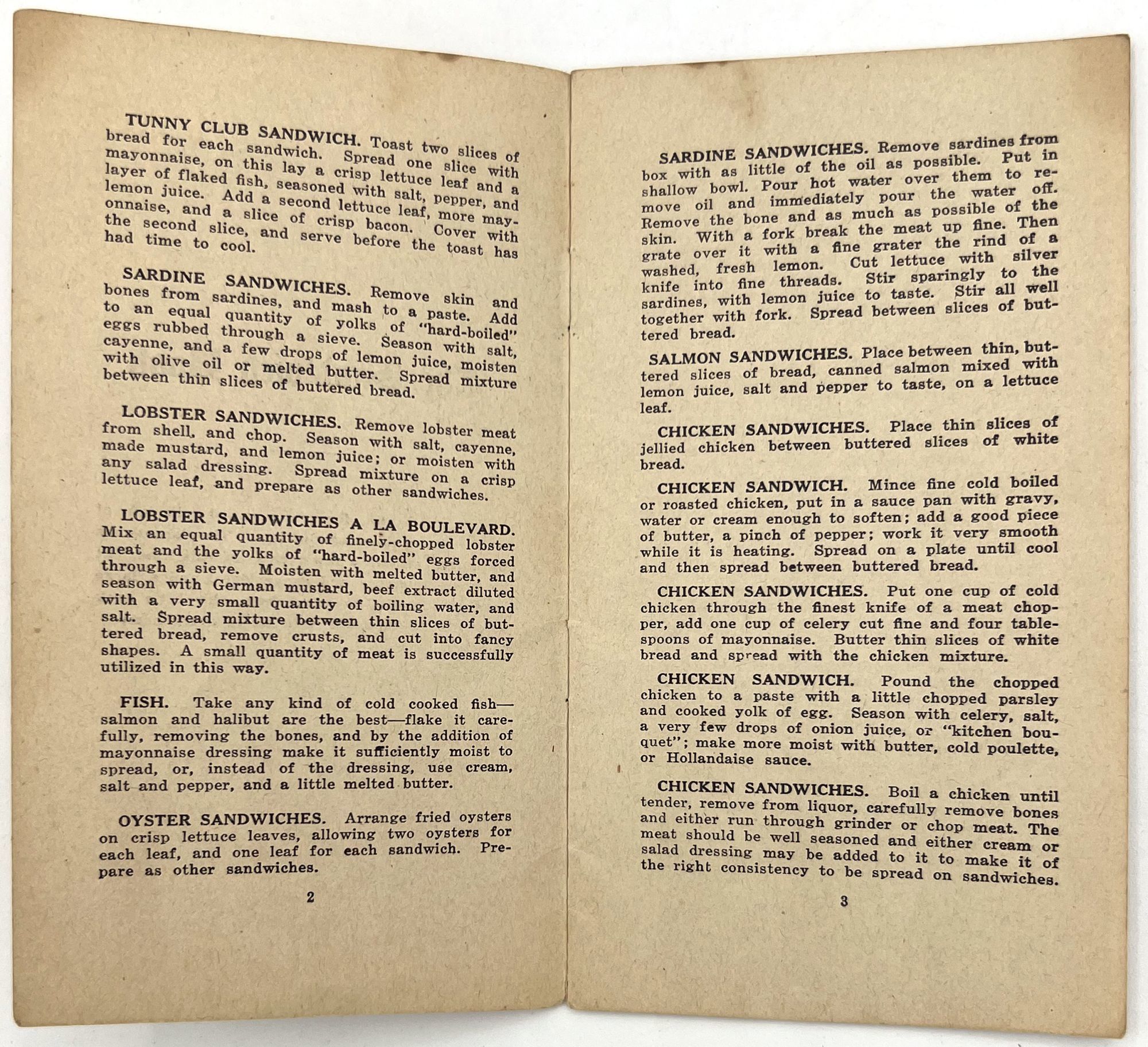 New York: The Camp Fire Stores Co. Very good to fine; some minor damp staining and toning.. A book of sandwich recipes "in handy form" designed for "quick reference and convenience" in the home (p. [1]). Includes fifteen pages of sandwich recipes and a page of "suggestions for making sandwiches" at the rear. Examples of recipes include Oyster Sandwiches, Peanut Butter, Minced Ham, and "A Boy's Dream", which is described as being "relished by all sweet-toothed mortals" and comprised of jam and fruit. Marketed to women, the book includes an advertisement for the publisher's "free catalogue of Articles pleasing to stylish and intelligent girls and young women everywhere" (lower wrapper recto).