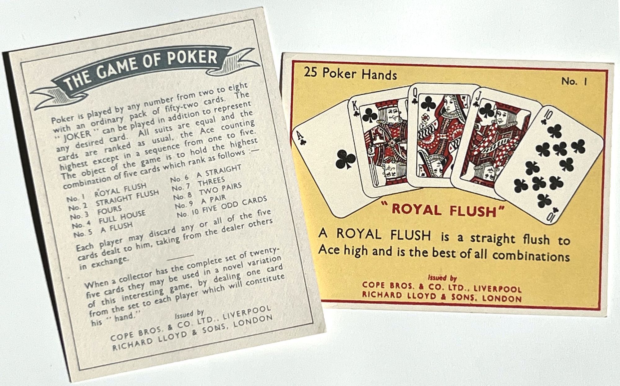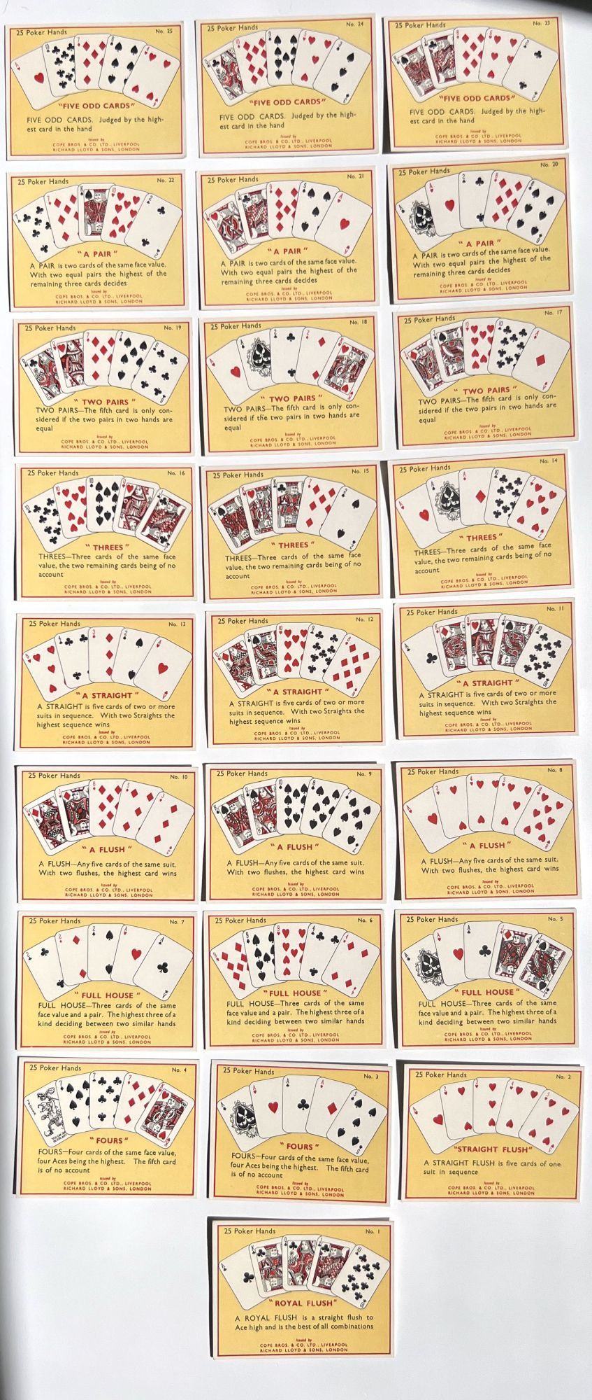 Liverpool and London: Cope Bros. & Co., Richard Lloyd & Sons, 1920. Very good.. Complete set of 25 color-printed cards illustrating different poker hands. Each recto has a different hand, its name, and a brief description of how to play poker on its verso. Each measures approx. 2.25" by 3
