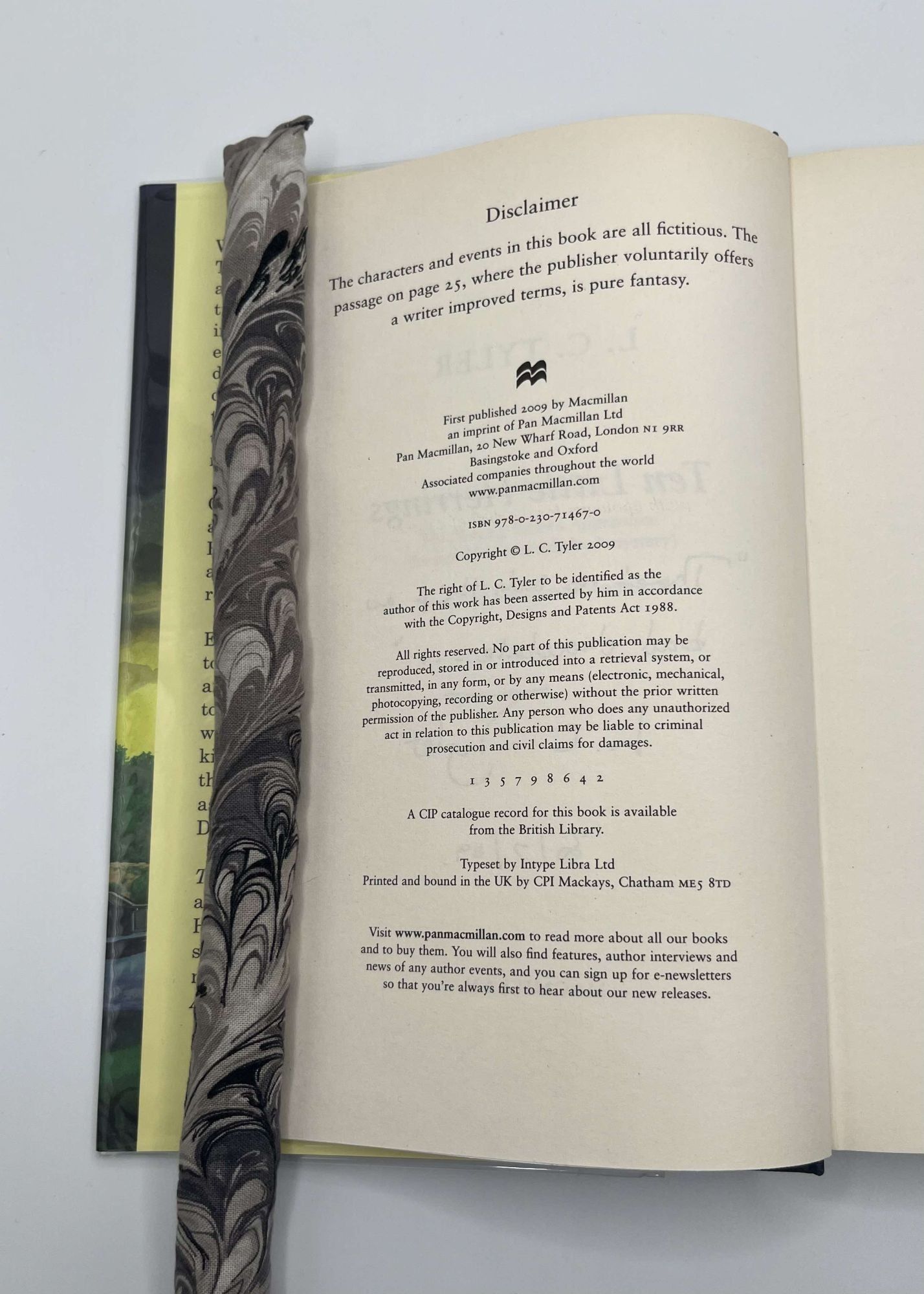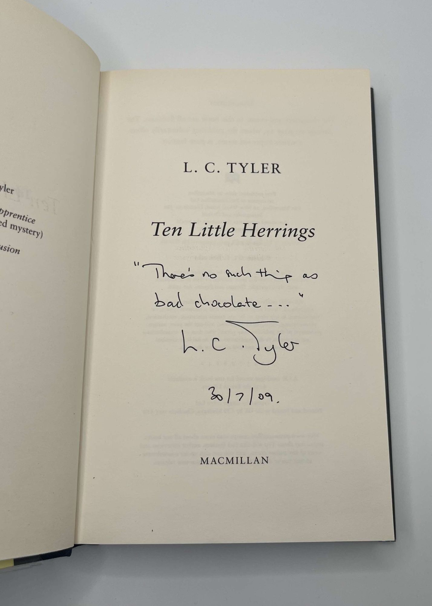 London, UK: Macmillan, 2009. First Edition, First Printing. Hardcover. Octavo, 248 pages. In Very Good condition with Near Fine condition dust jacket. Spine is purple with white and red lettering. Dust jacket protected by mylar covering, price uncut: "£16.99" on front flap. Boards have mild shelving wear along spine tail. Signed "there's no such thing as bad chocolate" and dated "30/7/09" on title page by L.C. Tyler. Shelved in hallway. 1391330. Special Collections.