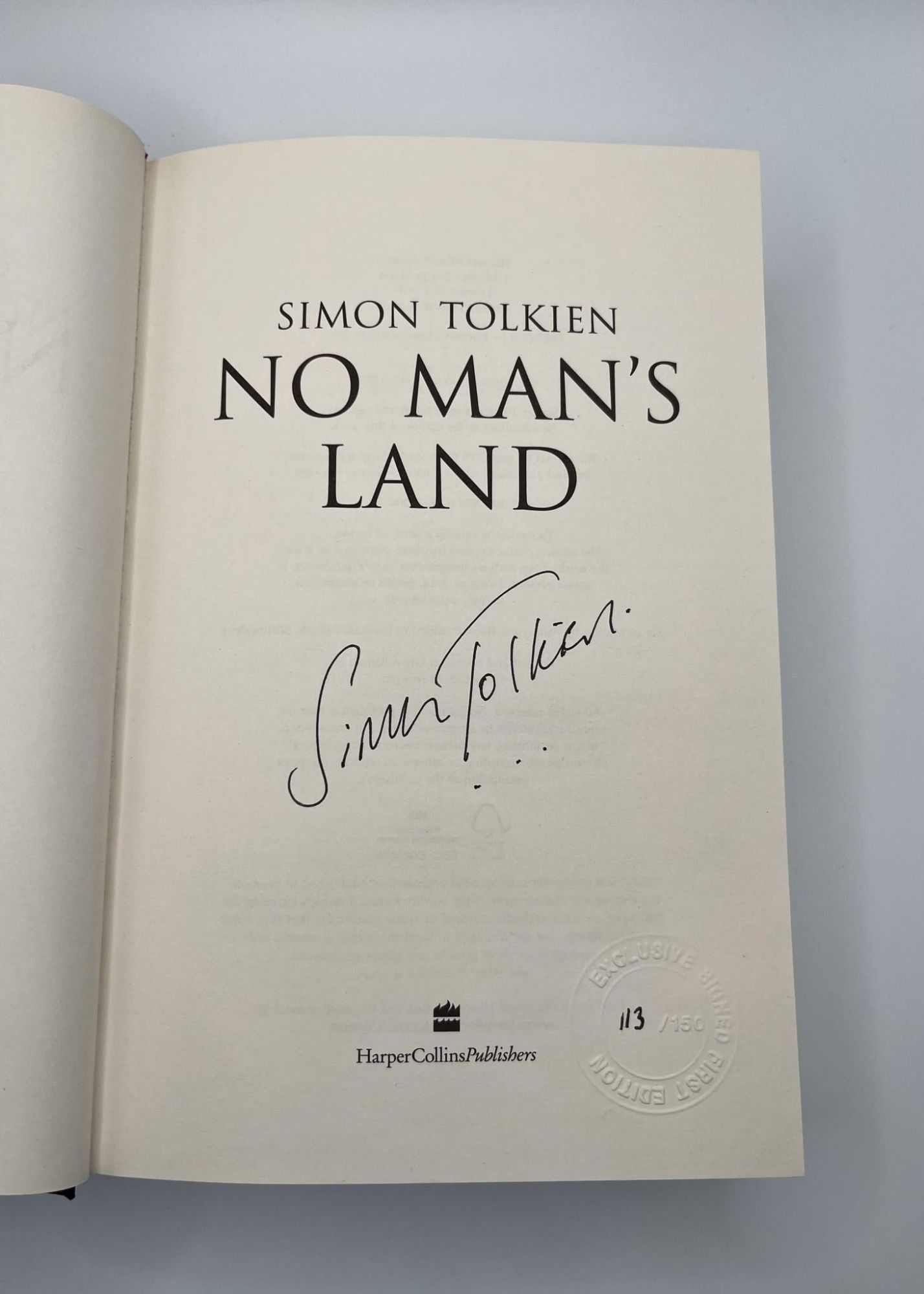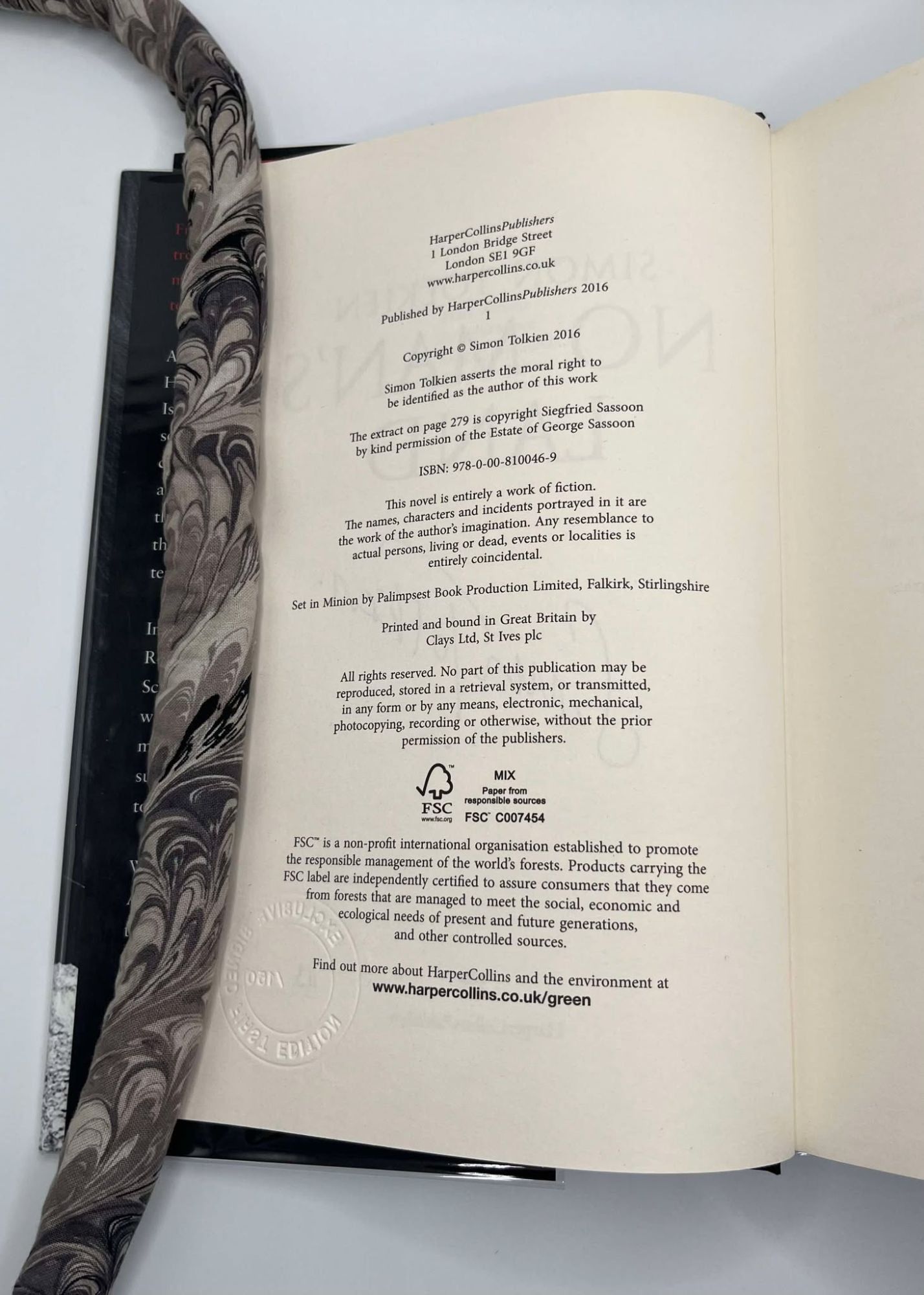 London, UK: HarperCollins, 2016. Limited Edition #113/150. Hardcover. Octavo, 566 pages. In Very Good condition with Near Fine condition dust jacket. Spine is black and white with white and red lettering. Dust jacket protected by mylar covering, price uncut: "£20" on front flap. Boards have mild shelving wear along extremities. Signed flat by Simon Tolkien on title page. Shelved in hallway. 1391432. Special Collections.