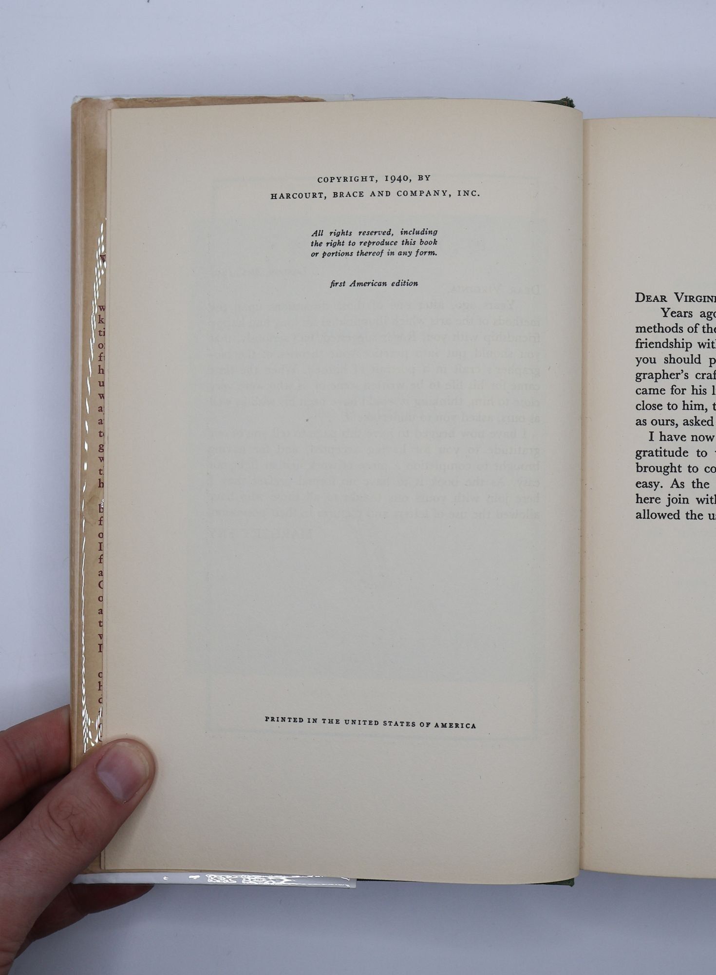 New York: Harcourt, Brace and Company, 1940. First American Edition. Hardcover. Octavo, 307 pages. In Very Good minus condition with a Good plus dust jacket. Spine red and tan with red lettering. Dust jacket protected in mylar covering, with price uncut: "$3.50." Mild shelf wear. Significant sunning to covers, with chipping along edges and soiling to rear cover. Tearing to front free endpaper from previous adhesive. Toning to interior pages. Shelved in Case 12. 1391476. Shelved Dupont Bookstore.