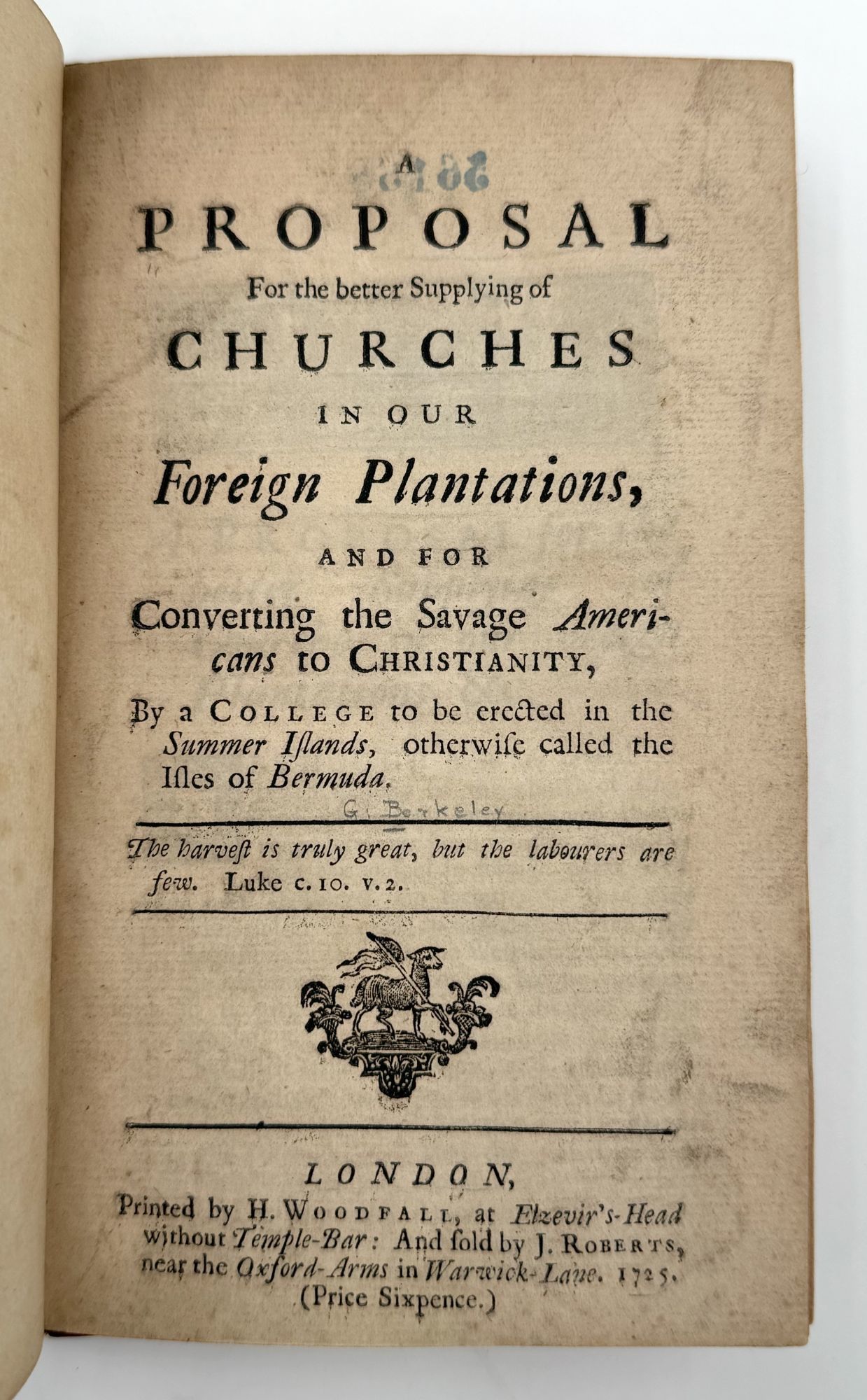 London: H. Woodfall, 1725. 24pp. 8vo. Nineteenth century half red morocco and marbled boards, minor wear. Numerical stamp on verso of title, bookplate. 24pp. 8vo. Proposes the creation of a college in Bermuda for training young American Indians to serve as missionaries throughout the British colonies. First published the year prior. Scarce. ESTC T14337; Sabin 4878