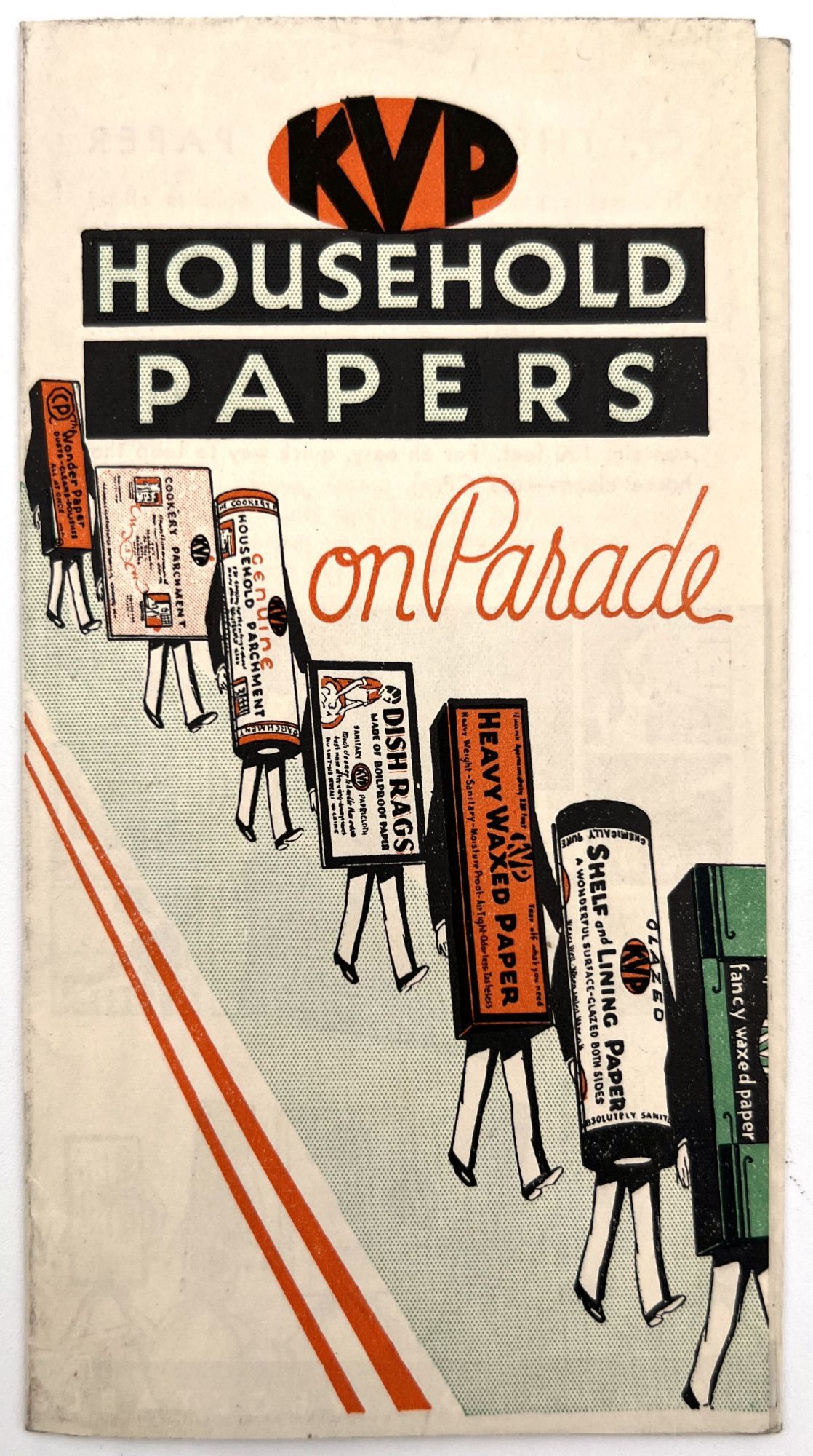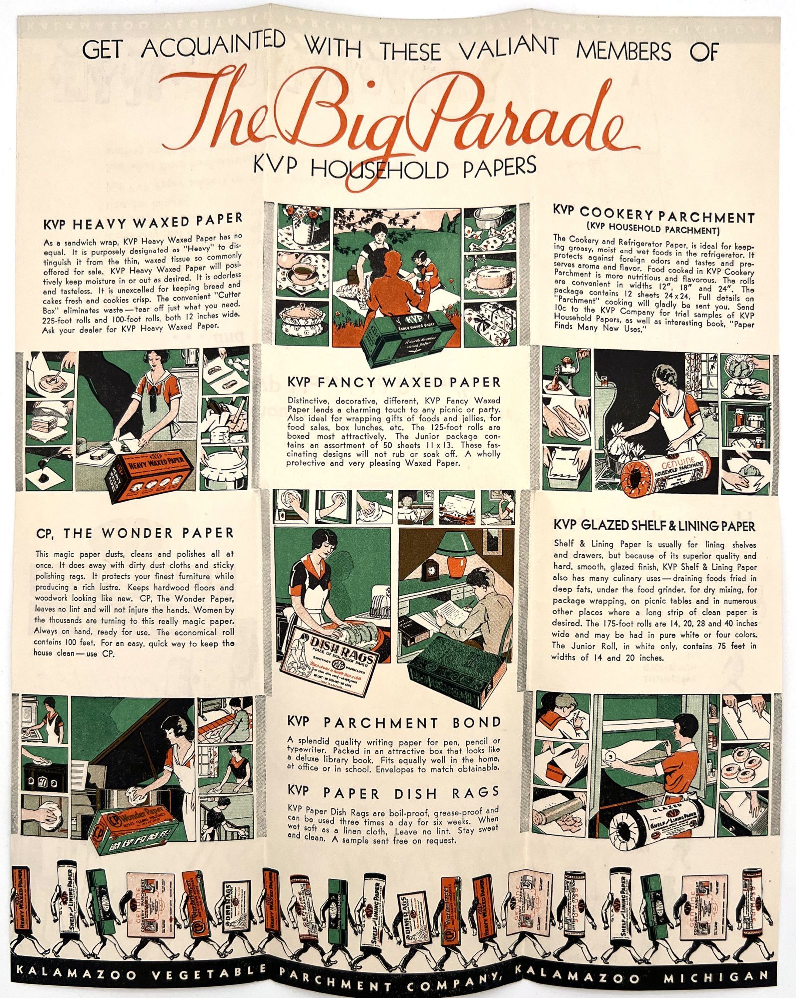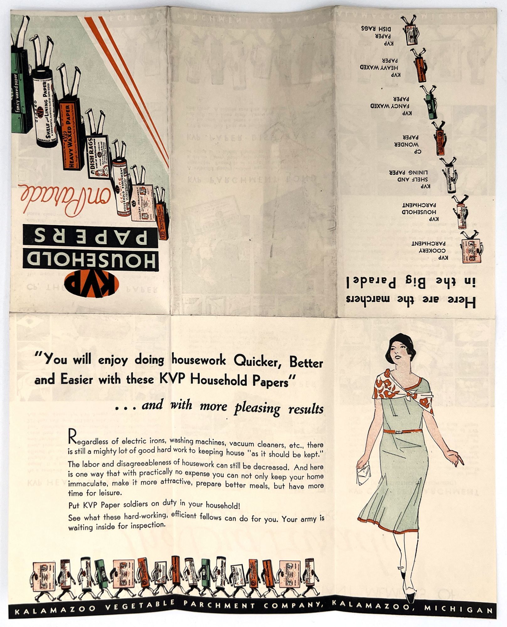 Kalamazoo, Michigan: Kalamazoo Vegetable Parchment Company, 1930. Very good. Minor dust soiling.. Illustrated advertising poster for wax paper, parchment paper, and other products sold by the Kalamazoo Vegetable Parchment Company, promising housewives "You will enjoy doing housework Quicker, Better and Easier ... and with more pleasing results". Illustrations of the products march along the bottom of the poster with the directive, "See what these hard-working efficient fellows can do for you. Your army is waiting inside for inspection". Foldout measures 6.25" by 3.5" folded, 12.5" by 10" unfolded, illustrated and printed in black, orange, green.