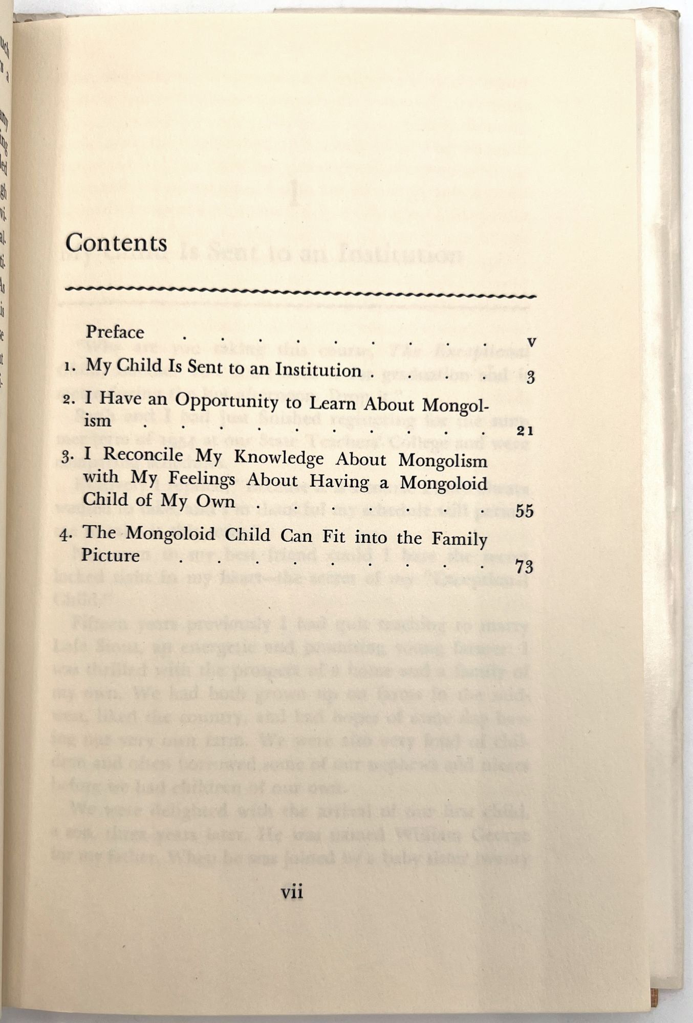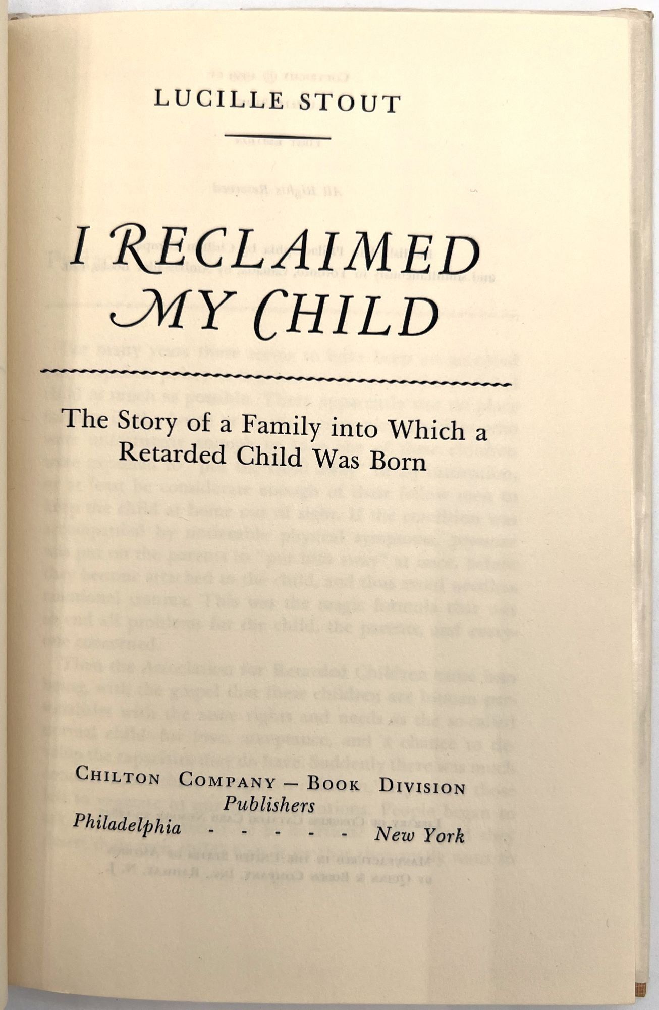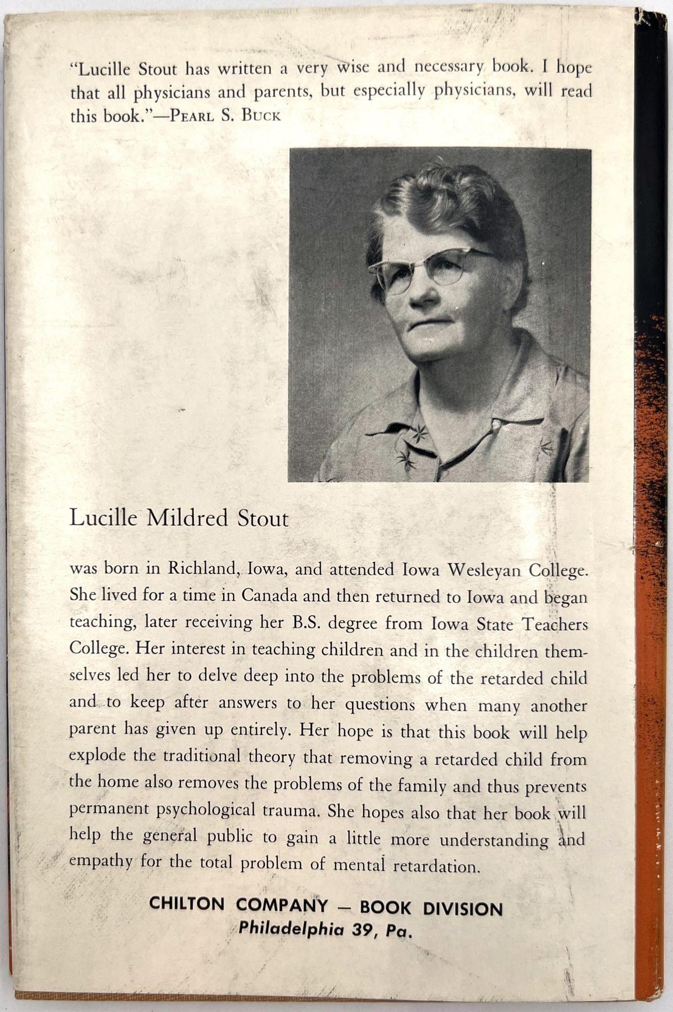 Philadelphia, Pennsylvania: Chilton Company, 1959. Near-fine; one small short tear to dust jacket, wear to head and tail of jacket.. First edition of a "simply and beautifully written story of a family into which a r******d child was born", in which a mother turns a perceived tragedy--the birth of a child with Down Syndrome--into a triumph and a blessing. As always with books written on the subject of mental illness or differently-abled people in the 1950s, the book uses the "R" word frequently, as well as the term "Mongoloid Child" to refer to a person with Down Syndrome/trisomy 21. Both of these terms were perceived to be acceptable at the time, and were not slurs or derogatory terms as they are today. Single vol. (8.25" by 5.5"), pp. 89, [1], original light orange publisher's cloth printed in black on spine, with original illustrated dust jacket. Not price clipped. An important account of motherhood and negotiating with ableism and ableist sentiments-- whether in society, or the self.