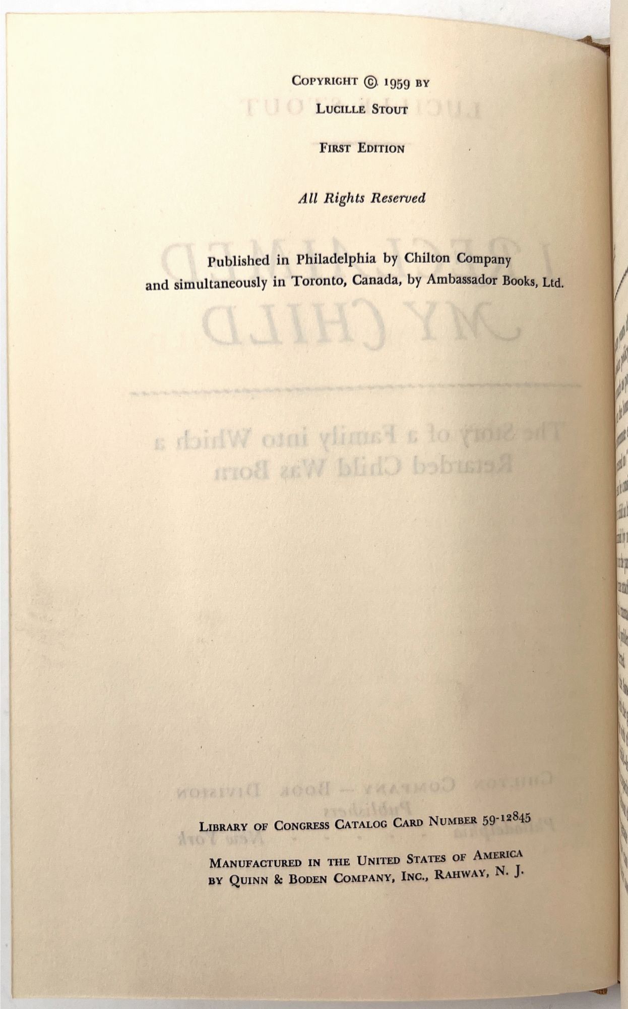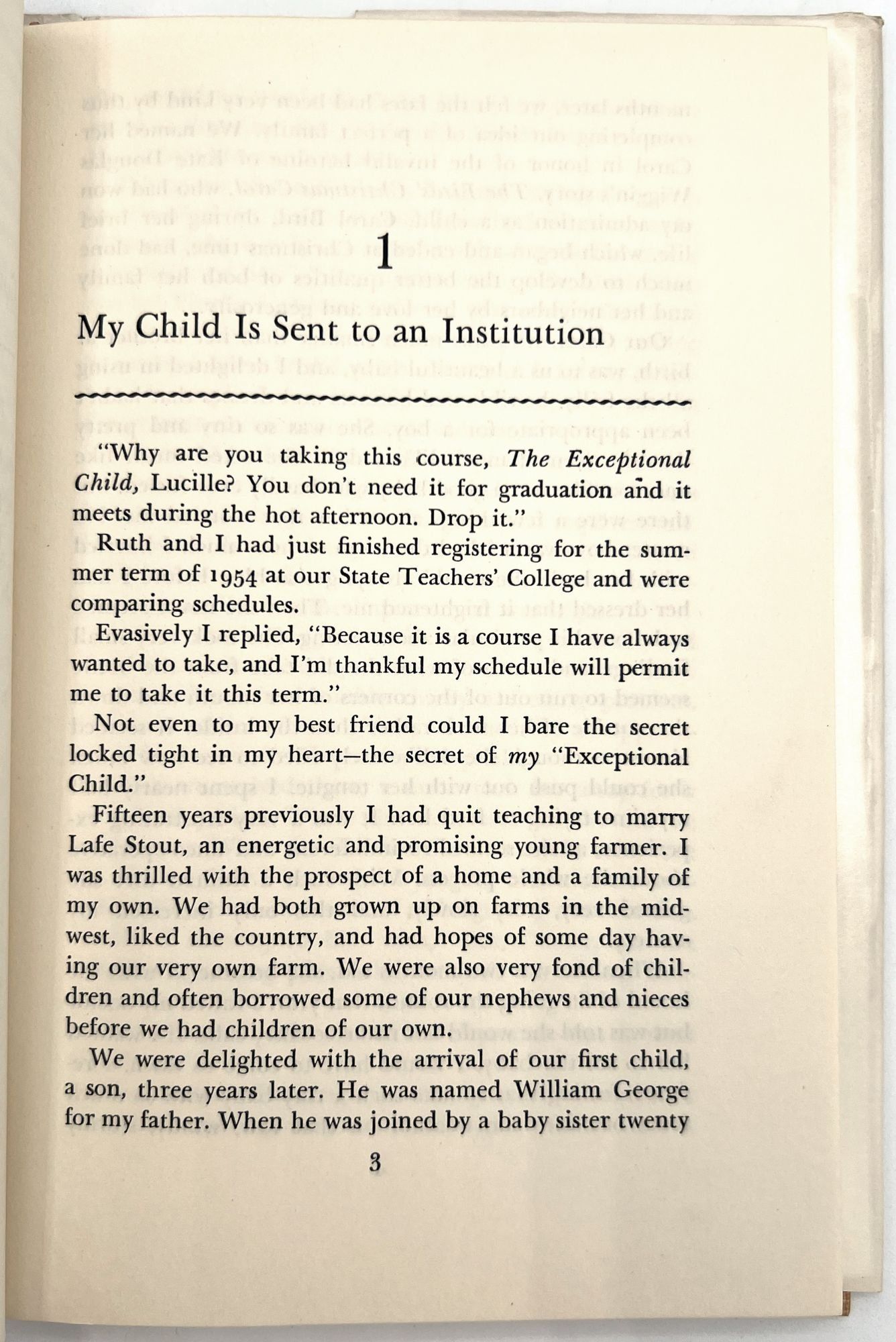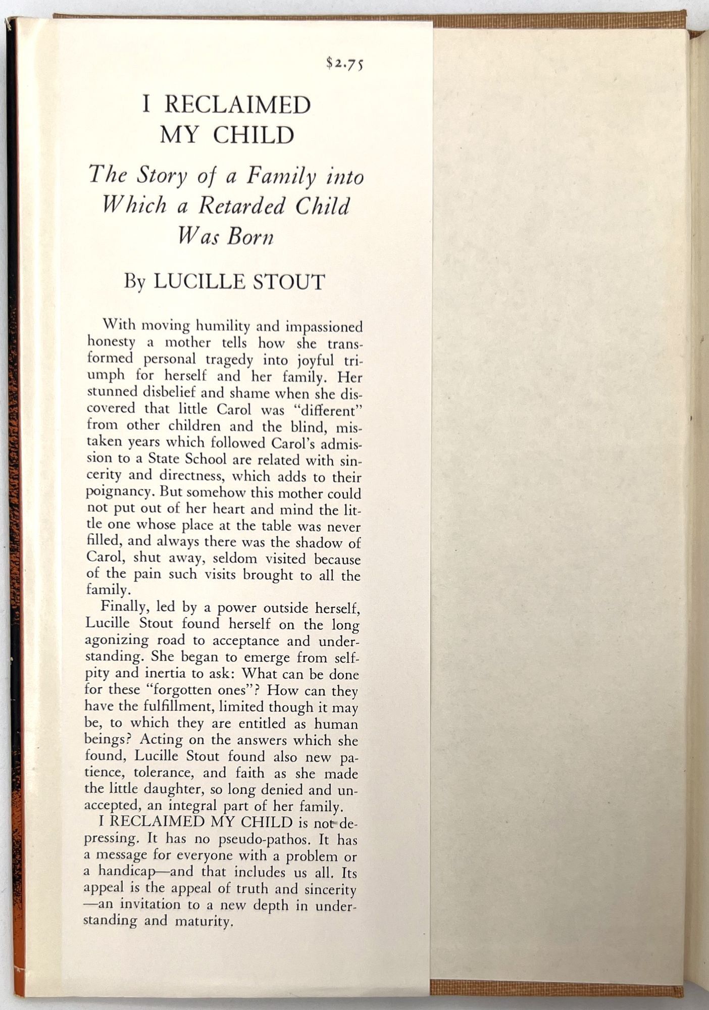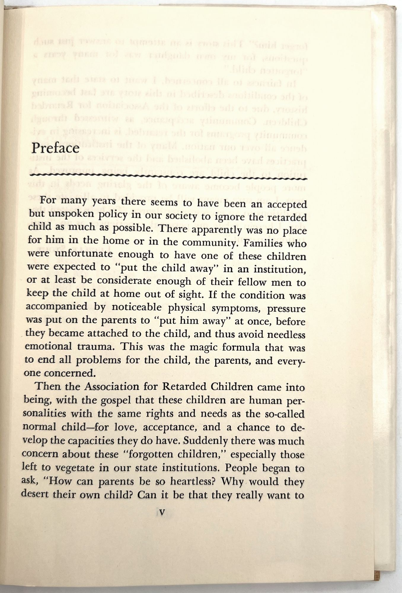 Philadelphia, Pennsylvania: Chilton Company, 1959. Near-fine; one small short tear to dust jacket, wear to head and tail of jacket.. First edition of a "simply and beautifully written story of a family into which a r******d child was born", in which a mother turns a perceived tragedy--the birth of a child with Down Syndrome--into a triumph and a blessing. As always with books written on the subject of mental illness or differently-abled people in the 1950s, the book uses the "R" word frequently, as well as the term "Mongoloid Child" to refer to a person with Down Syndrome/trisomy 21. Both of these terms were perceived to be acceptable at the time, and were not slurs or derogatory terms as they are today. Single vol. (8.25" by 5.5"), pp. 89, [1], original light orange publisher's cloth printed in black on spine, with original illustrated dust jacket. Not price clipped. An important account of motherhood and negotiating with ableism and ableist sentiments-- whether in society, or the self.