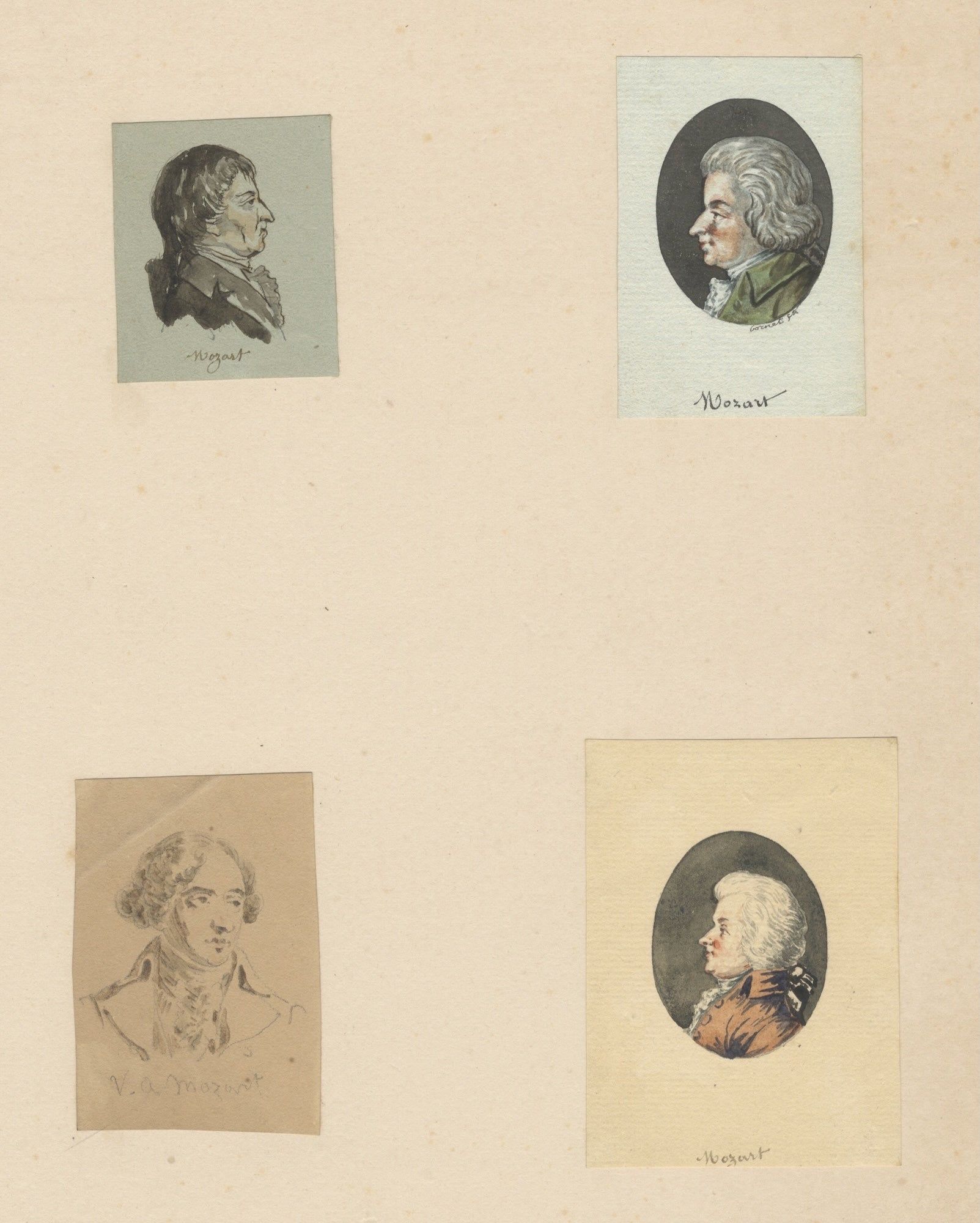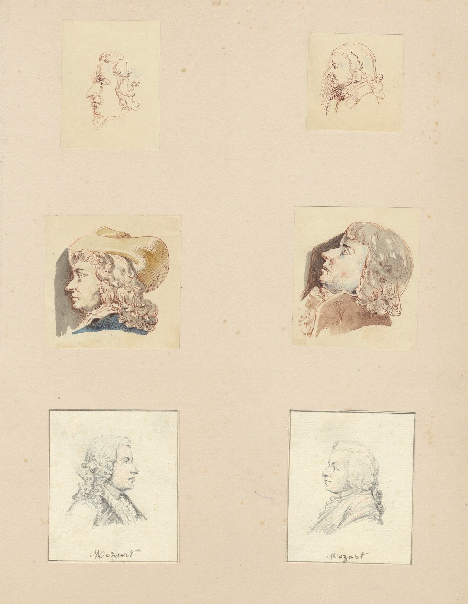By various artists; one drawing signed "G.N.," another signed "Cornet." Early to mid-19th century, possibly earlier, most likely French, with contemporary identification ("Mozart") to either recto or verso. Sizes range from ca. 65 x 50 mm to 155 x 130 mm. Laid down to heavy gilt-edged mounting paper, sheet size ca. 387 x 314 mm. 5ff. in total.