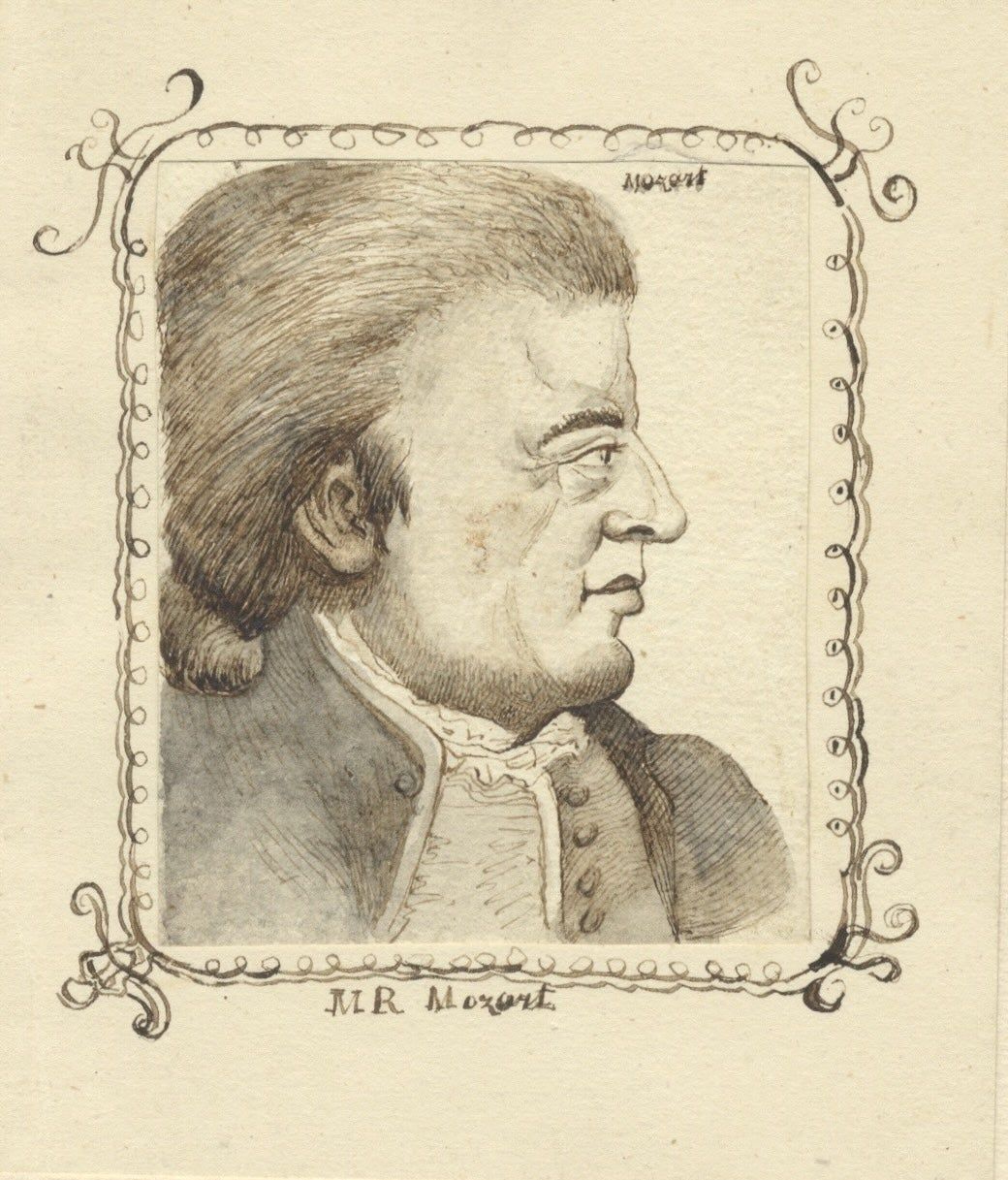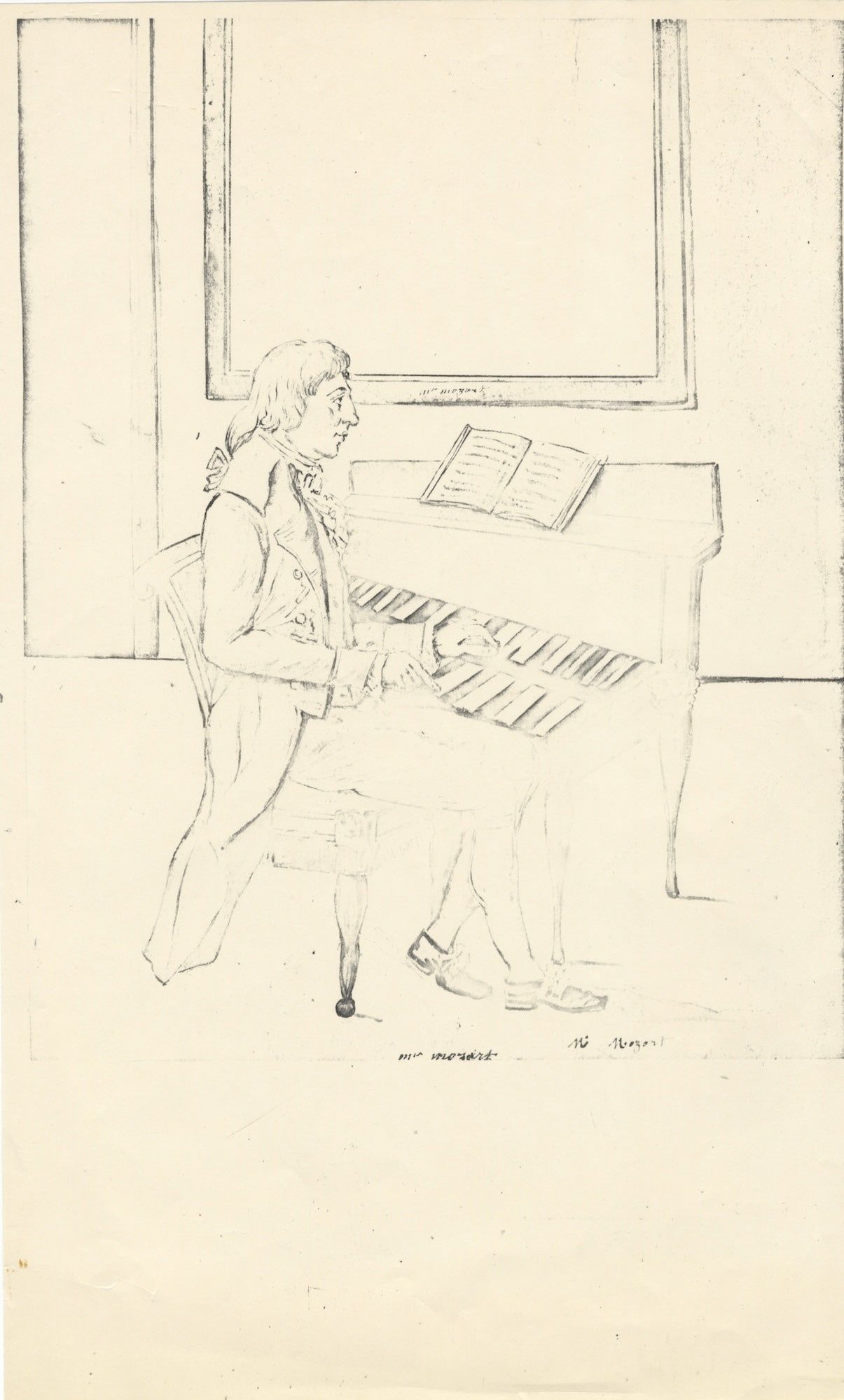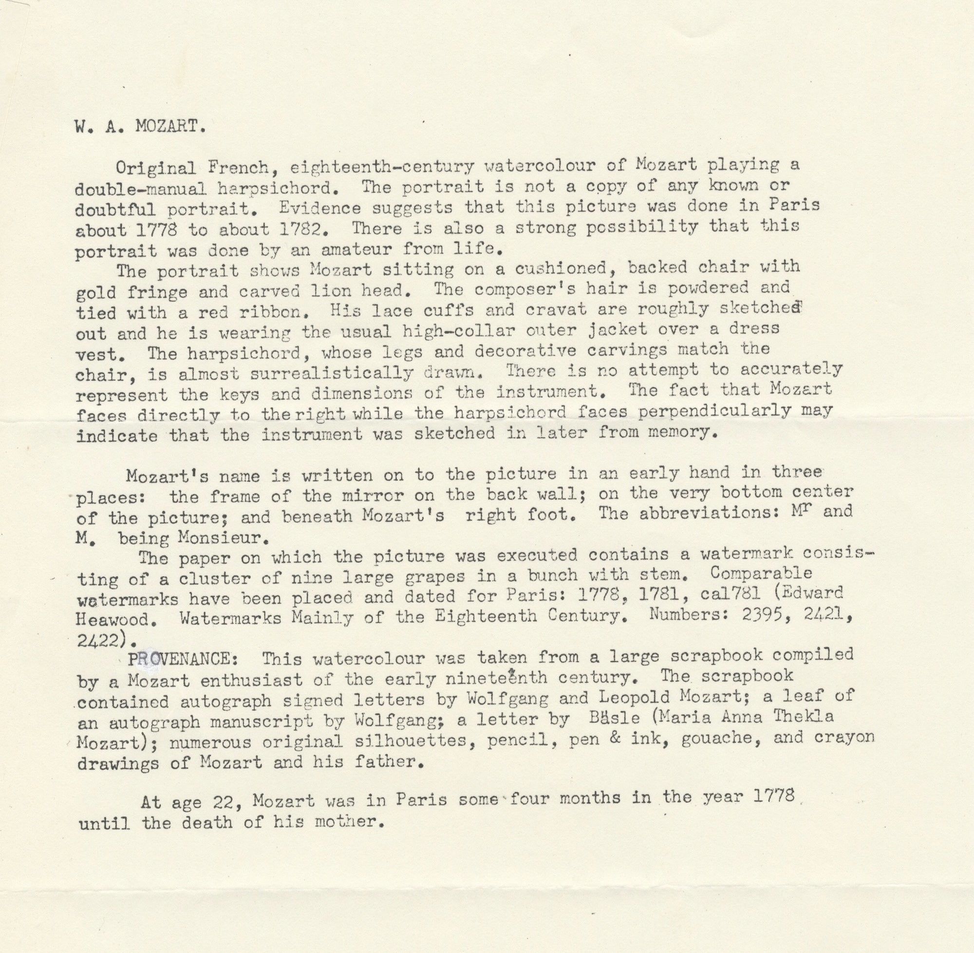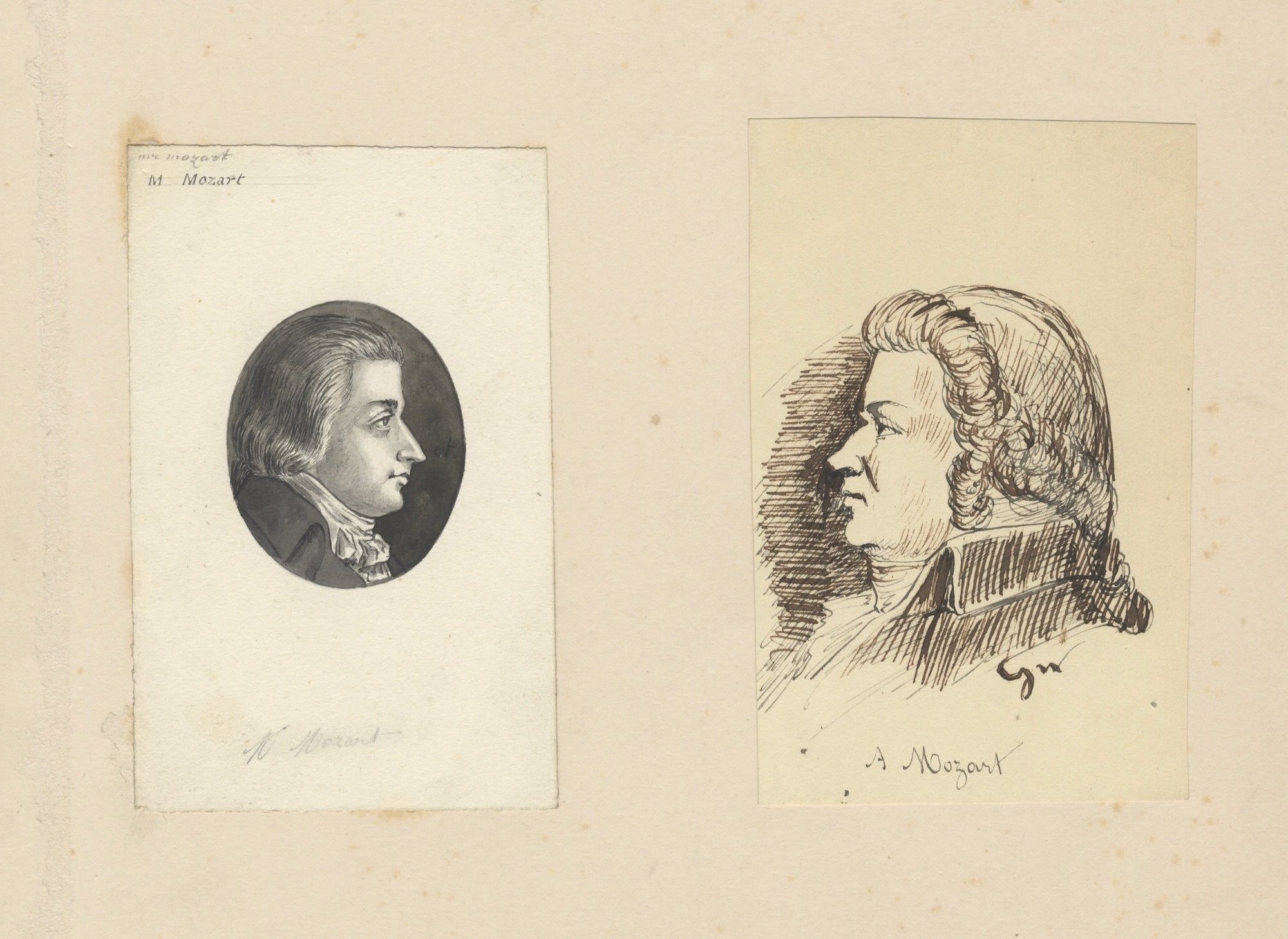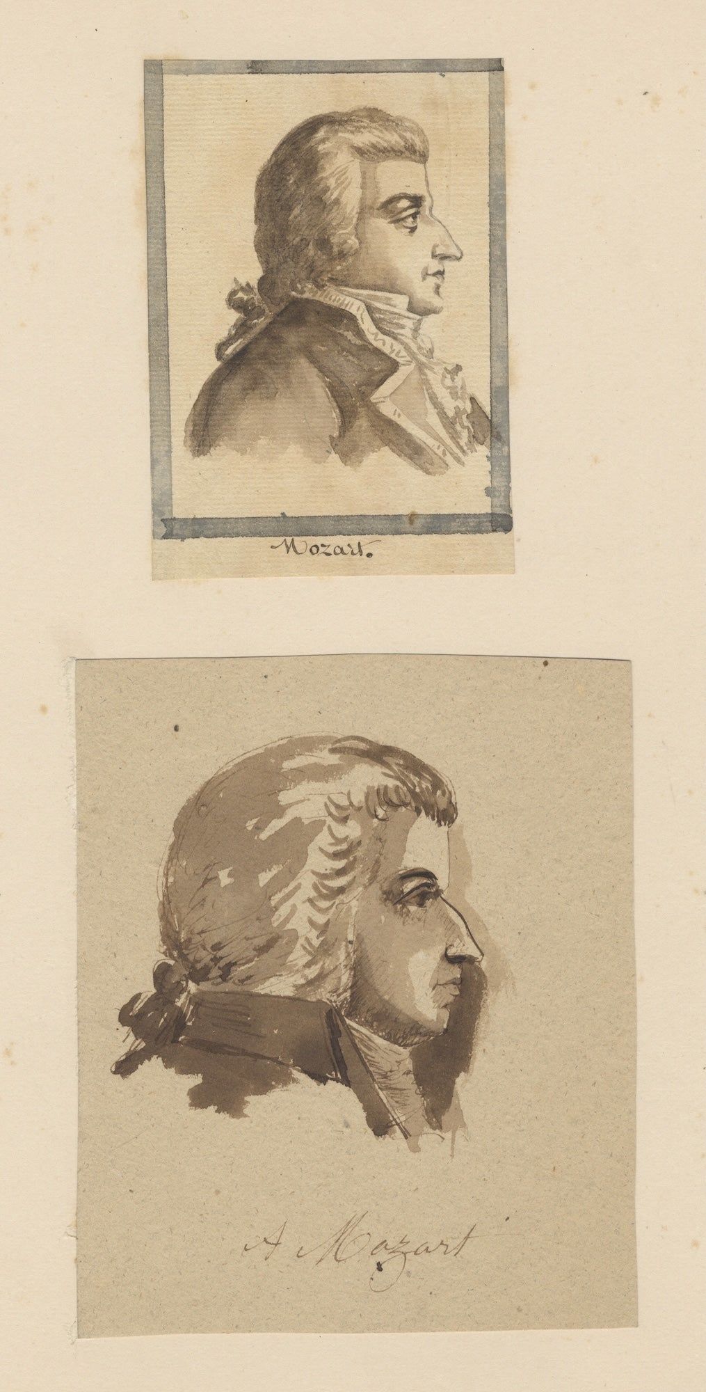 According to typed notes accompanying the drawings, these single leaves are from a large scrapbook compiled by an early 19th century Mozart enthusiast that originally included an autograph manuscript of Wolfgang and autograph letters of both Wolfgang and Leopold Mozart.