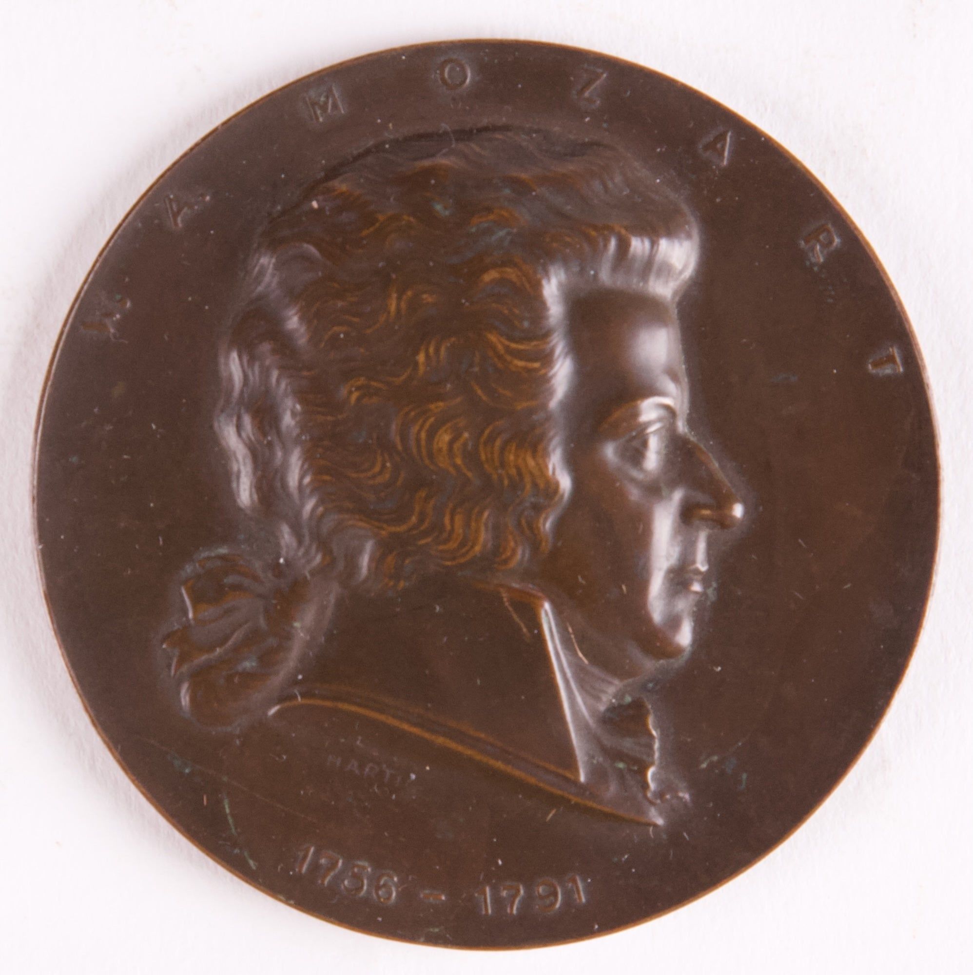 Circular bronze medal with relief portrait of Mozart in profile designed by A. Hartig after the Leonhard Posch wax profile of 1788. Issued in 1956 to celebrate the 200th anniversary of the composer's birth
