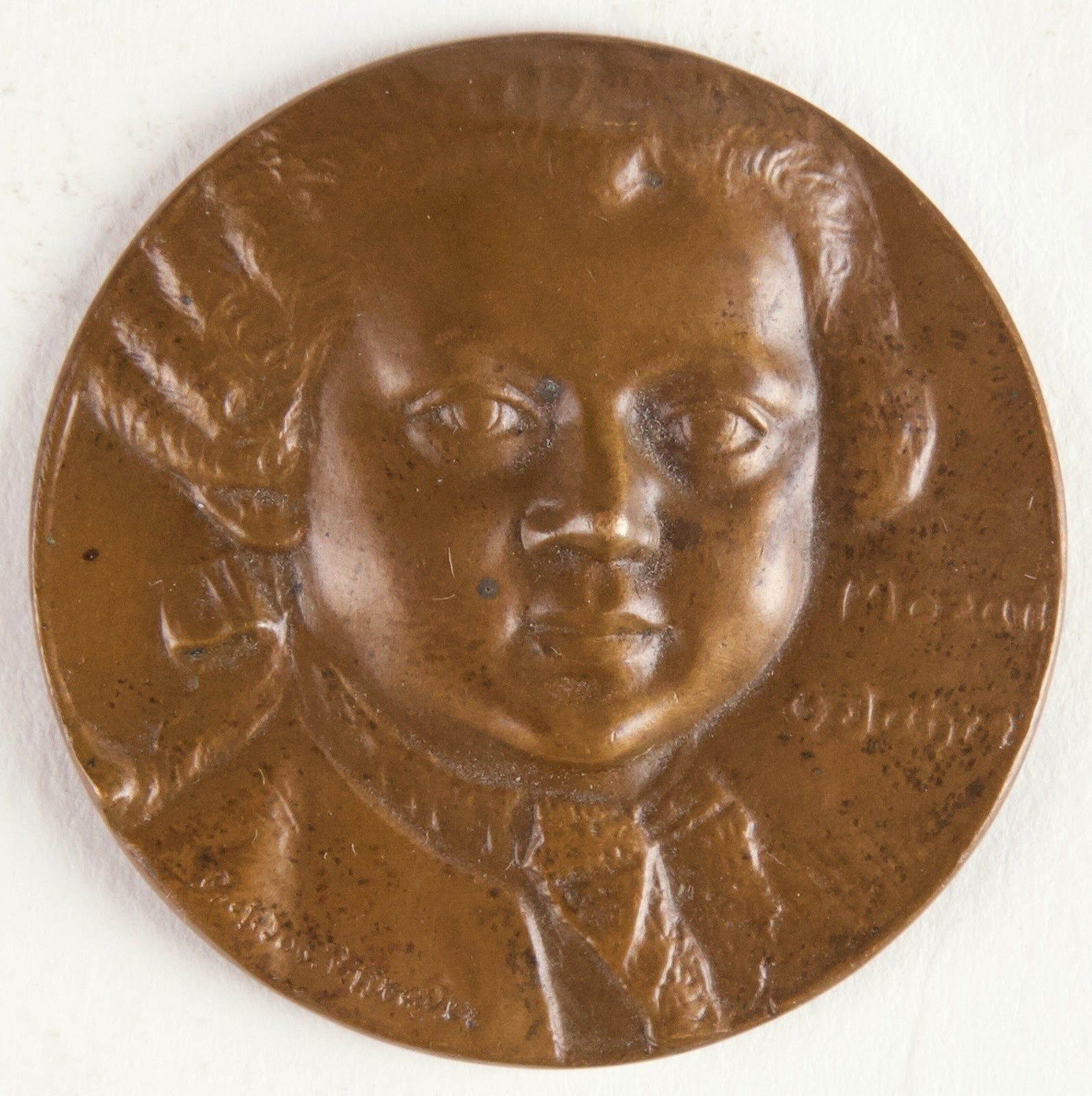 Bronze medal head-and-shoulders relief portrait of Mozart at 6 years of age. Designed by J. von Sepp Piffrader (1888-1952) after the earliest authentic image of Mozart, the oil painting by Pietro Antonio Lorenzini of 1763