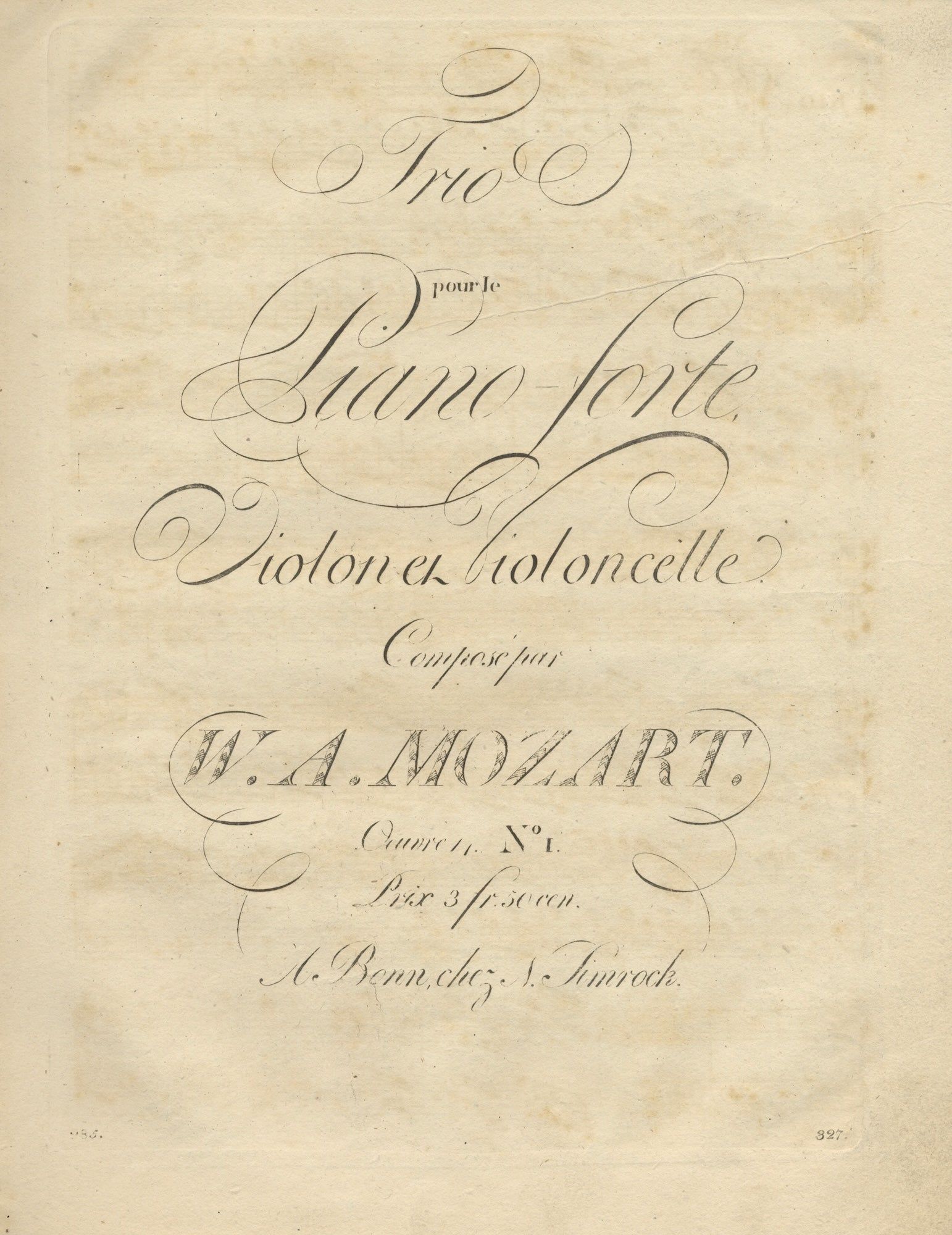 [KV 498]. Trio pour le Piano-forte, Clarinette ou Violon & Alto ... Oeuvre 14. No. 2. Prix 3 Francs. [the "Kegelstatt Trio"]. Bonn: N. Simrock [PN 286], [1803]. [Piano part only]. [i] (title), 2-14 pp. Engraved throughout.