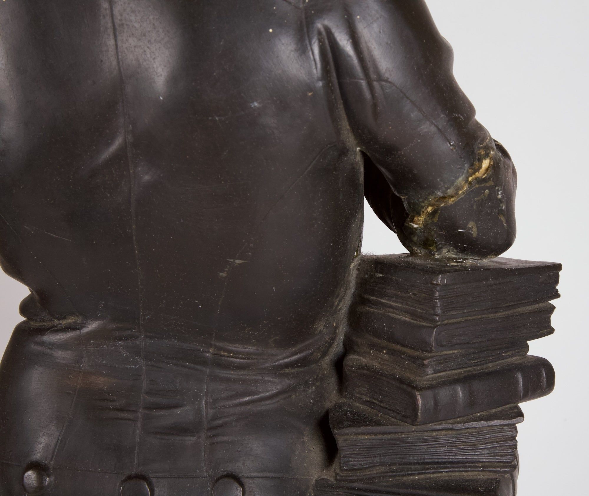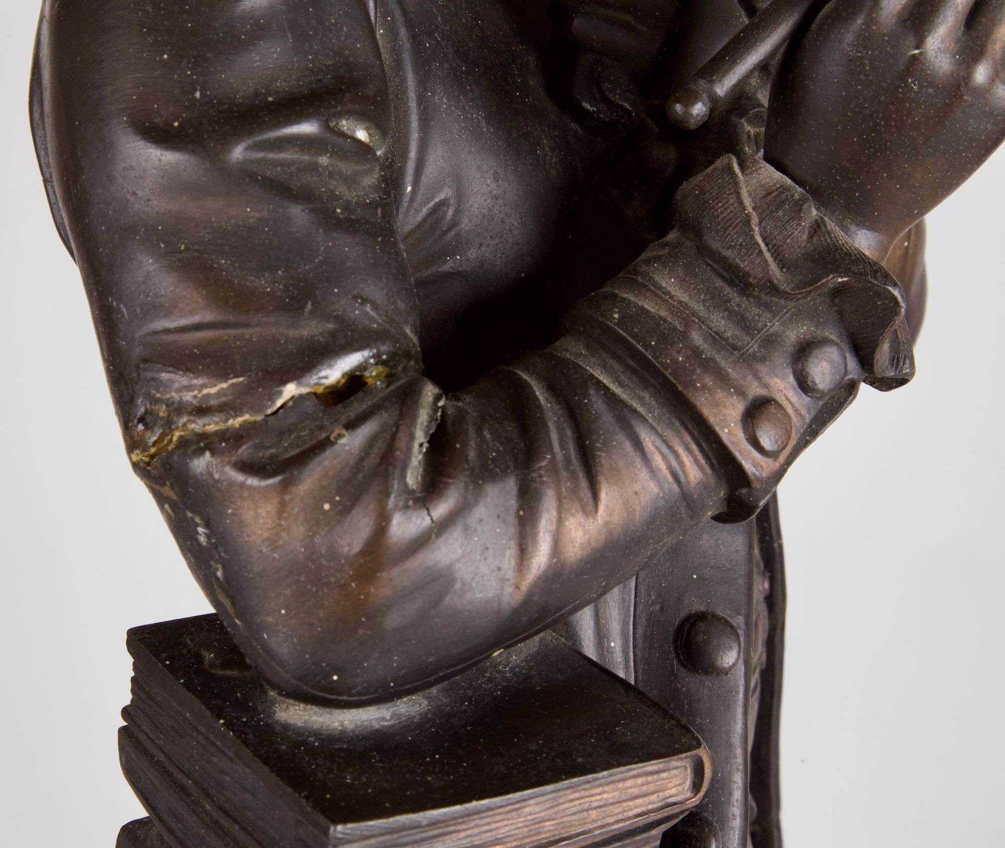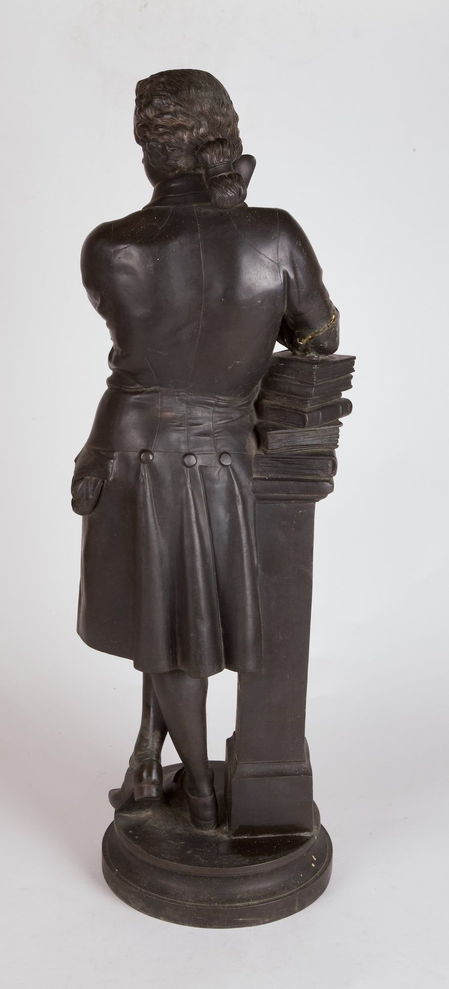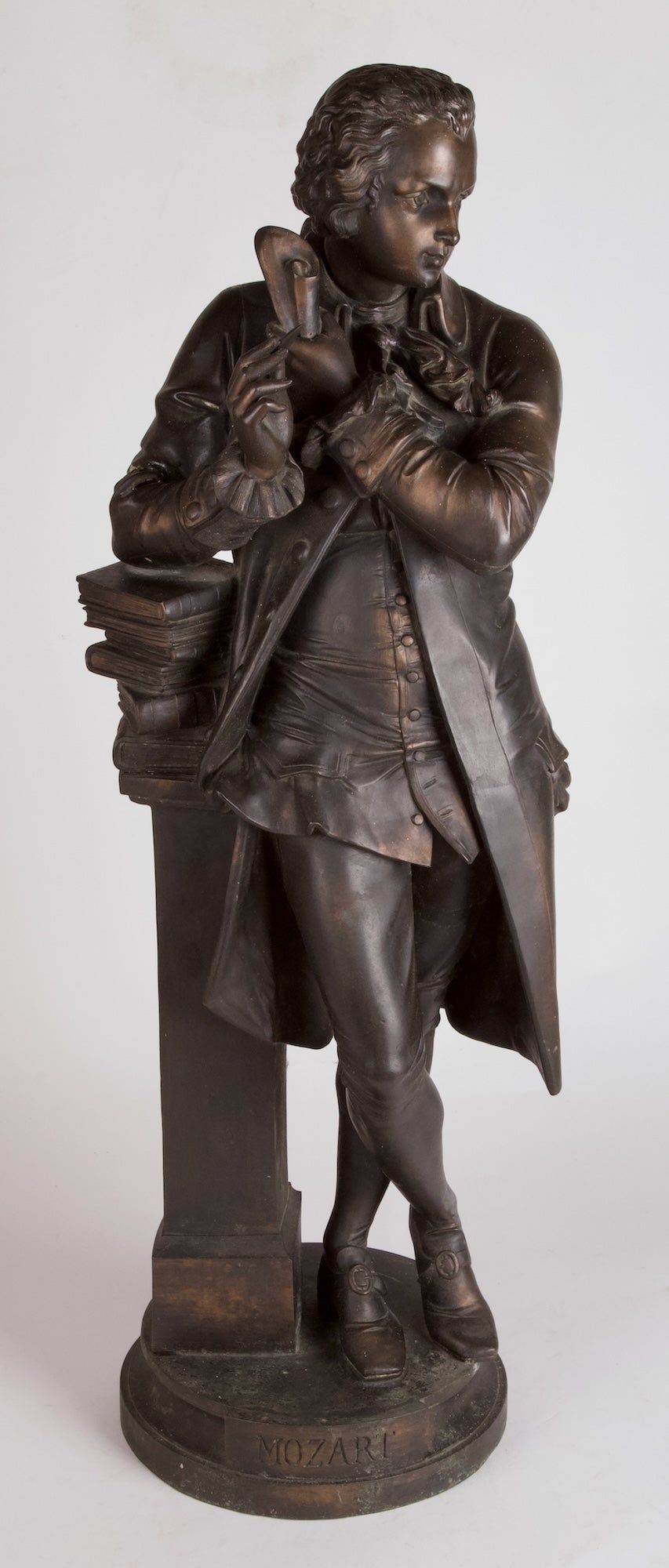 Bronze statue of Mozart full length standing and holding a rolled sheet of paper in his right hand and a writing implement in his left. 20th century