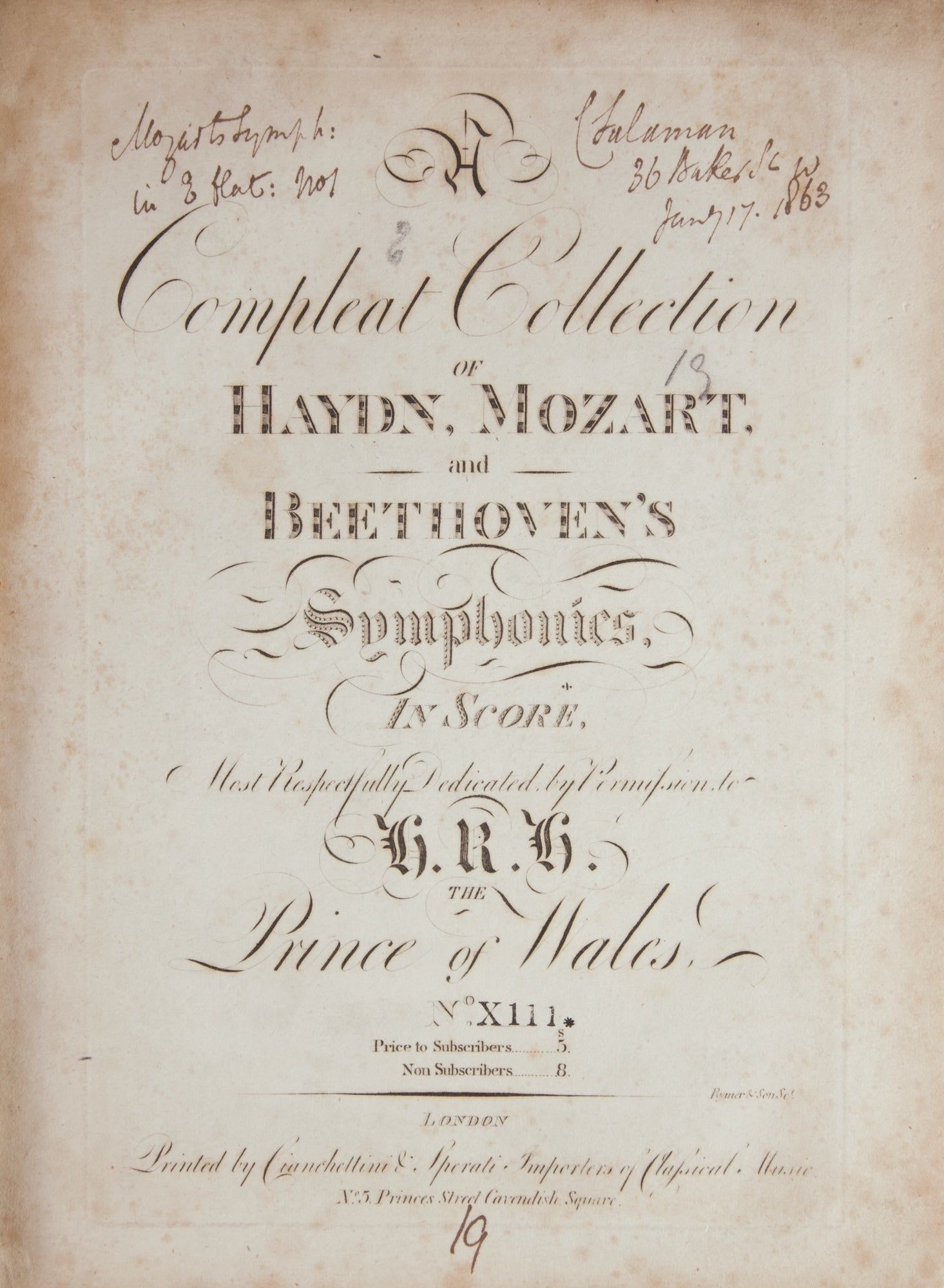 A Compleat Collection of Haydn, Mozart, and Beethoven's Symphonies, in Score, Most Respectfully Dedicated by Permission to H.R.H. The Prince of Wales No. XIII [XIV, XV, XVI]. Price to Subscribers S5 Non Subscribers 8. [KV 543, 504, 620, and 492]. Full scores, including to Symphonies 38 (the "Prague"), 39, and the overture to Die Zauberflöte
