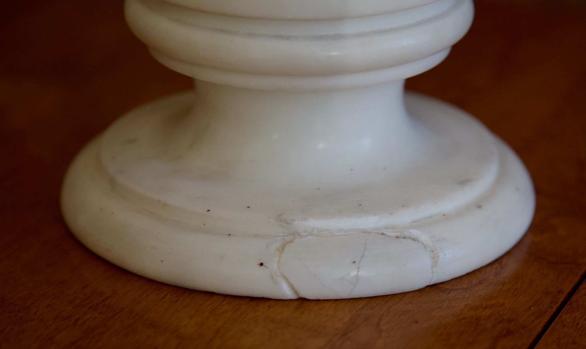 Some minor wear and soiling; several small edge chips. In very good condition overall. Together with a circular polished marble base, lower portion with significant chip and partial repair. The base is not original to the bust and is not necessary for display. We regret that this item can be shipped within the continental U.S. only. Please contact us for a shipping quotation before ordering.