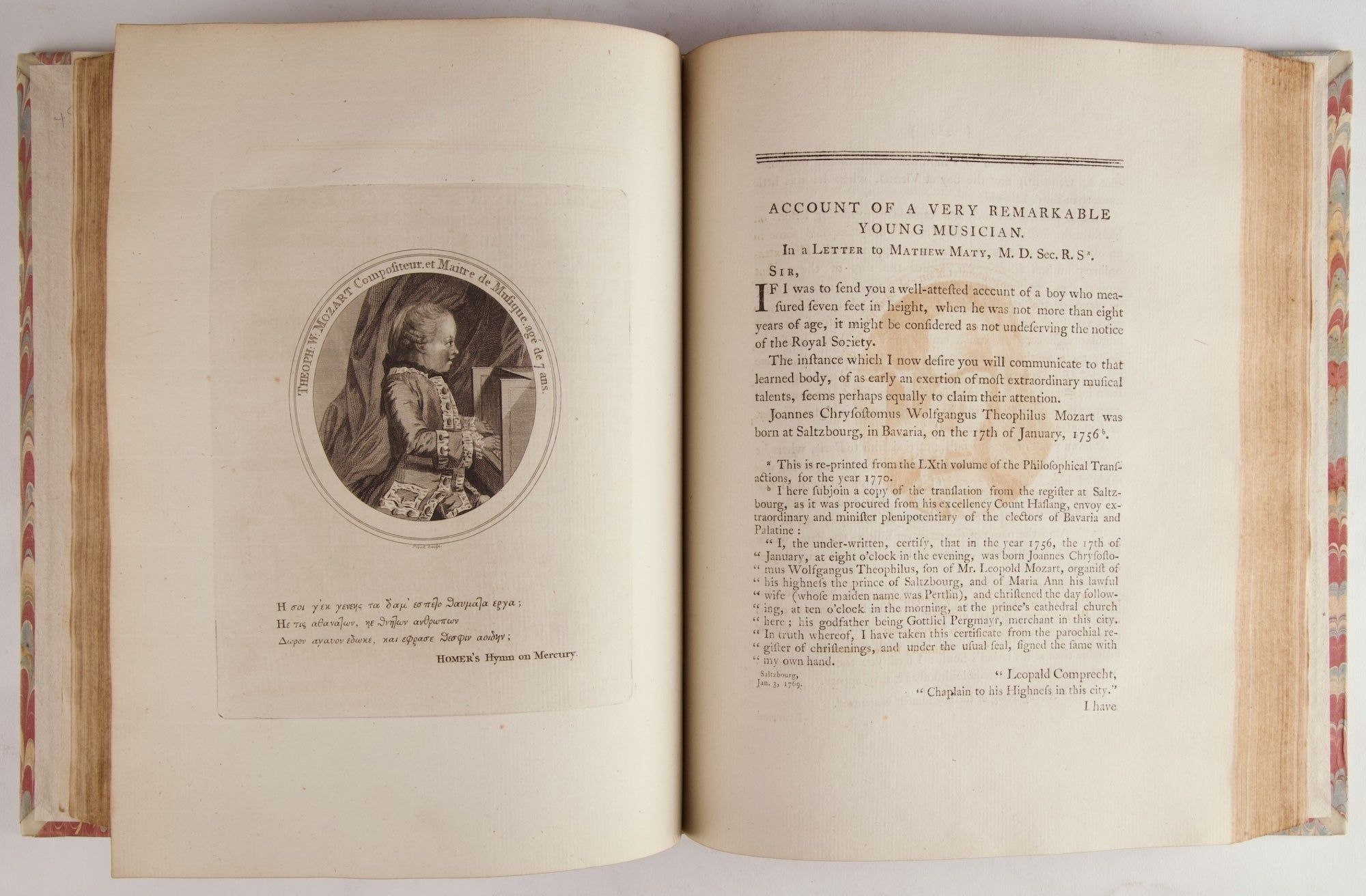 Pp. 279-288 contains Barrington's "Account of a very remarkable young musician (the 7 year old Mozart) In a Letter to Mathew Maty ... re-printed from the LXth volume of the Philosophical Transactions, for the year 1770."