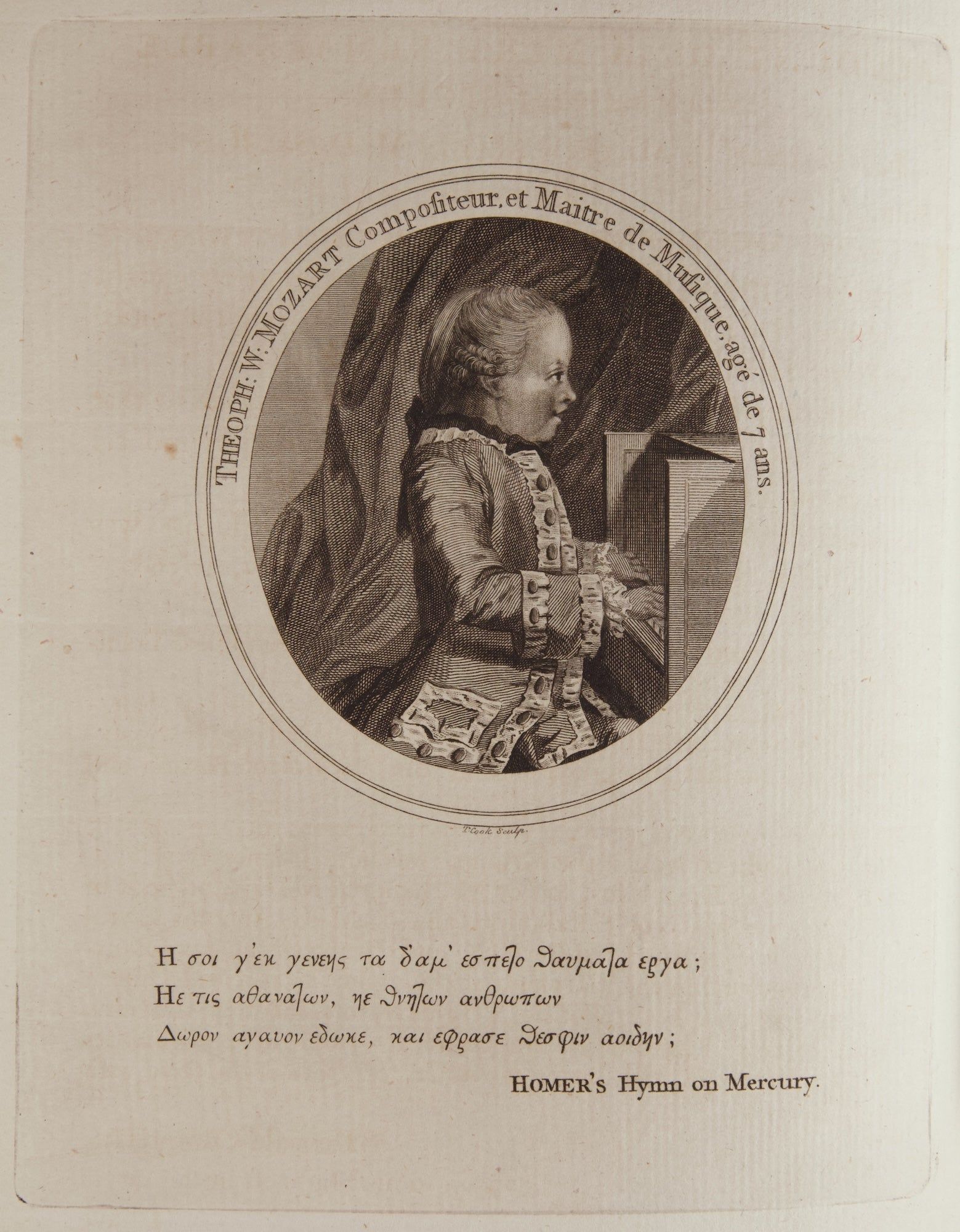 Leaf facing the first page of the account of Mozart (p. 281) with fine engraving in an oval frame by T. Cook of Mozart playing the keyboard at age 7 entitled "Theoph: W: Mozart Compositeur, et Maitre de Musique agé de 7 ans" with 3 lines of text in Greek from Homer's Hymn on Mercury from the Odyssey below the image. Image size 75 x 67 mm; size to platemark 161 x 129 mm. The present engraving is after the engraving by Delafosse of Wolfgang, Leopold, and Nannerl making music together. Bory, p. 62. Deutsch, p. 297, 5.