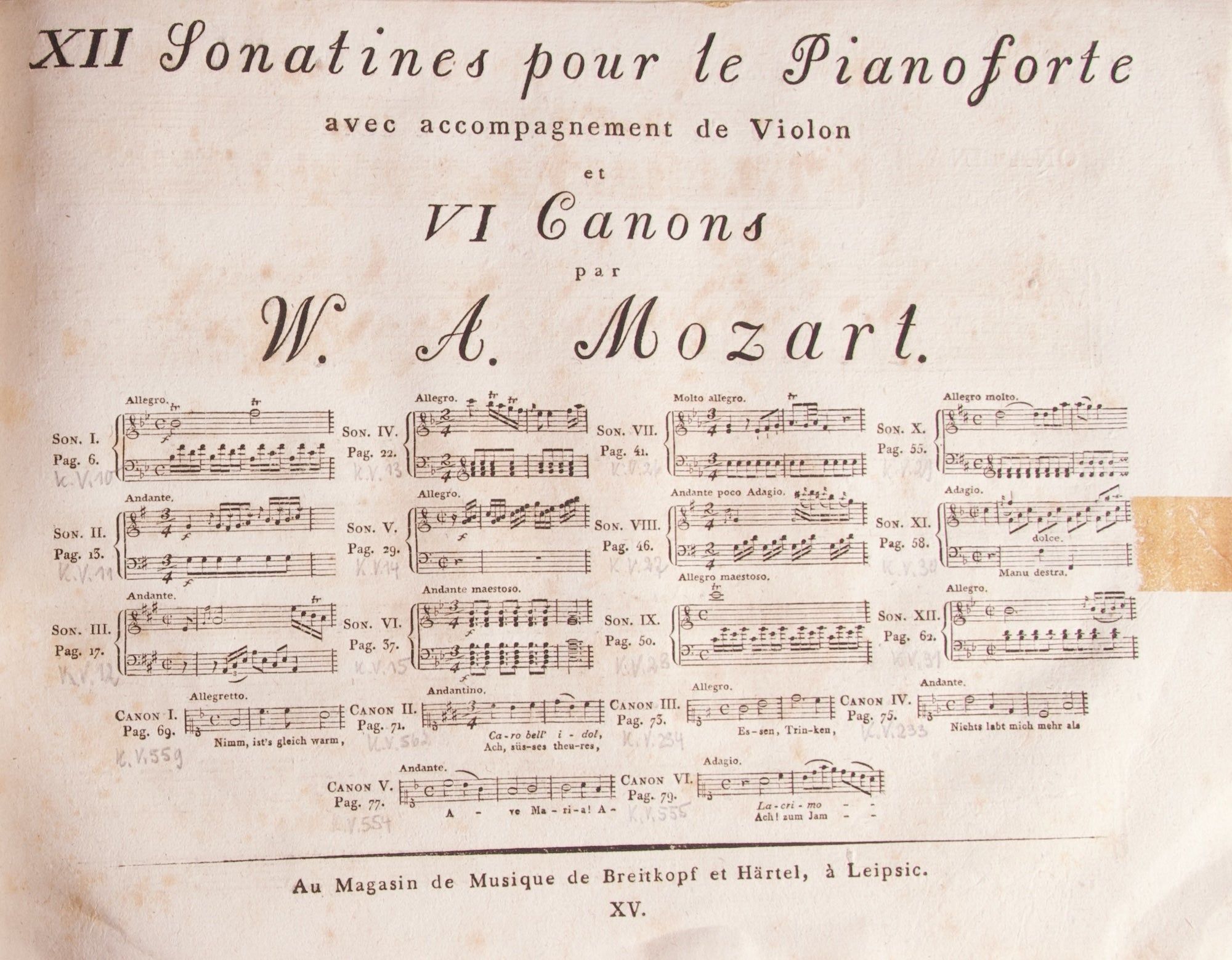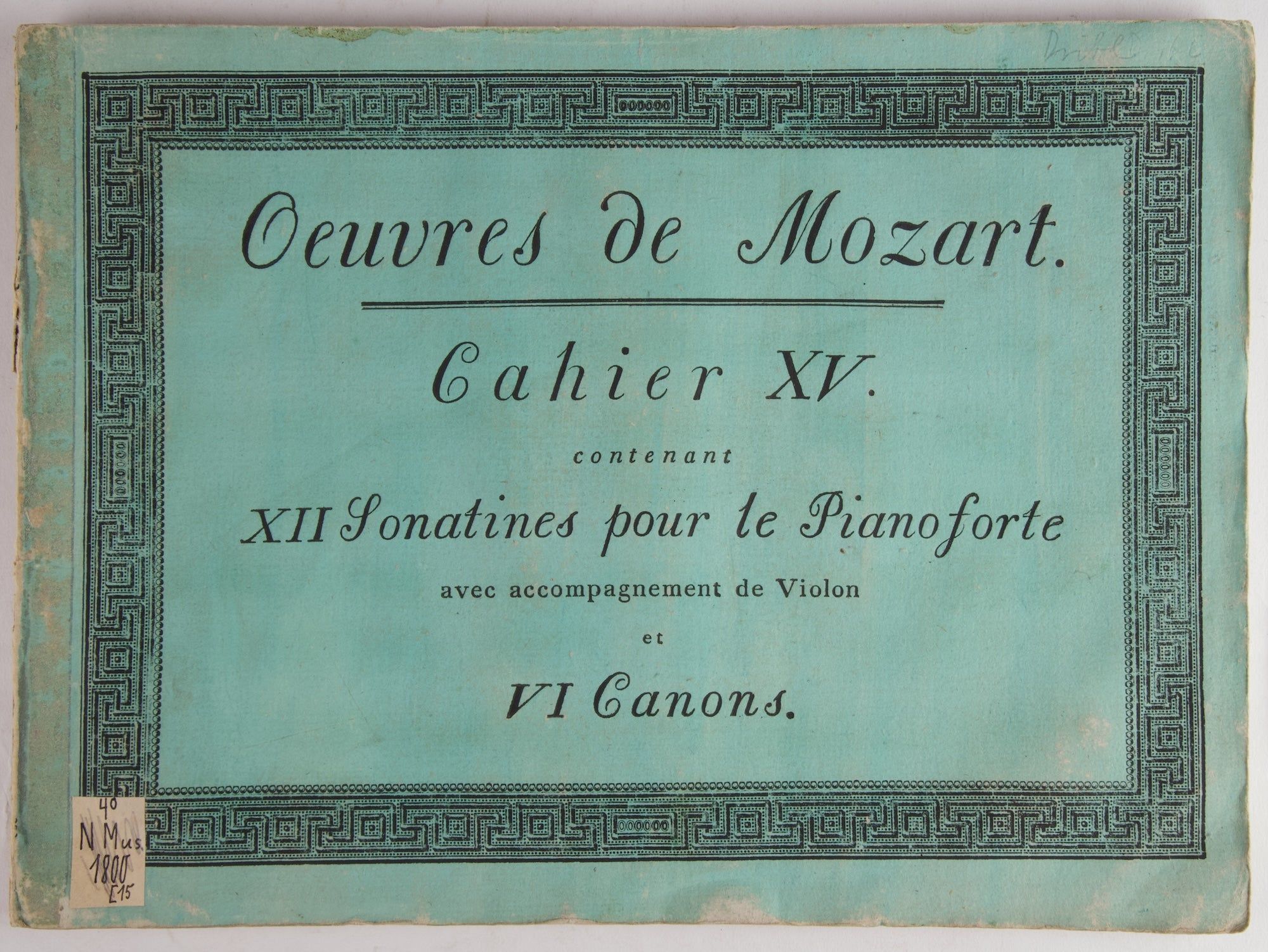 XII Sonatines pour le Pianoforte avec accompagnement de Violon [KV 10-15, 26-31] et VI Canons [KV 559, 562, Anh. A 40, Anh. A 39, 554, 555]. Oeuvres de Mozart. Cahier XV. [Parts]