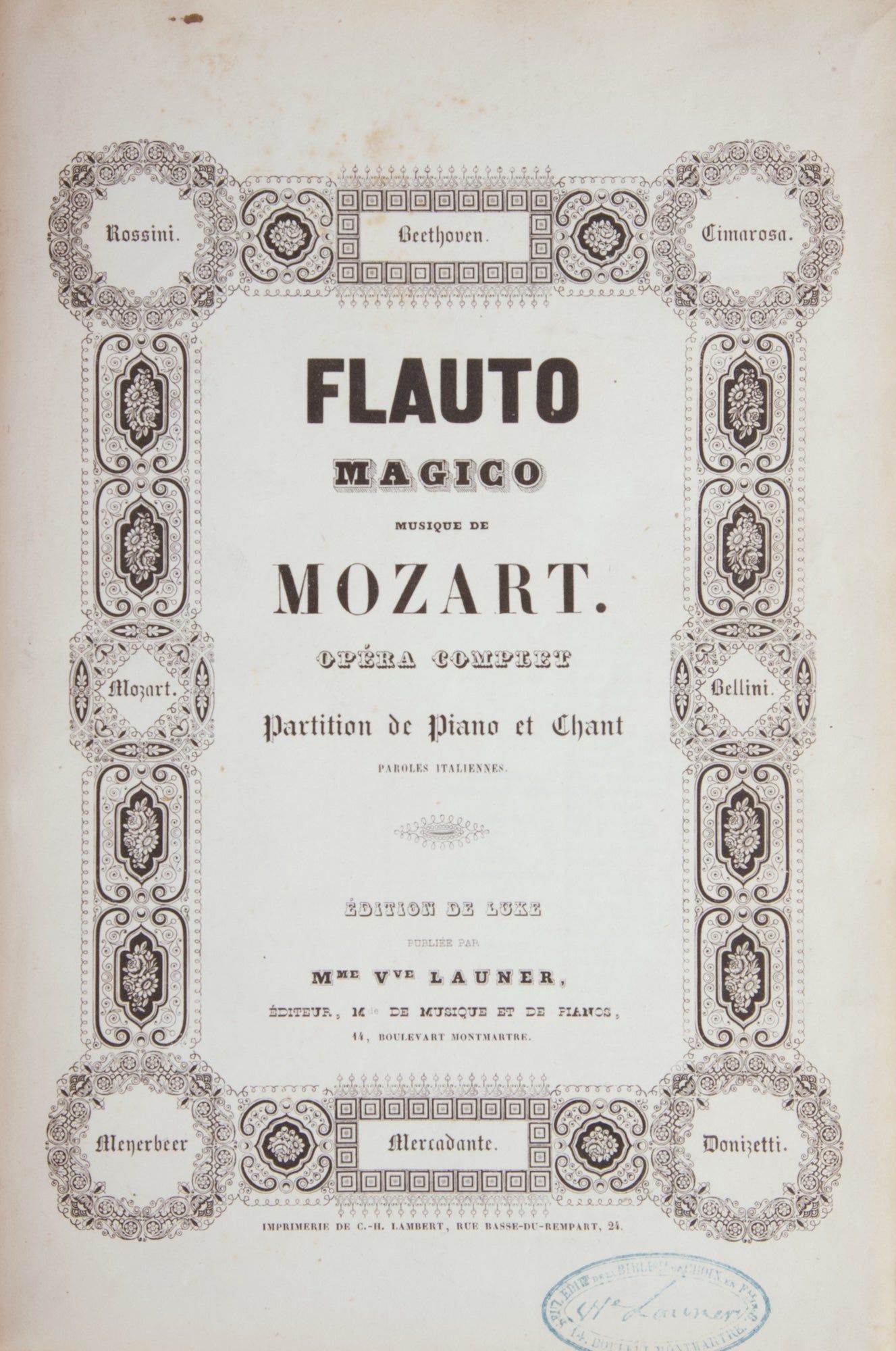 [Paris]: Mme. Ve Launer [PN Vve. L. 3282], 1841. Large octavo. Quarter dark green morocco with dark green boards, "C. C. P." gilt to upper board and titling gilt to spine. 1f. (recto title within decorative border, verso blank), 1f. (recto publisher's catalogue, verso cast list and incipits), 168 pp. Engraved.