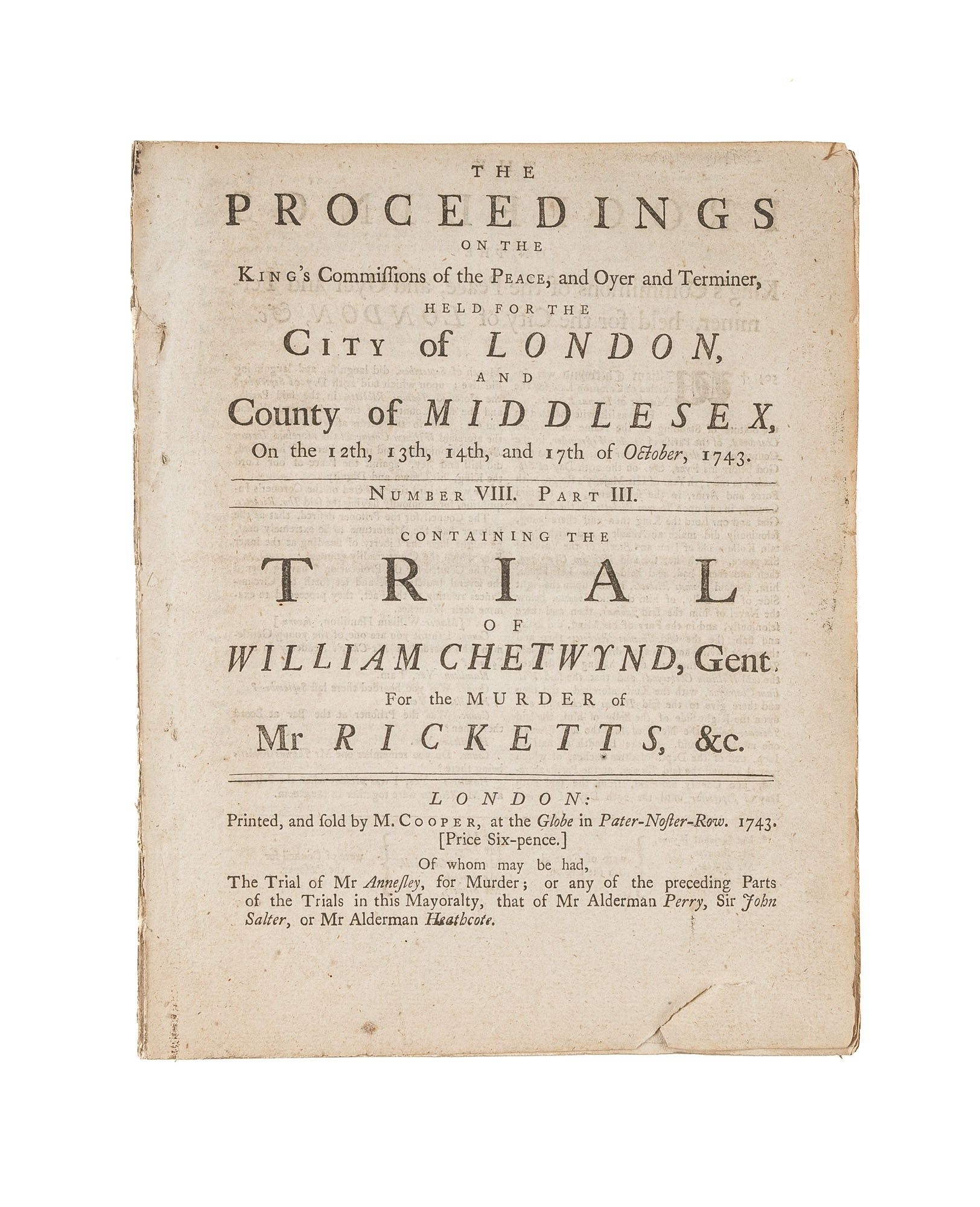 1743. London: Printed, and sold by M. Cooper, 1743.. London: Printed, and sold by M. Cooper, 1743. A Schoolyard Fight Turns Deadly [Trials]. [Great Britain]. Chetwynd, William, Defendant. The Proceedings on the King's Commissions of the Peace, And Oyer and Terminer, Held for the City of London, And County of Middlesex, On the 12th, 13th, 14th, And 17th of October, 1743. Number VIII. Part III. Containing the Trial of William Chetwynd, Gent. For the Murder of Mr Ricketts, &c. London: Printed, and sold by M. Cooper, 1743. [ii], 303-318, [2] pp. With a final advertisement leaf. Quarto (9" x 7"). Disbound stab-stitched pamphlet, leaves separating along spine. Moderate toning, light soiling to exterior, small clean tear to lower outside corner of first leaf, trimming to top-edge just touching page numbers of a few leaves. $100. * Only edition, issued both serially and as an individual item. Chetwynd, who was about fifteen years old, stabbed his schoolmate with his pocket knife when the other boy tried to take a piece of his cake. The trial hinged on whether this constituted murder or manslaughter under common law; the jury could not decide and referred the matter to the judges. Chetwynd was eventually convicted of manslaughter and burned on the hand. This account includes an appendix with summaries of six cases cited in the Chetwynd trial. English Short-Title Catalogue N22301.