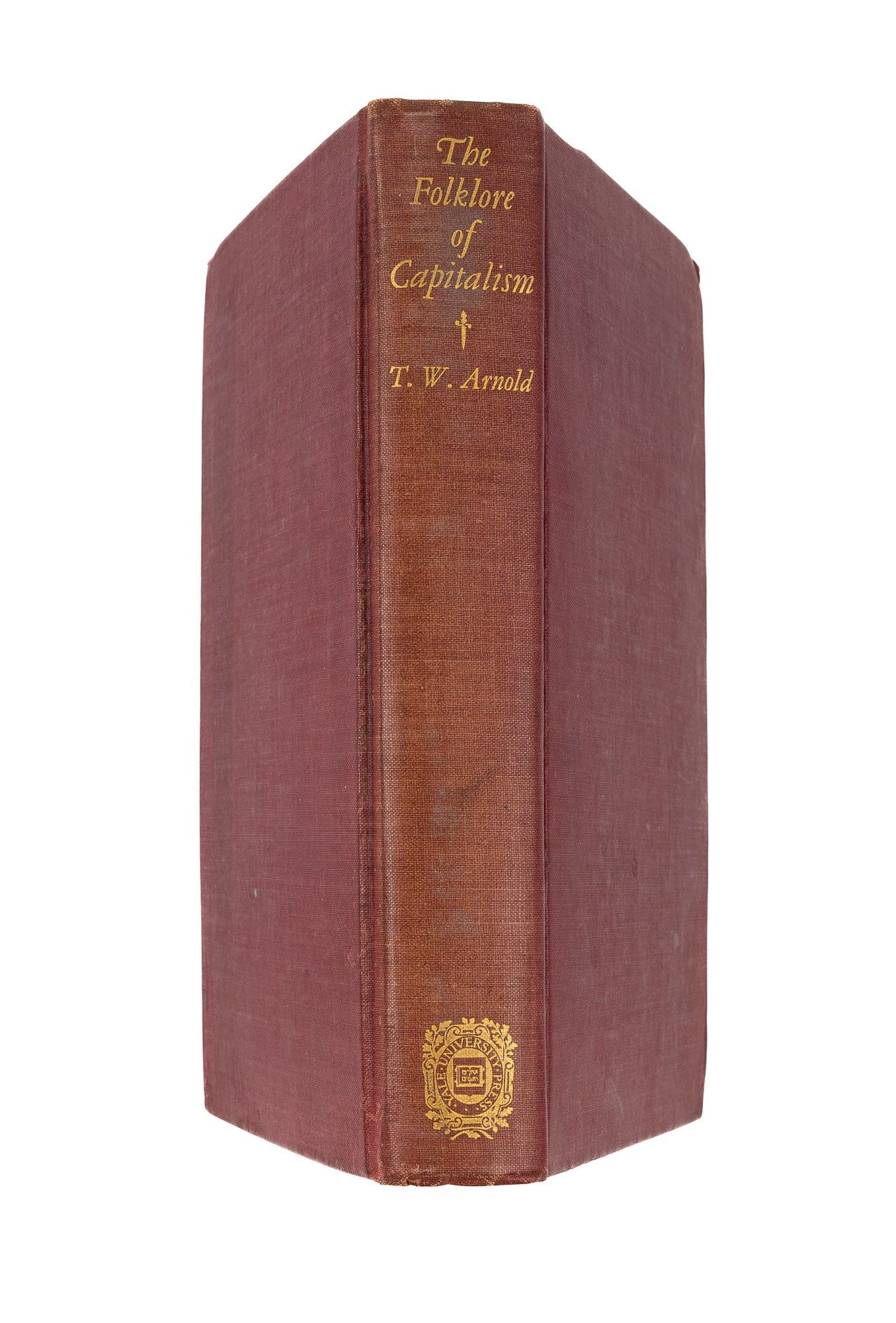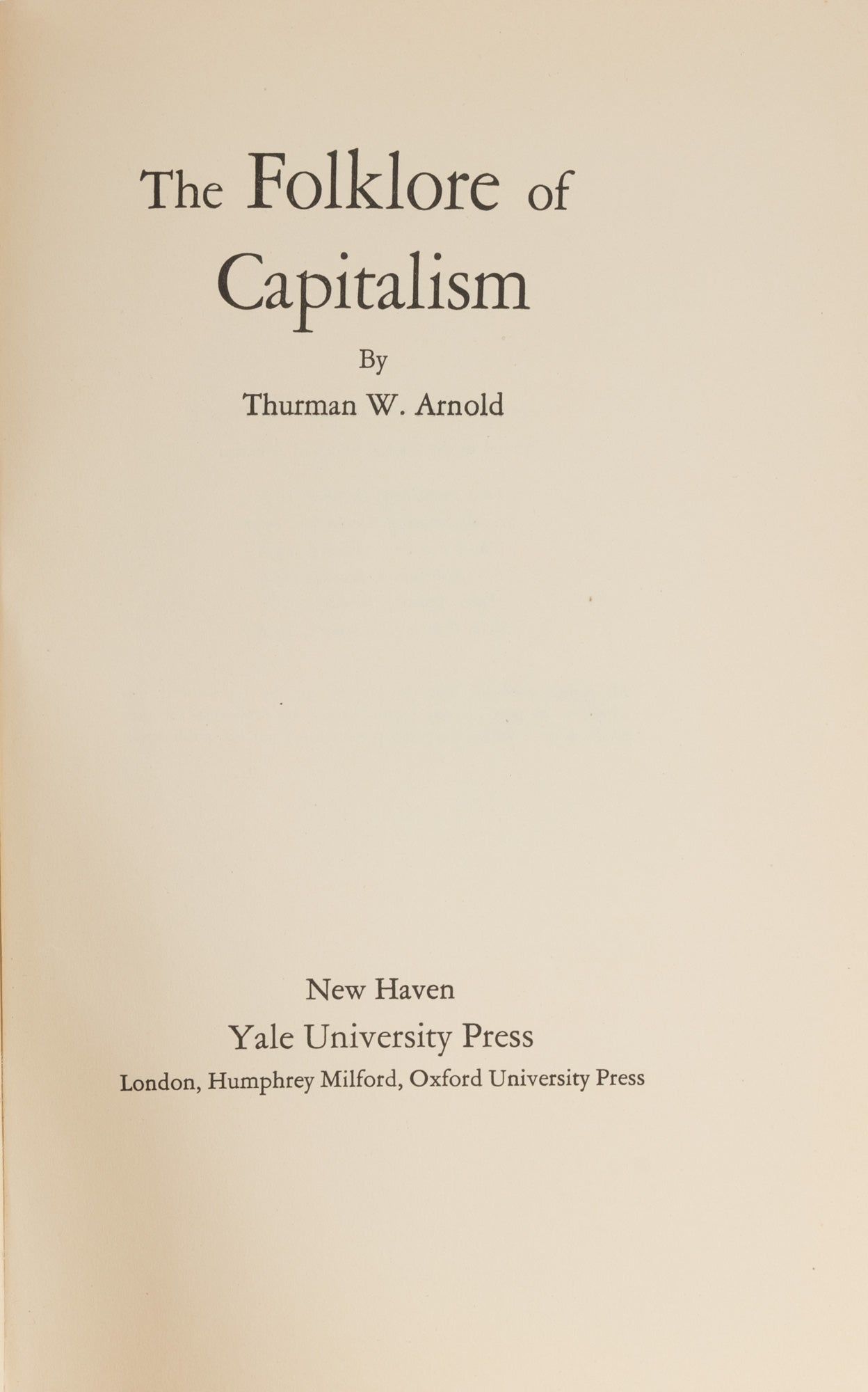 1938. New Haven: Yale University Press, 1938.. New Haven: Yale University Press, 1938. Arnold, Thurman W. The Folklore of Capitalism. New Haven: Yale University Press, 1938. vii, 400 pp. Original red cloth with gilt stamped spine. Moderate shelfwear. Binding slightly cocked and rubbed. Business card of "Robert Marvin Teets, Jr." to front free endpaper, otherwise clean. A good copy. $25. * A satirical and serious critique of the myths and symbolic rhetoric that sustained American capitalism in the 1930s, despite evidence of its failures during the Great Depression. Written by Thurman W. Arnold, a prominent lawyer and legal realist, the book argues that society often relies on emotionally-charged, "folkloric" ideas rather than facts to understand and defend its institutions. Arnold argues that laissez-faire capitalism was upheld as a sacred principle, even as industrial concentration and monopolies became a practical reality. He satirizes society for clinging to the myth of individual competition while allowing powerful corporations to dominate. The book analyzes the absurdity of treating corporations as legal persons with rights similar to individuals. Arnold highlights how this personification allowed large organizations to gain power and deflect criticism away from their actual control of the economy. Critique of antitrust laws: Arnold suggests that antitrust laws, rather than curbing monopolies, often served a ceremonial or symbolic purpose. By pursuing legal action against "bad" corporations, the government could create the illusion of fighting for competition, when in fact the laws did little to prevent further industrial concentration.