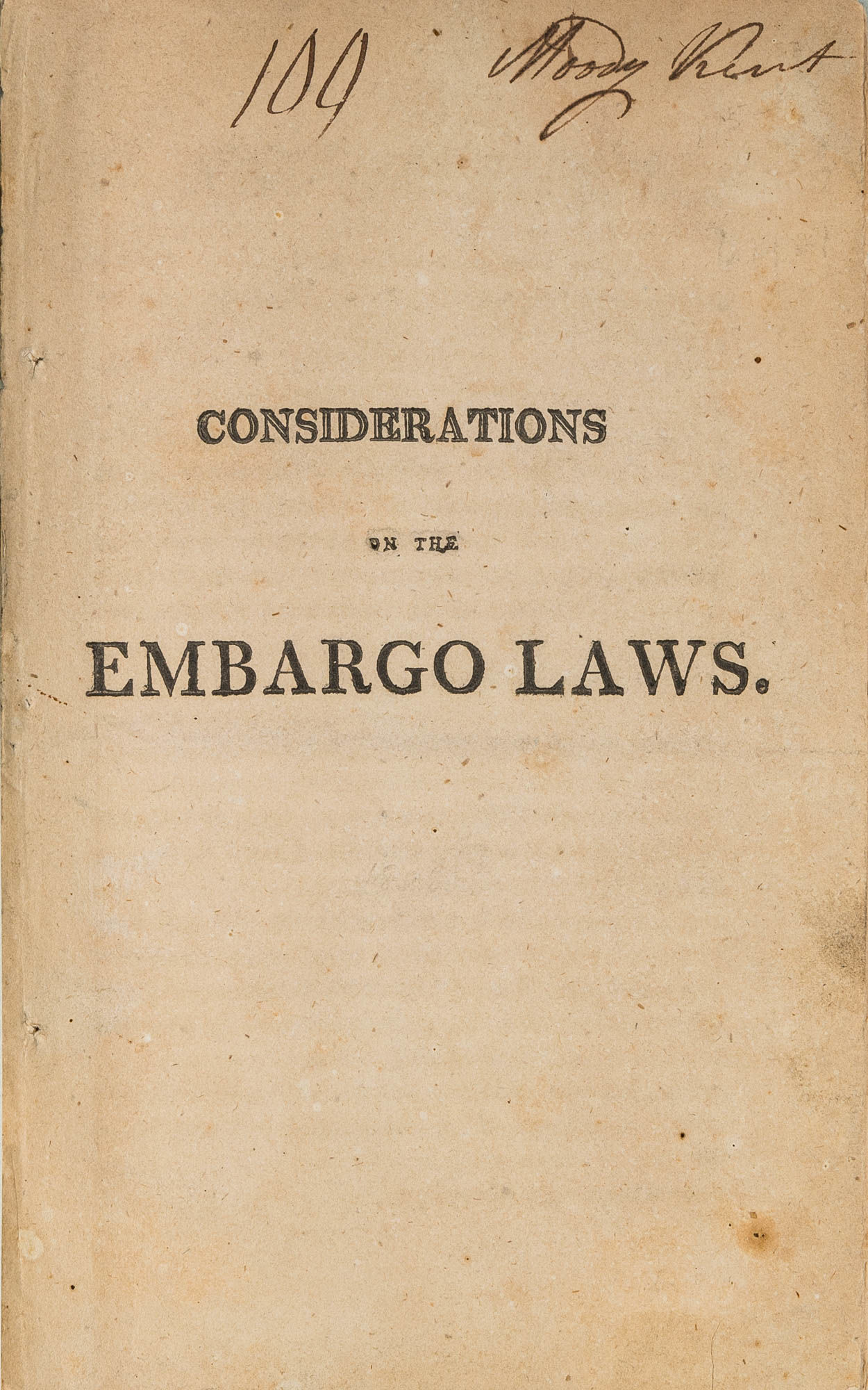 1808. A Copy of Daniel Webster's First Publication Owned by One of His Associates [Webster, Daniel (1782-1852)]. Considerations on the Embargo Laws. [Boston, 1808]. 16 pp. Octavo (9-3/4" x 5-3/4"). Stab-stitched pamphlet in recent plain wrappers. Moderate toning, light foxing to a few leaves, "109" and early owner signature of Moody Kent to head of title page. $750. * Only edition. This was Webster's first publication, written when he was 26. It expresses the opposition of New England Federalists to the Embargo Act of 1807, which prohibited American ships from trading in foreign ports. Devised by President Jefferson, this act was intended to punish Britain and France for interfering with American trade while those nations were at war with each other. It was deeply resented in New England and other states that depended on maritime trade. Webster argues that the embargo is unconstitutional because Congress only has the power to regulate commerce. It does not have the power to stop it. Moody Kent [1779-1866] was a successful lawyer and leading citizen who practiced in Deerfield and Concord, New Hampshire. A lifelong bachelor, he was a notable philanthropist who left a large part of his estate to the New Hampshire Asylum for the Insane. Kent, Webster and Webster's brother, Ezekiel, also a lawyer and politician, were professional and political associates. See Webster, The Writings and Speeches of Daniel Webster (1903) 16:25, 32, 33. Sabin, A Dictionary of Books Relating to America 102257. Cohen, Bibliography of Early American Law 7560.