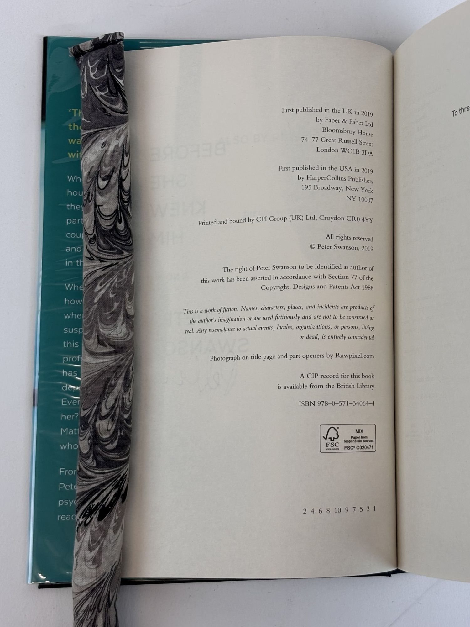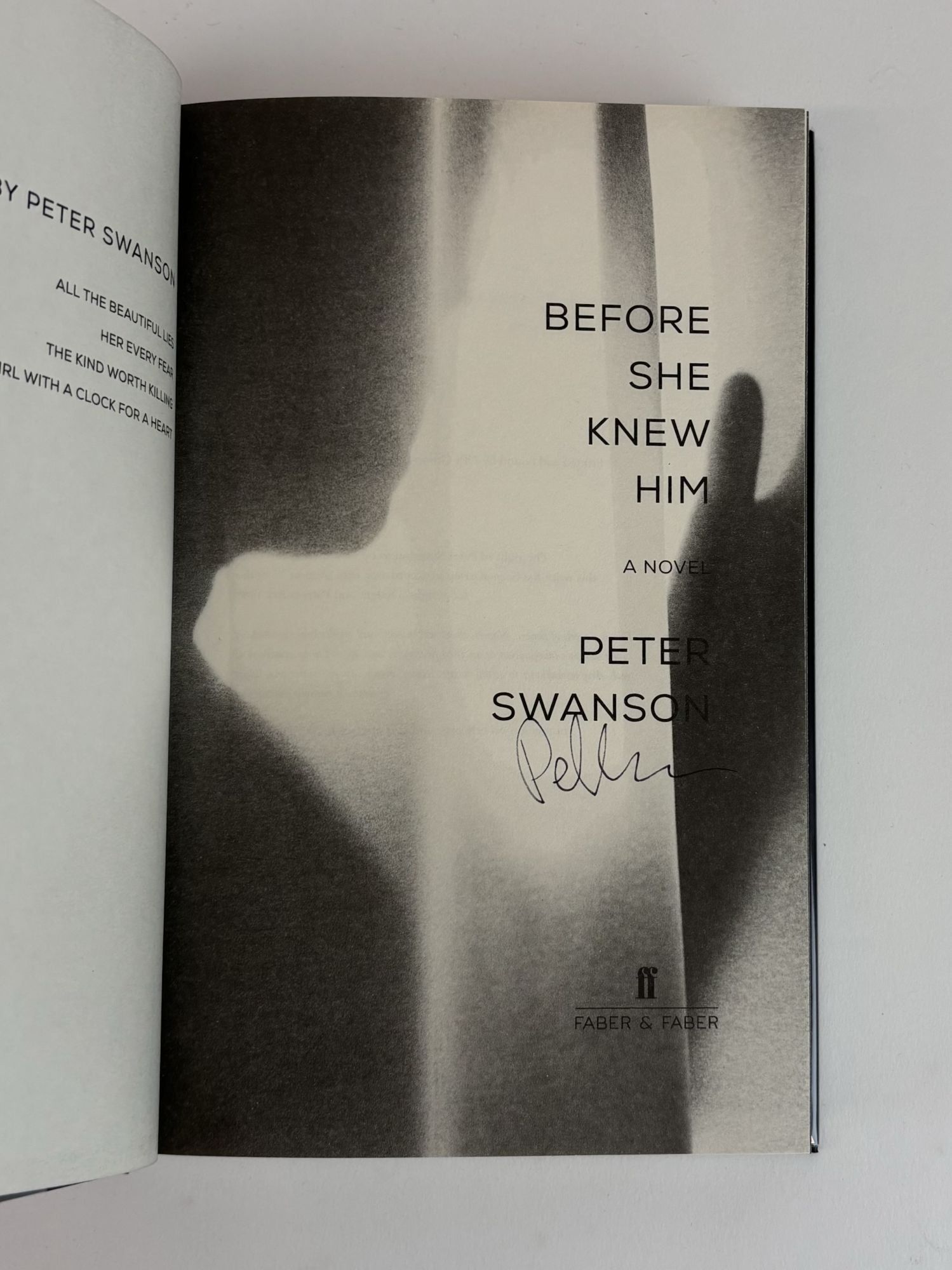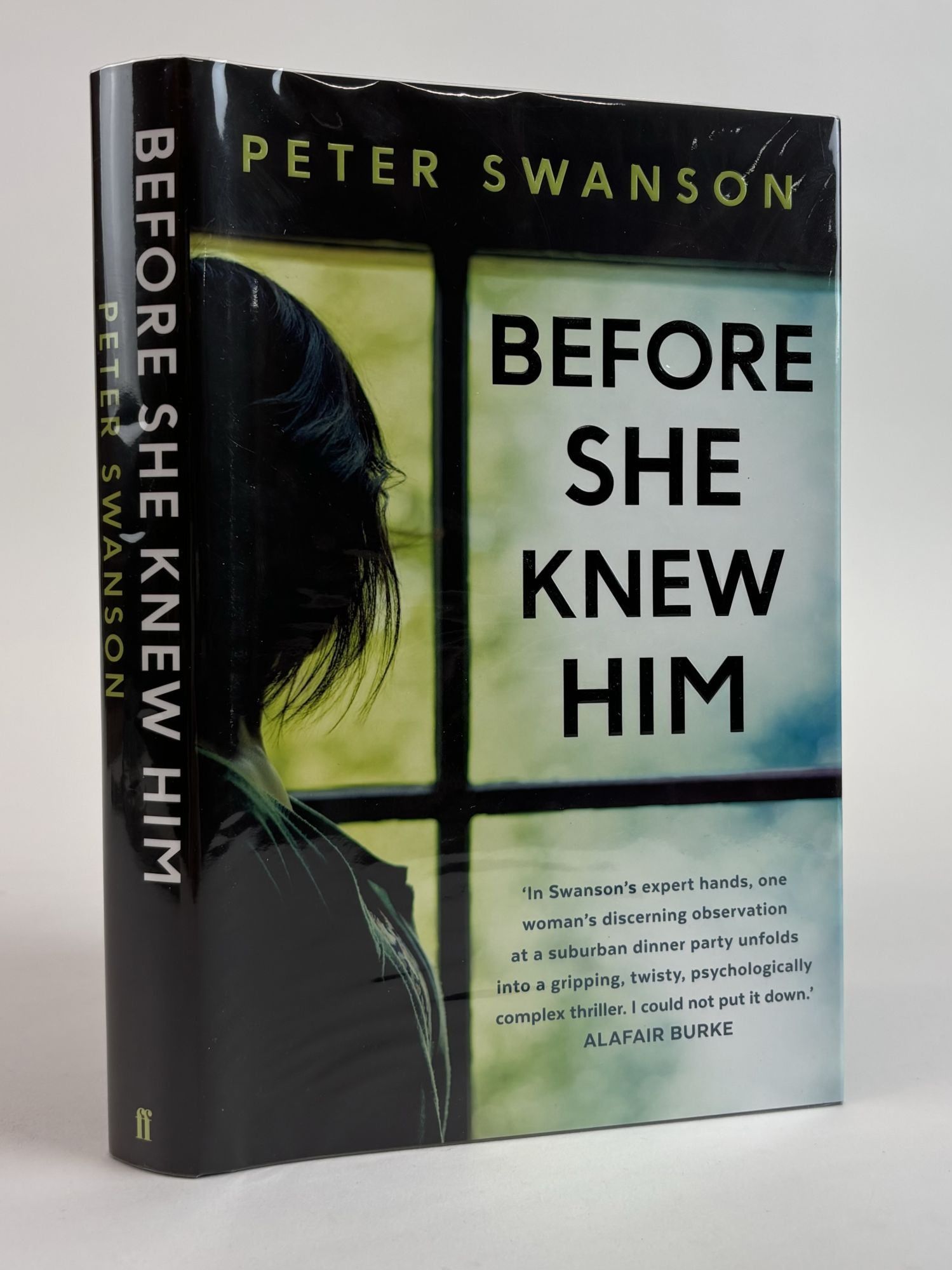 London, UK: Faber & Faber, 2019. First UK Edition, First Printing. Hardcover. Octavo, 309 pages. In Very Good condition with Near Fine condition dust jacket. Spine is black with green and white lettering. Dust jacket protected by mylar covering, price uncut: "£12.99" on front flap. Boards have mild shelving wear along extremities. Light waviness to text block. Signed flat by Peter Swanson on title page. Shelved in hallway. 1391819. Special Collections.